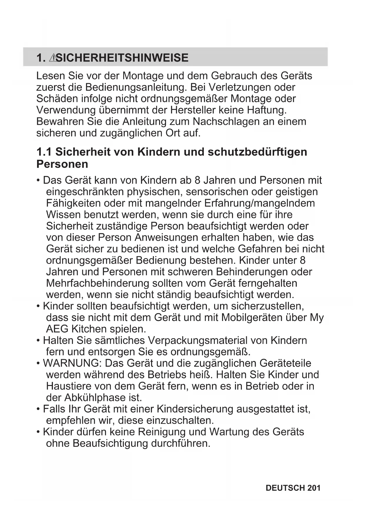 DEUTSCH 199My AEG Kitchen app 200 DEUTSCH1. SICHERHEITSHINWEISE Lesen Sie vor der Montage und dem Gebrauch des Geräts zuerst die Bedienungsanleitung. Bei Verletzungen oder Schäden infolge nicht ordnungsgemäßer Montage oder Verwendung übernimmt der Hersteller keine Haftung. Bewahren Sie die Anleitung zum Nachschlagen an einem sicheren und zugänglichen Ort auf.