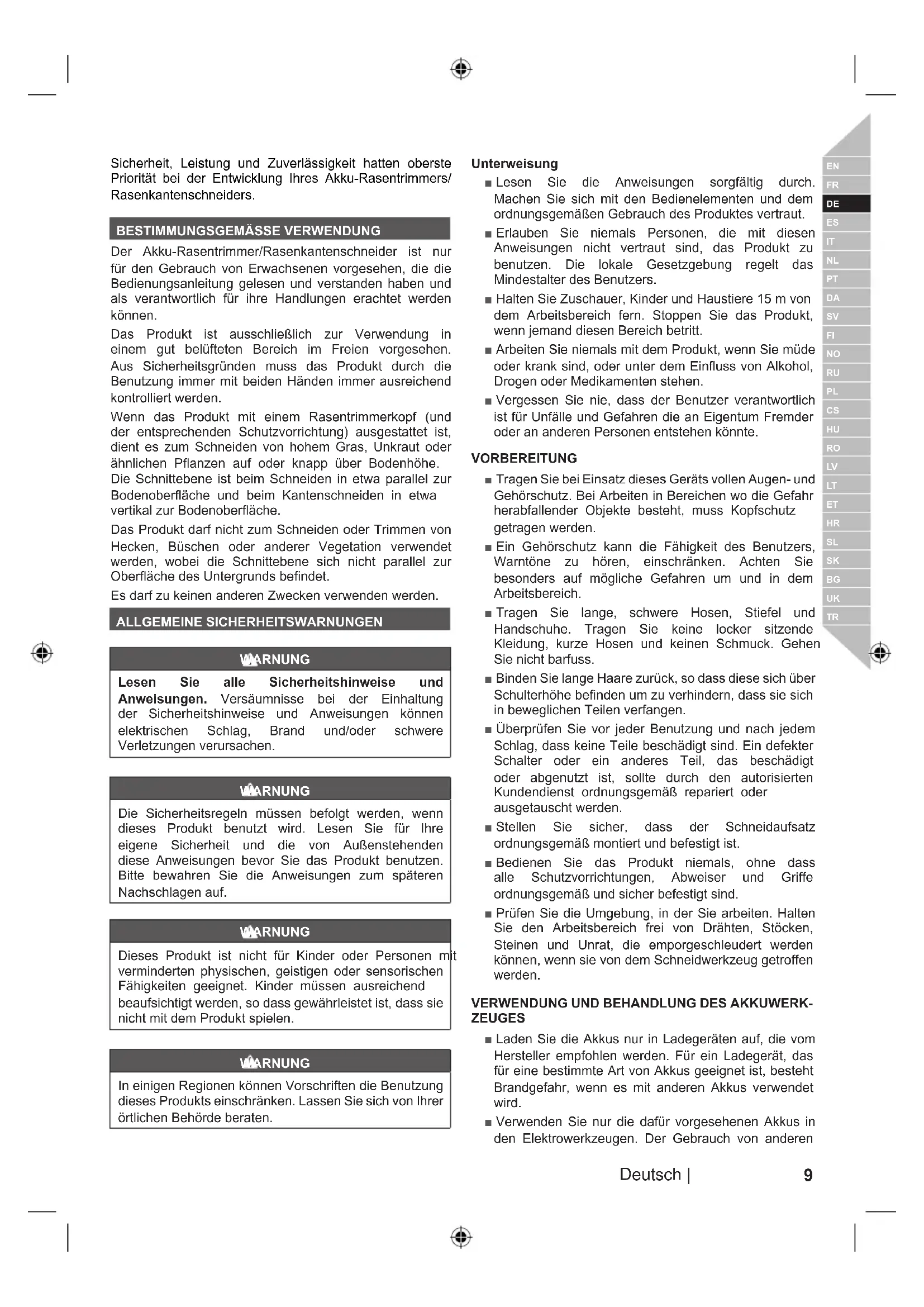 Der Akku-Rasentrimmer/Rasenkantenschneider ist nur für den Gebrauch von Erwachsenen vorgesehen, die die Bedienungsanleitung gelesen und verstanden haben und als verantwortlich für ihre Handlungen erachtet werden können. Das Produkt ist ausschließlich zur Verwendung in einem gut belüfteten Bereich im Freien vorgesehen. Aus Sicherheitsgründen muss das Produkt durch die Benutzung immer mit beiden Händen immer ausreichend kontrolliert werden. Wenn das Produkt mit einem Rasentrimmerkopf (und der entsprechenden Schutzvorrichtung) ausgestattet ist, dient es zum Schneiden von hohem Gras, Unkraut oder ähnlichen Panzen auf oder knapp über Bodenhöhe. Die Schnittebene ist beim Schneiden in etwa parallel zur Bodenoberäche und beim Kantenschneiden in etwa vertikal zur Bodenoberäche. Das Produkt darf nicht zum Schneiden oder Trimmen von Hecken, Büschen oder anderer Vegetation verwendet werden, wobei die Schnittebene sich nicht parallel zur Oberäche des Untergrunds bendet. Es darf zu keinen anderen Zwecken verwenden werden. ALLGEMEINE SICHERHEITSWARNUNGEN WARNUNG Lesen Sie alle Sicherheitshinweise und Anweisungen. Versäumnisse bei der Einhaltung der Sicherheitshinweise und Anweisungen können elektrischen Schlag, Brand und/oder schwere Verletzungen verursachen. WARNUNG Die Sicherheitsregeln müssen befolgt werden, wenn dieses Produkt benutzt wird. Lesen Sie für Ihre eigene Sicherheit und die von Außenstehenden diese Anweisungen bevor Sie das Produkt benutzen. Bitte bewahren Sie die Anweisungen zum späteren Nachschlagen auf. WARNUNG Dieses Produkt ist nicht für Kinder oder Personen mit verminderten physischen, geistigen oder sensorischen Fähigkeiten geeignet. Kinder müssen ausreichend beaufsichtigt werden, so dass gewährleistet ist, dass sie nicht mit dem Produkt spielen. WARNUNG In einigen Regionen können Vorschriften die Benutzung dieses Produkts einschränken. Lassen Sie sich von Ihrer örtlichen Behörde beraten. Unterweisung ■ Lesen Sie die Anweisungen sorgfältig durch. Machen Sie sich mit den Bedienelementen und dem ordnungsgemäßen Gebrauch des Produktes vertraut. ■ Erlauben Sie niemals Personen, die mit diesen Anweisungen nicht vertraut sind, das Produkt zu benutzen. Die lokale Gesetzgebung regelt das Mindestalter des Benutzers. ■ Halten Sie Zuschauer, Kinder und Haustiere 15 m von dem Arbeitsbereich fern. Stoppen Sie das Produkt, wenn jemand diesen Bereich betritt. ■ Arbeiten Sie niemals mit dem Produkt, wenn Sie müde oder krank sind, oder unter dem Einfluss von Alkohol, Drogen oder Medikamenten stehen. ■ Vergessen Sie nie, dass der Benutzer verantwortlich ist für Unfälle und Gefahren die an Eigentum Fremder oder an anderen Personen entstehen könnte. VORBEREITUNG ■ Tragen Sie bei Einsatz dieses Geräts vollen Augen- und Gehörschutz. Bei Arbeiten in Bereichen wo die Gefahr herabfallender Objekte besteht, muss Kopfschutz getragen werden. ■ Ein Gehörschutz kann die Fähigkeit des Benutzers, Warntöne zu hören, einschränken. Achten Sie besonders auf mögliche Gefahren um und in dem Arbeitsbereich. ■ Tragen Sie lange, schwere Hosen, Stiefel und Handschuhe. Tragen Sie keine locker sitzende Kleidung, kurze Hosen und keinen Schmuck. Gehen Sie nicht barfuss. ■ Binden Sie lange Haare zurück, so dass diese sich über Schulterhöhe befinden um zu verhindern, dass sie sich in beweglichen Teilen verfangen. ■ Überprüfen Sie vor jeder Benutzung und nach jedem Schlag, dass keine Teile beschädigt sind. Ein defekter Schalter oder ein anderes Teil, das beschädigt oder abgenutzt ist, sollte durch den autorisierten Kundendienst ordnungsgemäß repariert oder ausgetauscht werden. ■ Stellen Sie sicher, dass der Schneidaufsatz ordnungsgemäß montiert und befestigt ist. ■ Bedienen Sie das Produkt niemals, ohne dass alle Schutzvorrichtungen, Abweiser und Griffe ordnungsgemäß und sicher befestigt sind. ■ Prüfen Sie die Umgebung, in der Sie arbeiten. Halten Sie den Arbeitsbereich frei von Drähten, Stöcken, Steinen und Unrat, die emporgeschleudert werden können, wenn sie von dem Schneidwerkzeug getroffen werden.