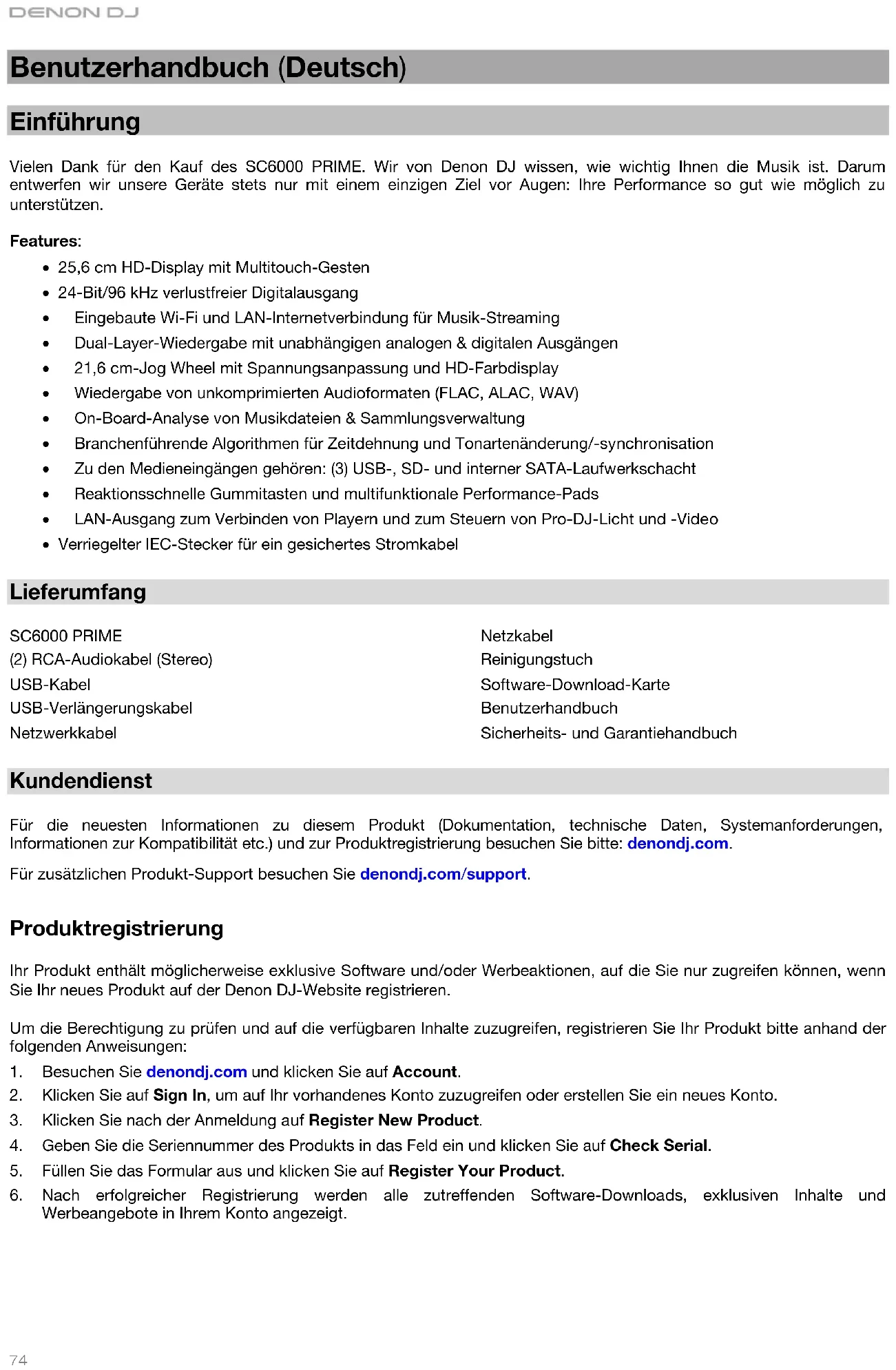 Wichtig: Mochlicherweise werden wir die Firmware für SC6000 PRIME gelegentlich aktualisieren, um nutzliche neue Funktionen und Verbesserungen hinzuzufugen. Besuchen Sie insbesondere nach einer Aktualisierung ihrer Software denondj.com/downloads, um zu sehen, ob Firmwareupdates verfügbar sind, (Firmwareupdates konnen neue Softwarefunktionen betreffen).