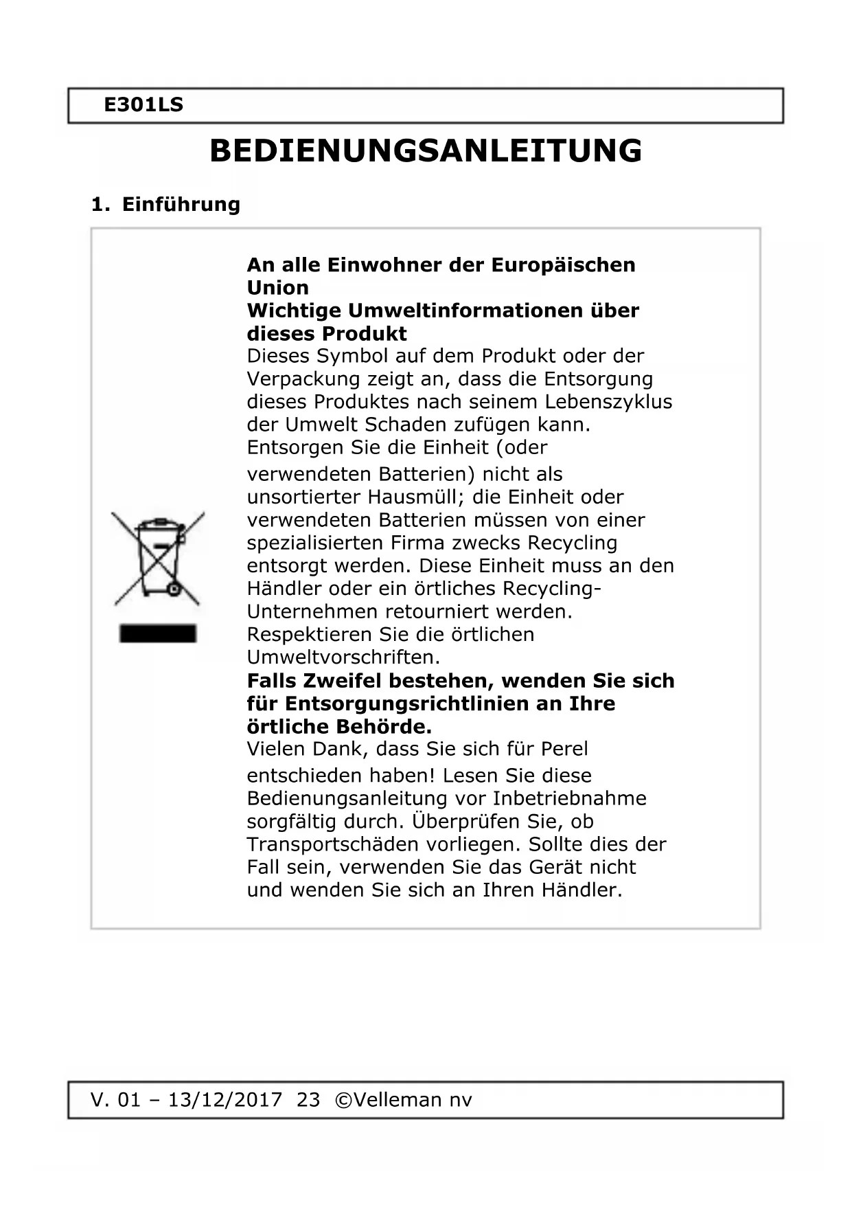 Verwenden Sie dieses Gerät nur mit originellen Zubehörteilen. Velleman NV übernimmt keine Haftung für Schaden oder Verletzungen bei (falscher) Anwendung dieses Gerätes. Für mehr Informationen zu diesem Produkt und die neueste Version dieser Bedienungsanleitung, siehe www.perel.eu. Alle Änderungen ohne vorherige Ankündigung vorbehalten. © URHEBERRECHT Velleman NV besitzt das Urheberrecht für diese Bedienungsanleitung. Alle weltweiten Rechte vorbehalten. Ohne vorherige schriftliche Genehmigung des Urhebers ist es nicht gestattet, diese Bedienungsanleitung ganz oder in Teilen zu reproduzieren, zu kopieren, zu übersetzen, zu bearbeiten oder zu speichern.E301LS