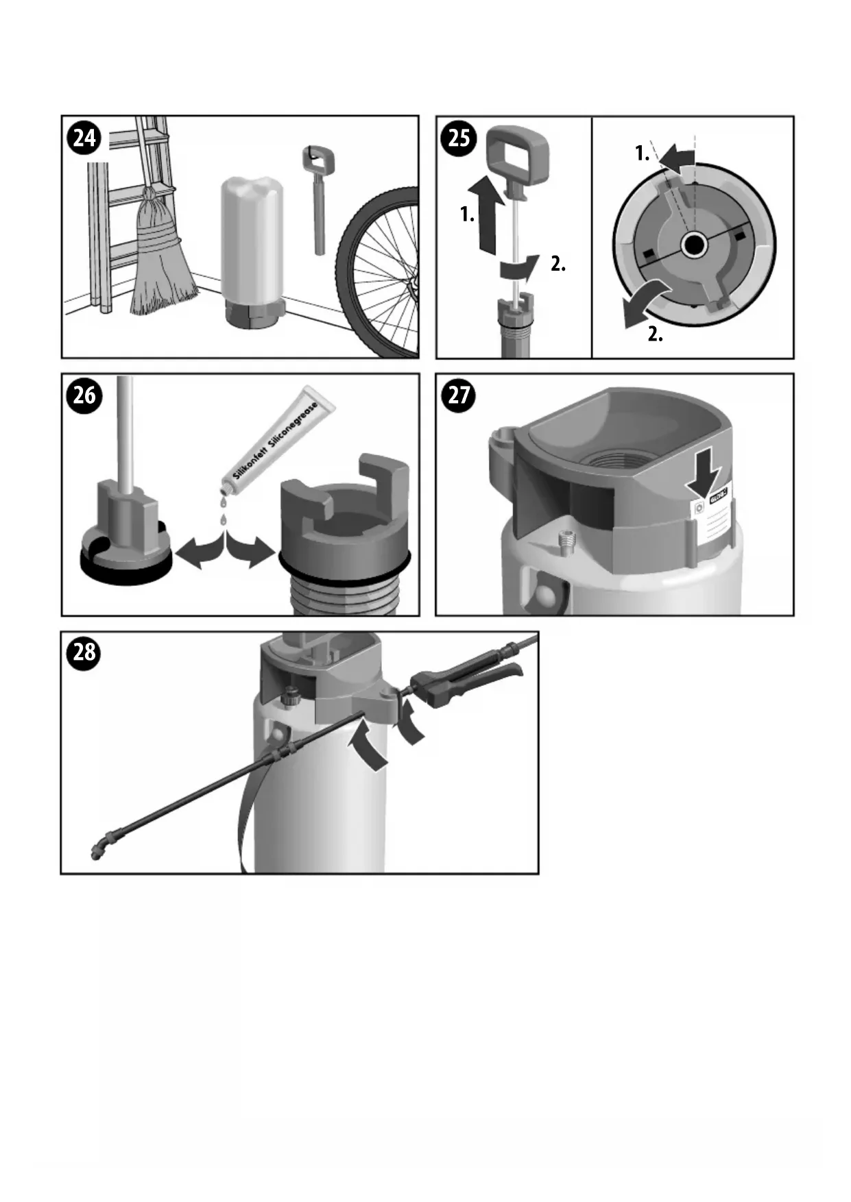 Die Pumpe nun vorsichtig, zunächst nur einige Gewindegänge gegen den Uhrzeigersinn los- schrauben, damit evtl. im Behälter verbliebene Druckluft entweichen kann. Erst jetzt Pumpe ganz herausschrauben und entnehmen.