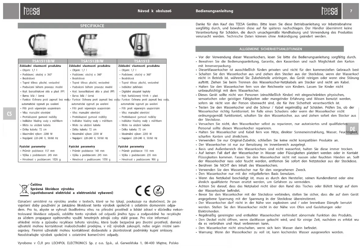 TSA1513 - Wasserkocher Teesa - Kostenlose Bedienungsanleitung