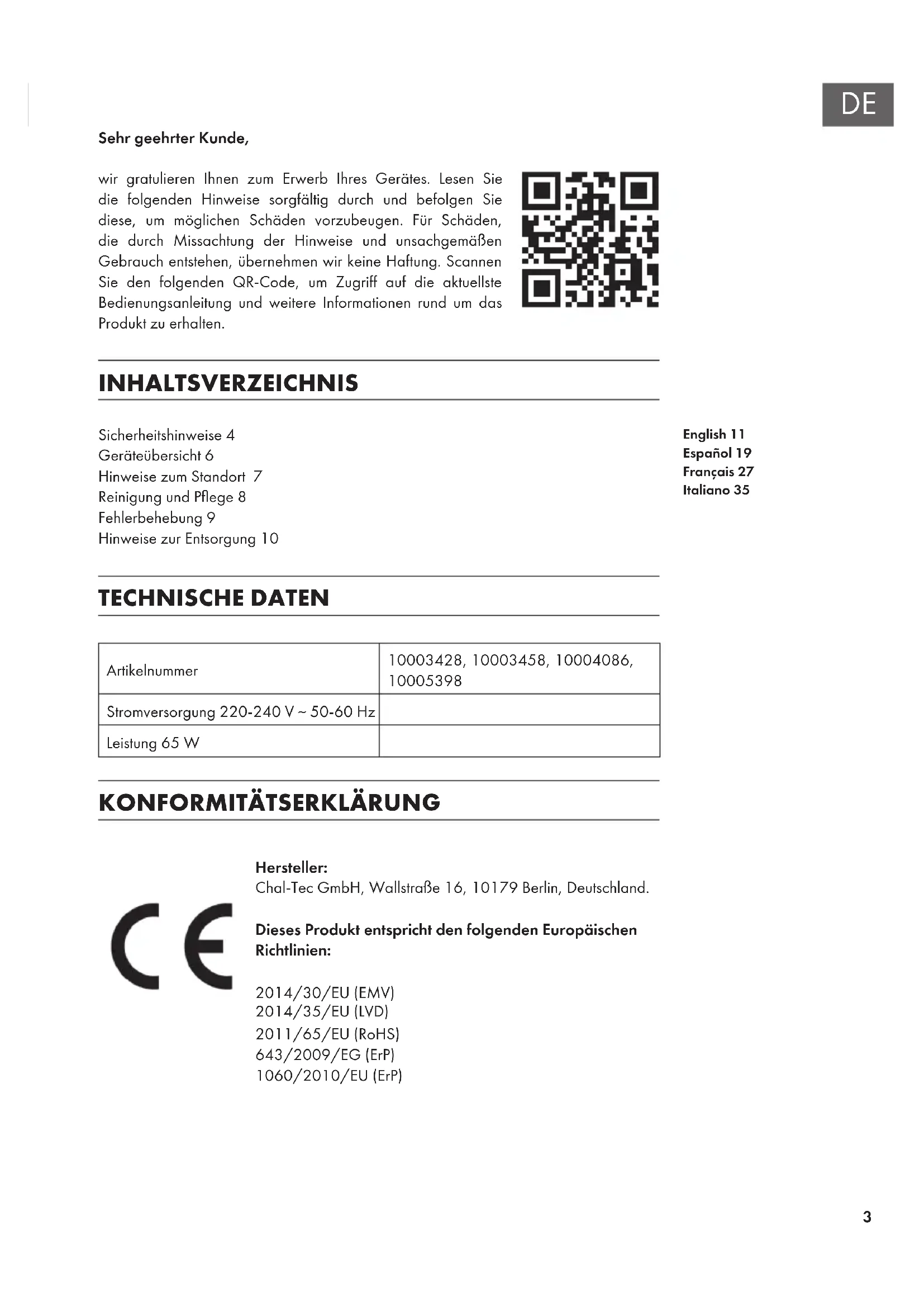 Hersteller: Chal-Tec GmbH, Wallstraße 16, 10179 Berlin, Deutschland. Dieses Produkt entspricht den folgenden Europäischen Richtlinien: 2014/30/EU (EMV) 2014/35/EU (LVD) 2011/65/EU (RoHS) 643/2009/EG (ErP) 1060/2010/EU (ErP) English 11 Español 19 Français 27 Italiano 354