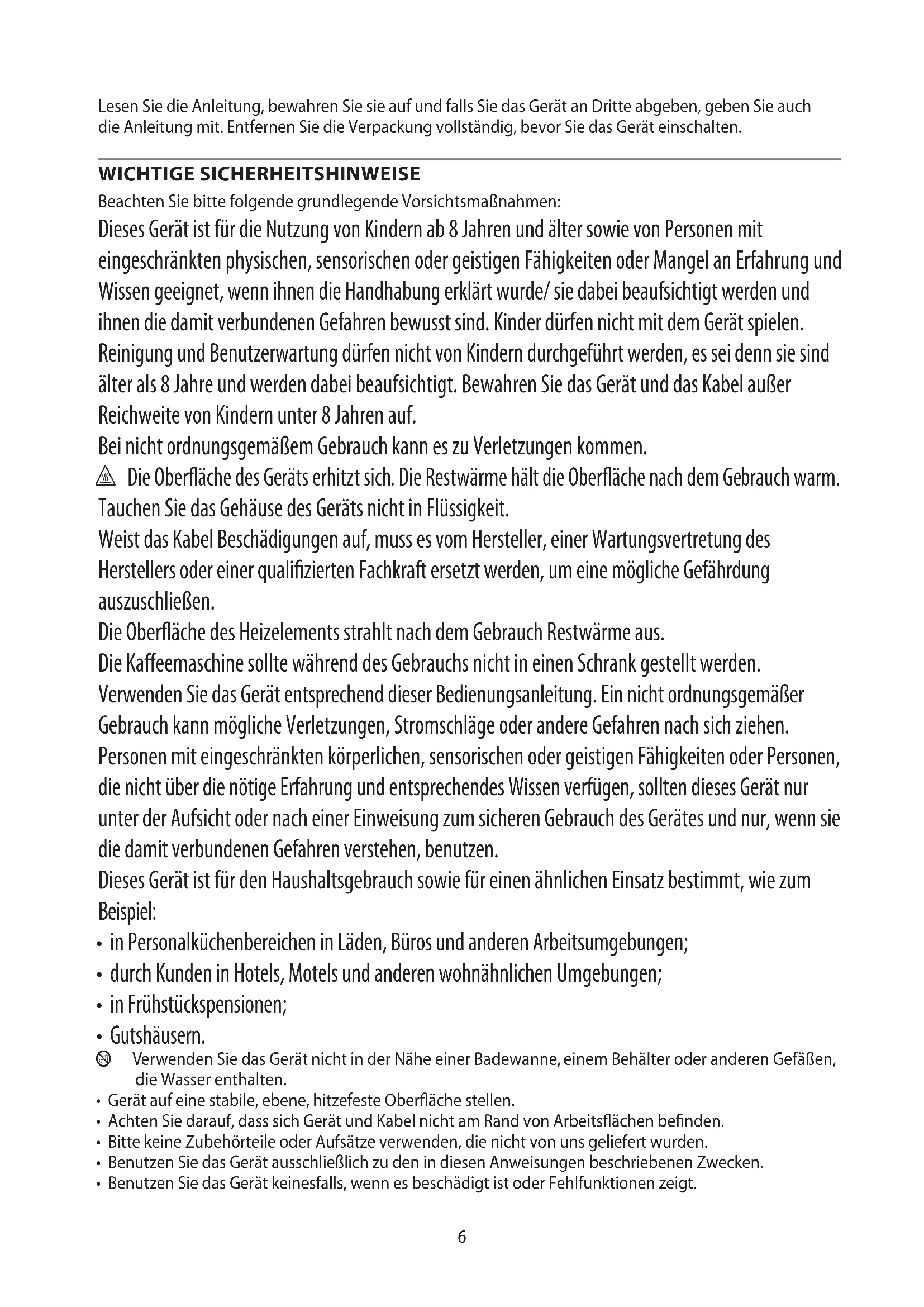 AE6 Lesen Sie die Anleitung, bewahren Sie sie auf und falls Sie das Gerät an Dritte abgeben, geben Sie auch die Anleitung mit. Entfernen Sie die Verpackung vollständig, bevor Sie das Gerät einschalten. WICHTIGE SICHERHEITSHINWEISE Beachten Sie bitte folgende grundlegende Vorsichtsmaßnahmen: Dieses Gerät ist für die Nutzung von Kindern ab 8 Jahren und älter sowie von Personen mit eingeschränkten physischen, sensorischen oder geistigen Fähigkeiten oder Mangel an Erfahrung und Wissen geeignet, wenn ihnen die Handhabung erklärt wurde/ sie dabei beaufsichtigt werden und ihnen die damit verbundenen Gefahren bewusst sind. Kinder dürfen nicht mit dem Gerät spielen. Reinigung und Benutzerwartung dürfen nicht von Kindern durchgeführt werden, es sei denn sie sind älter als 8 Jahre und werden dabei beaufsichtigt. Bewahren Sie das Gerät und das Kabel außer Reichweite von Kindern unter 8 Jahren auf. Bei nicht ordnungsgemäßem Gebrauch kann es zu Verletzungen kommen. h Die Oberäche des Geräts erhitzt sich. Die Restwärme hält die Oberäche nach dem Gebrauch warm. Tauchen Sie das Gehäuse des Geräts nicht in Flüssigkeit. Weist das Kabel Beschädigungen auf, muss es vom Hersteller, einer Wartungsvertretung des Herstellers oder einer qualizierten Fachkraft ersetzt werden, um eine mögliche Gefährdung auszuschließen. Die Oberäche des Heizelements strahlt nach dem Gebrauch Restwärme aus. Die Kaeemaschine sollte während des Gebrauchs nicht in einen Schrank gestellt werden. Verwenden Sie das Gerät entsprechend dieser Bedienungsanleitung. Ein nicht ordnungsgemäßer Gebrauch kann mögliche Verletzungen, Stromschläge oder andere Gefahren nach sich ziehen. Personen mit eingeschränkten körperlichen, sensorischen oder geistigen Fähigkeiten oder Personen, die nicht über die nötige Erfahrung und entsprechendes Wissen verfügen, sollten dieses Gerät nur unter der Aufsicht oder nach einer Einweisung zum sicheren Gebrauch des Gerätes und nur, wenn sie die damit verbundenen Gefahren verstehen, benutzen. Dieses Gerät ist für den Haushaltsgebrauch sowie für einen ähnlichen Einsatz bestimmt, wie zum Beispiel: