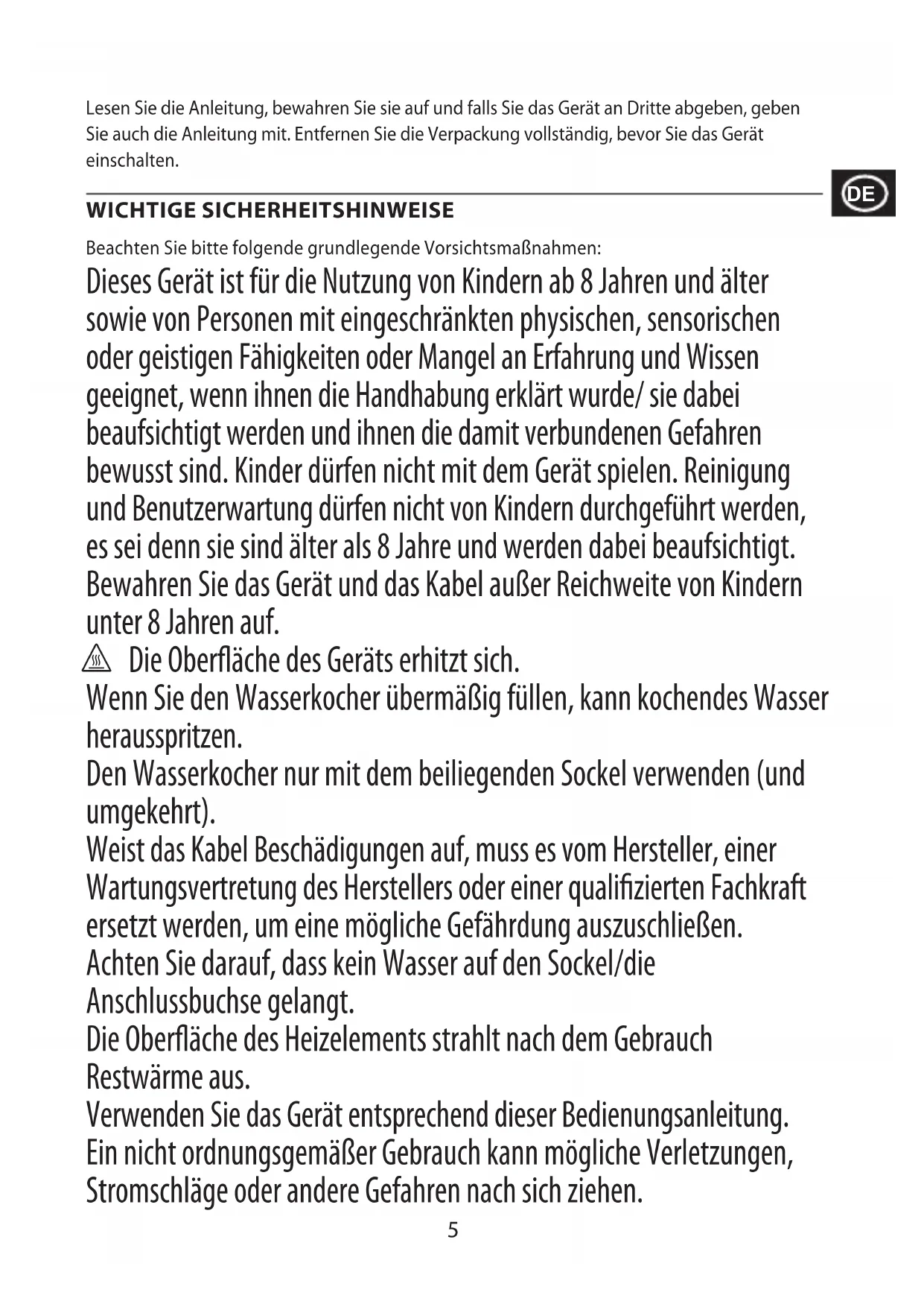 To avoid environmental and health problems due to hazardous substances, appliances and rechargeable and non-rechargeable batteries marked with one of these symbols must not be disposed of with unsorted municipal waste. Always dispose of electrical and electronic products and, where applicable, rechargeable and non-rechargeable batteries, at an appropriate ocial recycling/collection point.5 Lesen Sie die Anleitung, bewahren Sie sie auf und falls Sie das Gerät an Dritte abgeben, geben Sie auch die Anleitung mit. Entfernen Sie die Verpackung vollständig, bevor Sie das Gerät einschalten. WICHTIGE SICHERHEITSHINWEISE Beachten Sie bitte folgende grundlegende Vorsichtsmaßnahmen: Dieses Gerät ist für die Nutzung von Kindern ab 8 Jahren und älter sowie von Personen mit eingeschränkten physischen, sensorischen oder geistigen Fähigkeiten oder Mangel an Erfahrung und Wissen geeignet, wenn ihnen die Handhabung erklärt wurde/ sie dabei beaufsichtigt werden und ihnen die damit verbundenen Gefahren bewusst sind. Kinder dürfen nicht mit dem Gerät spielen. Reinigung und Benutzerwartung dürfen nicht von Kindern durchgeführt werden, es sei denn sie sind älter als 8 Jahre und werden dabei beaufsichtigt. Bewahren Sie das Gerät und das Kabel außer Reichweite von Kindern unter 8 Jahren auf. h Die Oberäche des Geräts erhitzt sich. Wenn Sie den Wasserkocher übermäßig füllen, kann kochendes Wasser herausspritzen. Den Wasserkocher nur mit dem beiliegenden Sockel verwenden (und umgekehrt). Weist das Kabel Beschädigungen auf, muss es vom Hersteller, einer Wartungsvertretung des Herstellers oder einer qualizierten Fachkraft ersetzt werden, um eine mögliche Gefährdung auszuschließen. Achten Sie darauf, dass kein Wasser auf den Sockel/die Anschlussbuchse gelangt. Die Oberäche des Heizelements strahlt nach dem Gebrauch Restwärme aus. Verwenden Sie das Gerät entsprechend dieser Bedienungsanleitung. Ein nicht ordnungsgemäßer Gebrauch kann mögliche Verletzungen, Stromschläge oder andere Gefahren nach sich ziehen.