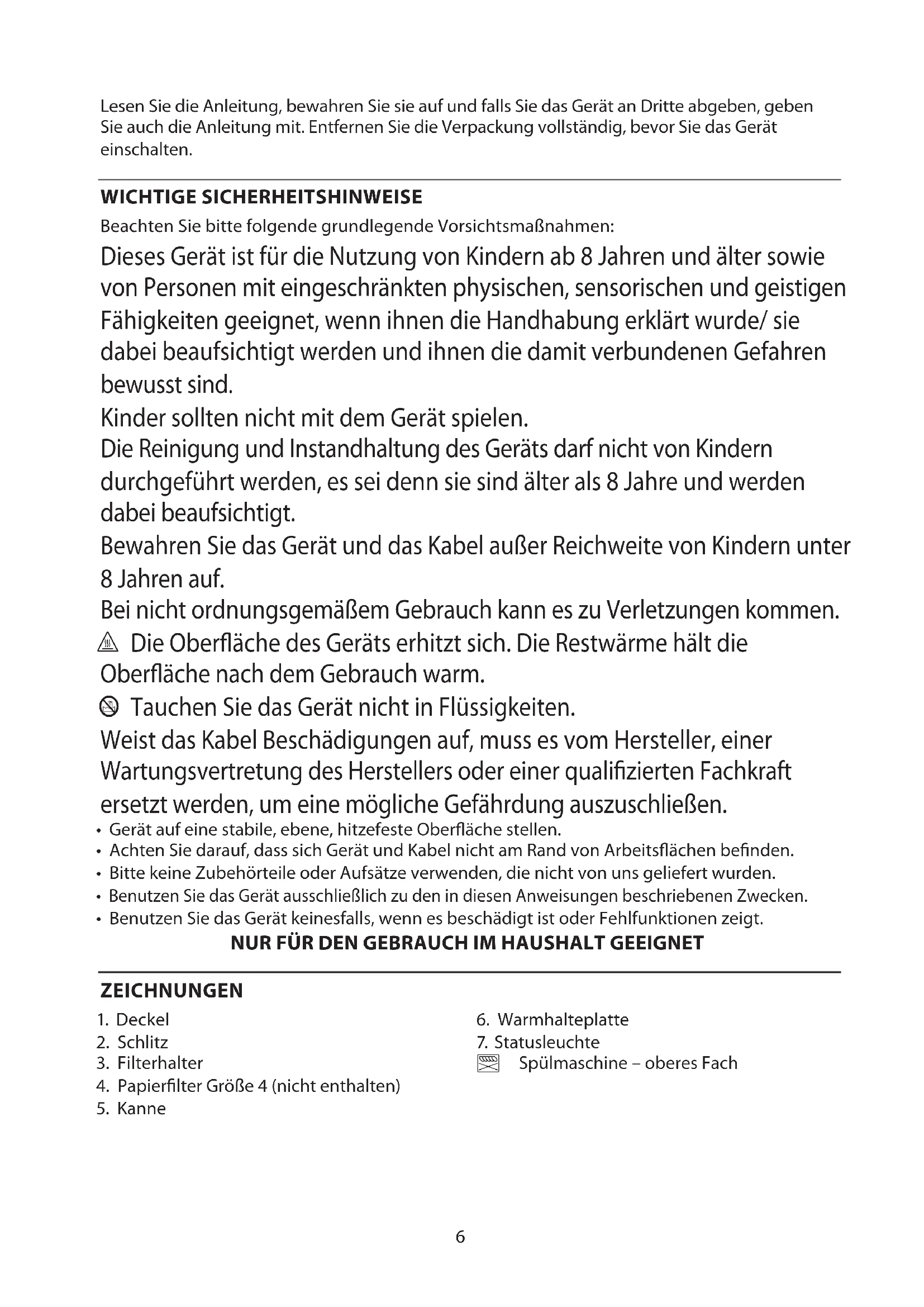 AE6 Lesen Sie die Anleitung, bewahren Sie sie auf und falls Sie das Gerät an Dritte abgeben, geben Sie auch die Anleitung mit. Entfernen Sie die Verpackung vollständig, bevor Sie das Gerät einschalten. WICHTIGE SICHERHEITSHINWEISE Beachten Sie bitte folgende grundlegende Vorsichtsmaßnahmen: Dieses Gerät ist für die Nutzung von Kindern ab 8 Jahren und älter sowie von Personen mit eingeschränkten physischen, sensorischen und geistigen Fähigkeiten geeignet, wenn ihnen die Handhabung erklärt wurde/ sie dabei beaufsichtigt werden und ihnen die damit verbundenen Gefahren bewusst sind. Kinder sollten nicht mit dem Gerät spielen. Die Reinigung und Instandhaltung des Geräts darf nicht von Kindern durchgeführt werden, es sei denn sie sind älter als 8 Jahre und werden dabei beaufsichtigt. Bewahren Sie das Gerät und das Kabel außer Reichweite von Kindern unter 8 Jahren auf. Bei nicht ordnungsgemäßem Gebrauch kann es zu Verletzungen kommen. h Die Oberäche des Geräts erhitzt sich. Die Restwärme hält die Oberäche nach dem Gebrauch warm. l Tauchen Sie das Gerät nicht in Flüssigkeiten. Weist das Kabel Beschädigungen auf, muss es vom Hersteller, einer Wartungsvertretung des Herstellers oder einer qualizierten Fachkraft ersetzt werden, um eine mögliche Gefährdung auszuschließen.