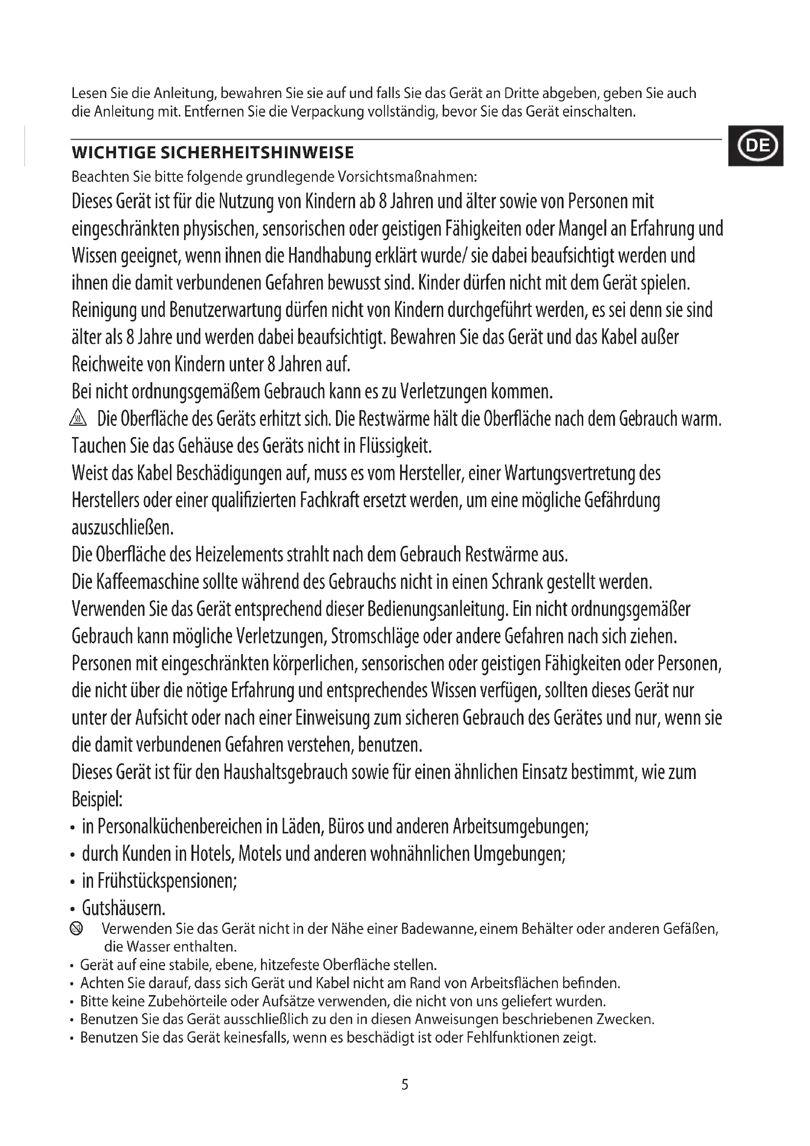 To avoid environmental and health problems due to hazardous substances, appliances and rechargeable and non-rechargeable batteries marked with one of these symbols must not be disposed of with unsorted municipal waste. Always dispose of electrical and electronic products and, where applicable, rechargeable and non-rechargeable batteries, at an appropriate ocial recycling/collection point.5 Lesen Sie die Anleitung, bewahren Sie sie auf und falls Sie das Gerät an Dritte abgeben, geben Sie auch die Anleitung mit. Entfernen Sie die Verpackung vollständig, bevor Sie das Gerät einschalten. WICHTIGE SICHERHEITSHINWEISE Beachten Sie bitte folgende grundlegende Vorsichtsmaßnahmen: Dieses Gerät ist für die Nutzung von Kindern ab 8 Jahren und älter sowie von Personen mit eingeschränkten physischen, sensorischen oder geistigen Fähigkeiten oder Mangel an Erfahrung und Wissen geeignet, wenn ihnen die Handhabung erklärt wurde/ sie dabei beaufsichtigt werden und ihnen die damit verbundenen Gefahren bewusst sind. Kinder dürfen nicht mit dem Gerät spielen. Reinigung und Benutzerwartung dürfen nicht von Kindern durchgeführt werden, es sei denn sie sind älter als 8 Jahre und werden dabei beaufsichtigt. Bewahren Sie das Gerät und das Kabel außer Reichweite von Kindern unter 8 Jahren auf. Bei nicht ordnungsgemäßem Gebrauch kann es zu Verletzungen kommen. h Die Oberäche des Geräts erhitzt sich. Die Restwärme hält die Oberäche nach dem Gebrauch warm. Tauchen Sie das Gehäuse des Geräts nicht in Flüssigkeit. Weist das Kabel Beschädigungen auf, muss es vom Hersteller, einer Wartungsvertretung des Herstellers oder einer qualizierten Fachkraft ersetzt werden, um eine mögliche Gefährdung auszuschließen. Die Oberäche des Heizelements strahlt nach dem Gebrauch Restwärme aus. Die Kaeemaschine sollte während des Gebrauchs nicht in einen Schrank gestellt werden. Verwenden Sie das Gerät entsprechend dieser Bedienungsanleitung. Ein nicht ordnungsgemäßer Gebrauch kann mögliche Verletzungen, Stromschläge oder andere Gefahren nach sich ziehen. Personen mit eingeschränkten körperlichen, sensorischen oder geistigen Fähigkeiten oder Personen, die nicht über die nötige Erfahrung und entsprechendes Wissen verfügen, sollten dieses Gerät nur unter der Aufsicht oder nach einer Einweisung zum sicheren Gebrauch des Gerätes und nur, wenn sie die damit verbundenen Gefahren verstehen, benutzen. Dieses Gerät ist für den Haushaltsgebrauch sowie für einen ähnlichen Einsatz bestimmt, wie zum Beispiel: