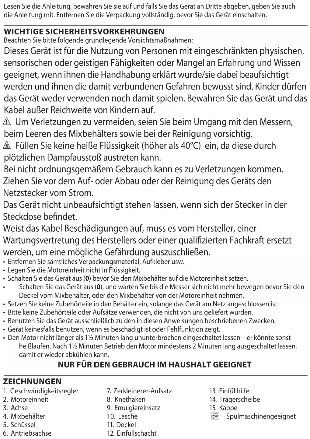 - Den Motor nicht länger als 1½ Minuten lang ununterbrochen eingeschaltet lassen – er könnte sonst heißlaufen. Nach 1½ Minuten Betrieb den Motor mindestens 2 Minuten lang ausgeschaltet lassen, damit er wieder abkühlen kann. NUR FÜR DEN GEBRAUCH IM HAUSHALT GEEIGNET ZEICHNUNGEN