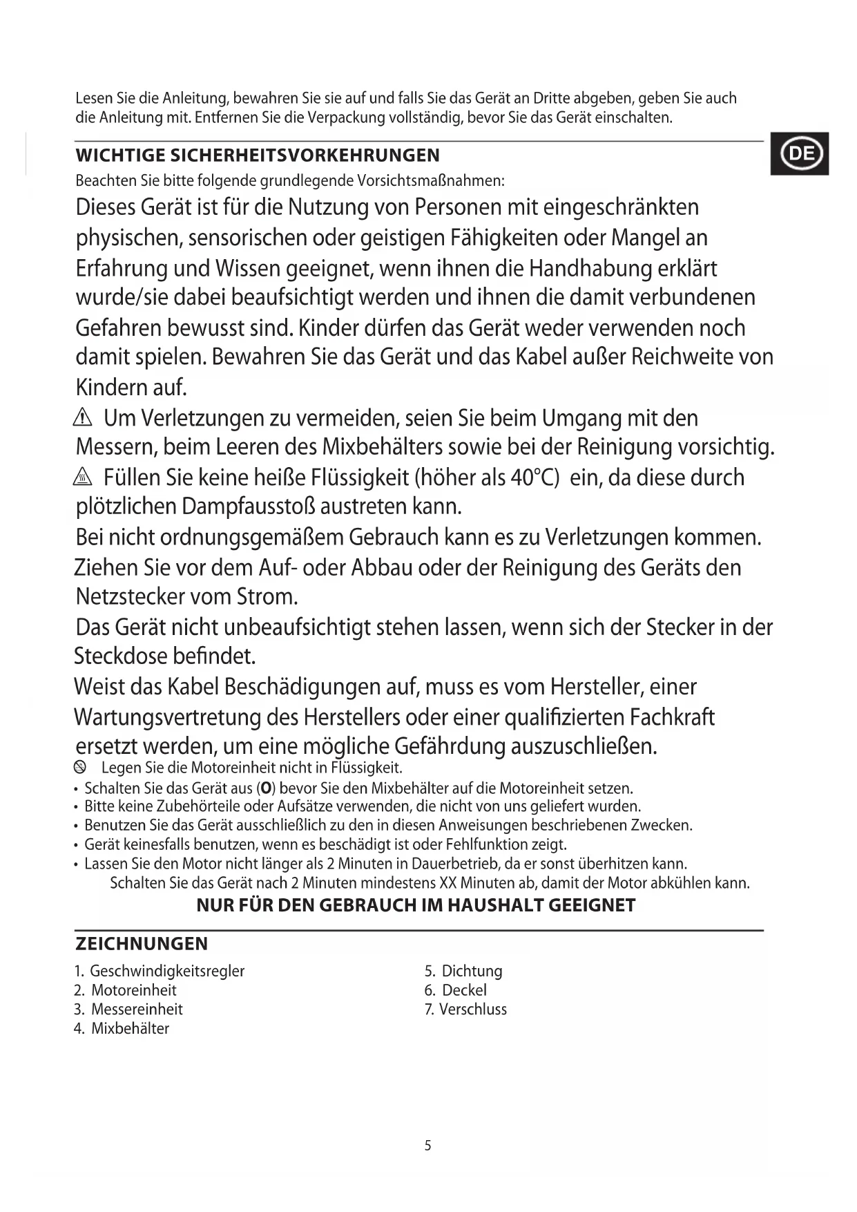 Lesen Sie die Anleitung, bewahren Sie sie auf und falls Sie das Gerät an Dritte abgeben, geben Sie auch die Anleitung mit. Entfernen Sie die Verpackung vollständig, bevor Sie das Gerät einschalten. WICHTIGE SICHERHEITSVORKEHRUNGEN Beachten Sie bitte folgende grundlegende Vorsichtsmaßnahmen: Dieses Gerät ist für die Nutzung von Personen mit eingeschränkten physischen, sensorischen oder geistigen Fähigkeiten oder Mangel an Erfahrung und Wissen geeignet, wenn ihnen die Handhabung erklärt wurde/sie dabei beaufsichtigt werden und ihnen die damit verbundenen Gefahren bewusst sind. Kinder dürfen das Gerät weder verwenden noch damit spielen. Bewahren Sie das Gerät und das Kabel außer Reichweite von Kindern auf. c Um Verletzungen zu vermeiden, seien Sie beim Umgang mit den Messern, beim Leeren des Mixbehälters sowie bei der Reinigung vorsichtig. h Füllen Sie keine heiße Flüssigkeit (höher als 40°C) ein, da diese durch plötzlichen Dampfausstoß austreten kann. Bei nicht ordnungsgemäßem Gebrauch kann es zu Verletzungen kommen. Ziehen Sie vor dem Auf- oder Abbau oder der Reinigung des Geräts den Netzstecker vom Strom. Das Gerät nicht unbeaufsichtigt stehen lassen, wenn sich der Stecker in der Steckdose bendet. Weist das Kabel Beschädigungen auf, muss es vom Hersteller, einer Wartungsvertretung des Herstellers oder einer qualizierten Fachkraft ersetzt werden, um eine mögliche Gefährdung auszuschließen. l Legen Sie die Motoreinheit nicht in Flüssigkeit.