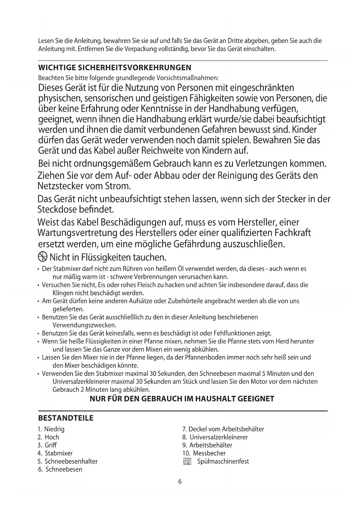- Verwenden Sie den Stabmixer maximal 30 Sekunden, den Schneebesen maximal 5 Minuten und den Universalzerkleinerer maximal 30 Sekunden am Stück und lassen Sie den Motor vor dem nächsten Gebrauch 2 Minuten lang abkühlen. NUR FÜR DEN GEBRAUCH IM HAUSHALT GEEIGNET BESTANDTEILE