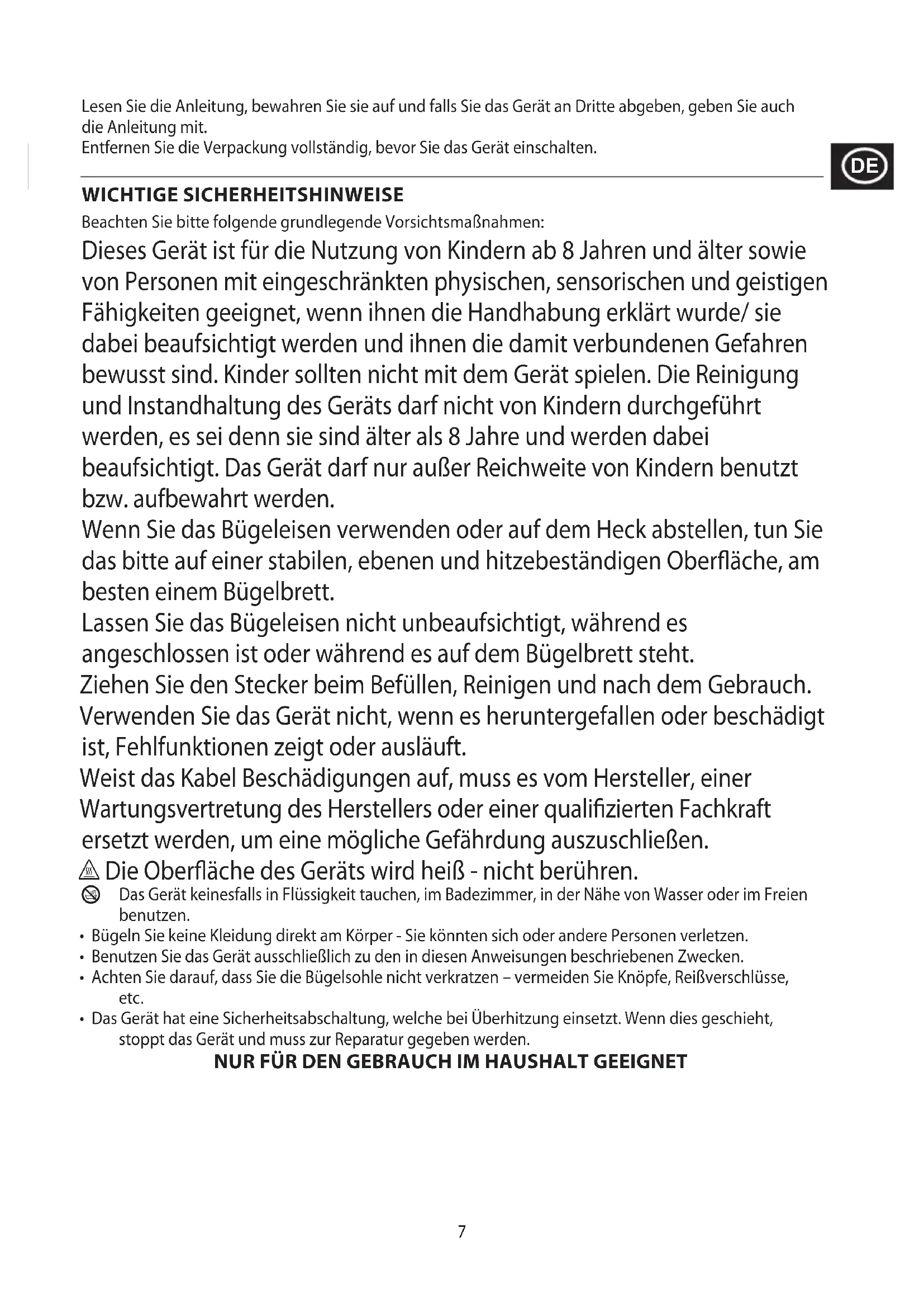 Lesen Sie die Anleitung, bewahren Sie sie auf und falls Sie das Gerät an Dritte abgeben, geben Sie auch die Anleitung mit. Entfernen Sie die Verpackung vollständig, bevor Sie das Gerät einschalten. WICHTIGE SICHERHEITSHINWEISE Beachten Sie bitte folgende grundlegende Vorsichtsmaßnahmen: Dieses Gerät ist für die Nutzung von Kindern ab 8 Jahren und älter sowie von Personen mit eingeschränkten physischen, sensorischen und geistigen Fähigkeiten geeignet, wenn ihnen die Handhabung erklärt wurde/ sie dabei beaufsichtigt werden und ihnen die damit verbundenen Gefahren bewusst sind. Kinder sollten nicht mit dem Gerät spielen. Die Reinigung und Instandhaltung des Geräts darf nicht von Kindern durchgeführt werden, es sei denn sie sind älter als 8 Jahre und werden dabei beaufsichtigt. Das Gerät darf nur außer Reichweite von Kindern benutzt bzw. aufbewahrt werden. Wenn Sie das Bügeleisen verwenden oder auf dem Heck abstellen, tun Sie das bitte auf einer stabilen, ebenen und hitzebeständigen Oberäche, am besten einem Bügelbrett. Lassen Sie das Bügeleisen nicht unbeaufsichtigt, während es angeschlossen ist oder während es auf dem Bügelbrett steht. Ziehen Sie den Stecker beim Befüllen, Reinigen und nach dem Gebrauch. Verwenden Sie das Gerät nicht, wenn es heruntergefallen oder beschädigt ist, Fehlfunktionen zeigt oder ausläuft. Weist das Kabel Beschädigungen auf, muss es vom Hersteller, einer Wartungsvertretung des Herstellers oder einer qualizierten Fachkraft ersetzt werden, um eine mögliche Gefährdung auszuschließen. h Die Oberäche des Geräts wird heiß - nicht berühren.
