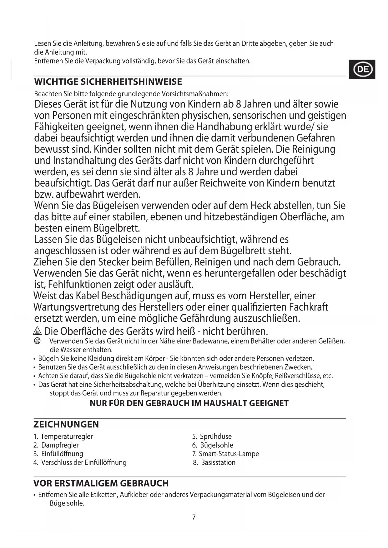 Dieses Gerät ist für die Nutzung von Kindern ab 8 Jahren und äther sowie von Personen mit eingeschrankten physischen, sensorischen und geistigen Fähigkeiten geeignet, wenn他们在 die Handhabung erklärart wurde/ sie bereits beaufsichtigt werden und他们在 die damit verbundenen Gefahren bewusst sind. Kinder sollen nicht mit dem Gerät speilen. Die Reinigung und Instandhaltung des Geräts darf nicht von Kindern durchgeführt werden, es sei dann sie sind äther als 8 Jahre und werden darüber beaufsichtigt. Das Gerätarf nur außer Reichweite von Kindern benutzt bzw. aufbewahrt werden.