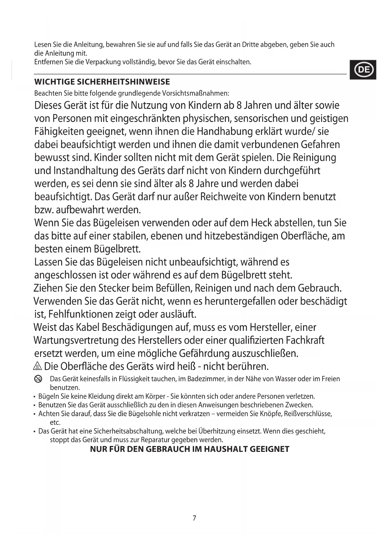 Lesen Sie die Anleitung, bewahren Sie sie auf und falls Sie das Gerät an Dritte abgeben, geben Sie auch die Anleitung mit. Entfernen Sie die Verpackung vollständig, bevor Sie das Gerät einschalten. WICHTIGE SICHERHEITSHINWEISE Beachten Sie bitte folgende grundlegende Vorsichtsmaßnahmen: Dieses Gerät ist für die Nutzung von Kindern ab 8 Jahren und älter sowie von Personen mit eingeschränkten physischen, sensorischen und geistigen Fähigkeiten geeignet, wenn ihnen die Handhabung erklärt wurde/ sie dabei beaufsichtigt werden und ihnen die damit verbundenen Gefahren bewusst sind. Kinder sollten nicht mit dem Gerät spielen. Die Reinigung und Instandhaltung des Geräts darf nicht von Kindern durchgeführt werden, es sei denn sie sind älter als 8 Jahre und werden dabei beaufsichtigt. Das Gerät darf nur außer Reichweite von Kindern benutzt bzw. aufbewahrt werden. Wenn Sie das Bügeleisen verwenden oder auf dem Heck abstellen, tun Sie das bitte auf einer stabilen, ebenen und hitzebeständigen Oberäche, am besten einem Bügelbrett. Lassen Sie das Bügeleisen nicht unbeaufsichtigt, während es angeschlossen ist oder während es auf dem Bügelbrett steht. Ziehen Sie den Stecker beim Befüllen, Reinigen und nach dem Gebrauch. Verwenden Sie das Gerät nicht, wenn es heruntergefallen oder beschädigt ist, Fehlfunktionen zeigt oder ausläuft. Weist das Kabel Beschädigungen auf, muss es vom Hersteller, einer Wartungsvertretung des Herstellers oder einer qualizierten Fachkraft ersetzt werden, um eine mögliche Gefährdung auszuschließen. h Die Oberäche des Geräts wird heiß - nicht berühren.