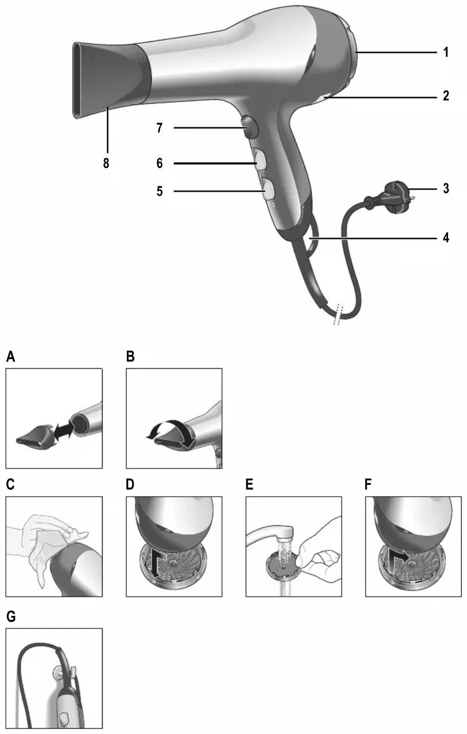- Bild C: Reinigen Sie das Gerät von außen mit einem leicht angefeuchteten Tuch.
