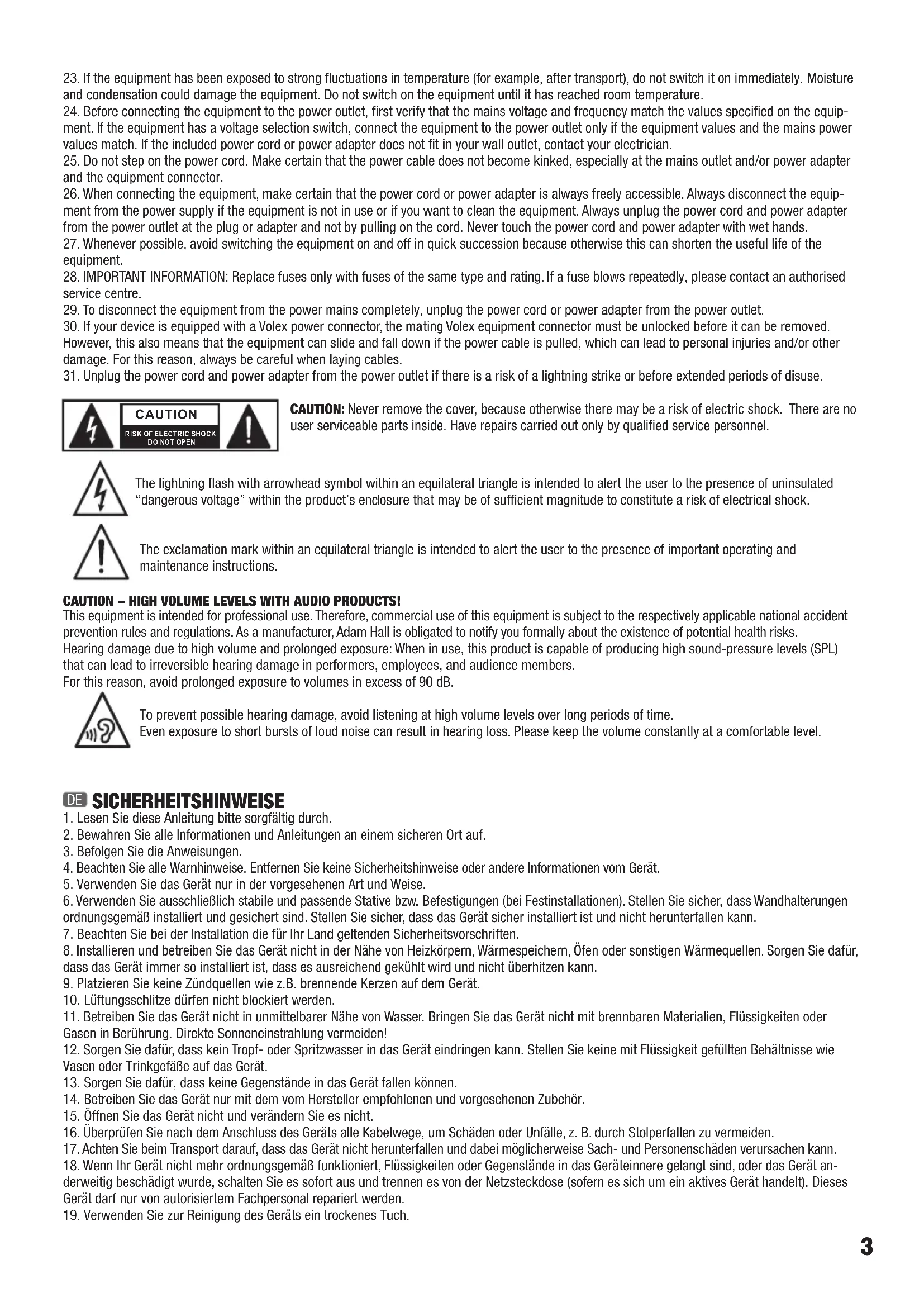 ACHTUNG Entfernen Sie niemals die Abdeckung, da sonst das Risiko eines elektrischen Schlages besteht. Im Inneren des Geräts befinden sich keine Teile, die vom Bediener repariert oder gewartet werden können. Lassen Sie Reparaturen ausschließlich von qualifiziertem Servicepersonal durchführen. Das gleichschenkelige Dreieck mit Blitzsymbol warnt vor nichtisolierten, gefährlichen Spannungen im Geräteinneren, die einen elektrischen Schlag verursachen können. Das gleichschenkelige Dreieck mit Ausrufungszeichen kennzeichnet wichtige Bedienungs- und Wartungshinweise. ACHTUNG HOHE LAUTSTÄRKEN BEI AUDIOPRODUKTEN! Dieses Gerät ist für den professionellen Einsatz vorgesehen. Der kommerzielle Betrieb dieses Geräts unterliegt den jeweils gültigen nationalen Vorschriften und Richtlinien zur Unfallverhütung. Als Hersteller ist Adam Hall gesetzlich verpflichtet, Sie ausdrücklich auf mögliche Gesundheitsrisiken hinzuweisen. Gehörschäden durch hohe Lautstärken und Dauerbelastung: Bei der Verwendung dieses Produkts können hohe Schalldruckpegel (SPL) erzeugt werden, die bei Künstlern, Mitarbeitern und Zuschauern zu irreparablen Gehörschäden führen können. Um eine mögliche Schädigung des Hörsinns zu verhindern, vermeiden Sie das Hören bei großem Lautsärkepegel über lange Zeiträume. Lauter Schalleinfluss kann selbst bei kurzer Dauer zu Hörschäden führen. Bitte halten Sie die Laustärke immer auf einem angenehmen Level.
