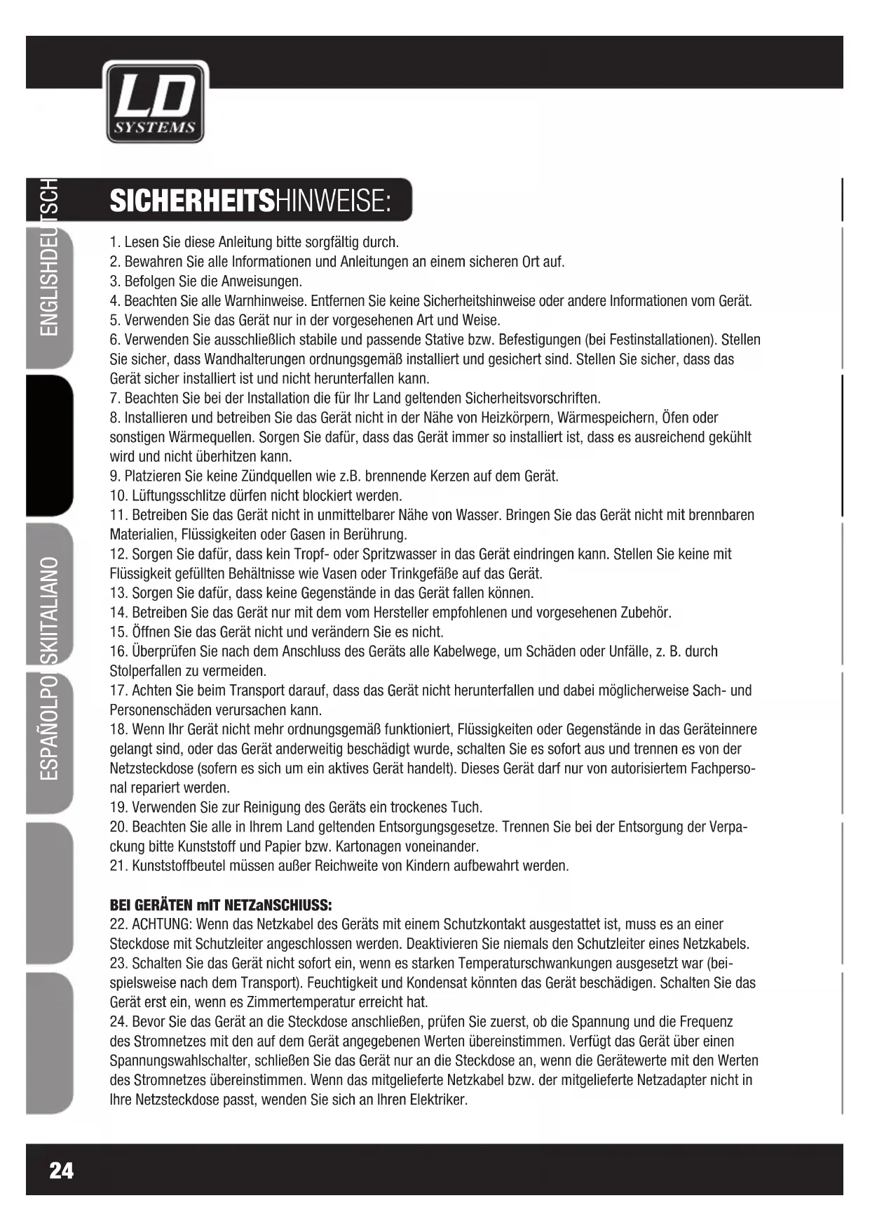 ENGLISHDEUTSCHFRANCAIS FRANCAISFRANCAIS FRANCAISFRANCAIS ESpAñoLpoLSKIITALIANo Sie haben die richtige Wahl getroffen! Dieses Gerät wurde unter hohen Qualitätsanforderungen entwickelt und gefertigt, um viele Jahre einen reibungs- losen Betrieb zu gewährleisten. Dafür steht LD Systems mit seinem Namen und der langjährigen Erfahrung als Hersteller hochwertiger Audioprodukte. Bitte lesen Sie diese Bedienungsanleitung sorgfältig, damit Sie Ihr neues Produkt von LD Systems schnell optimal einsetzen können. Mehr Informationen zu LD SYSTEMS finden Sie auf unserer Internetseite WWW.LD-SYSTeMS.COM4-Zonen rack mixer LDzONE624