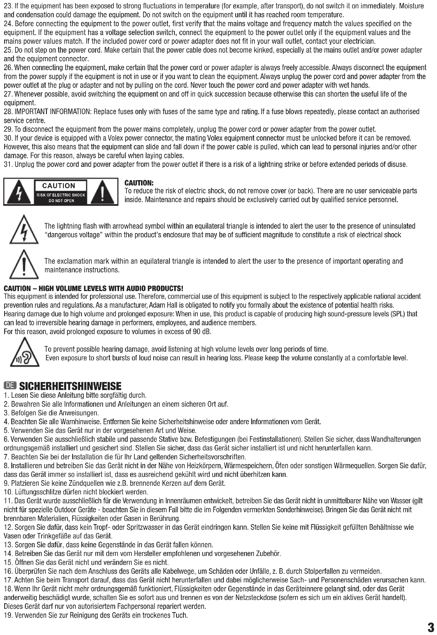 BEI GERÄTEN MIT NETZANSCHLUSS: 22. ACHTUNG: Wenn das Netzkabel des Geräts mit einem Schutzkontakt ausgestattet ist, muss es an einer Steckdose mit Schutzleiter angeschlossen werden. Deaktivieren Sie niemals den Schutzleiter eines Netzkabels. 23. Schalten Sie das Gerät nicht sofort ein, wenn es starken Temperaturschwankungen ausgesetzt war (beispielsweise nach dem Transport). Feuchtigkeit und Kondensat könnten das Gerät beschädigen. Schalten Sie das Gerät erst ein, wenn es Zimmertemperatur erreicht hat. 24. Bevor Sie das Gerät an die Steckdose anschließen, prüfen Sie zuerst, ob die Spannung und die Frequenz des Stromnetzes mit den auf dem Gerät angegebenen Werten übereinstimmen. Verfügt das Gerät über einen Spannungswahlschalter, schließen Sie das Gerät nur an die Steckdose an, wenn die Gerätewerte mit den Werten des Stromnetzes übereinstimmen. Wenn das mitgelieferte Netzkabel bzw. der mitgelieferte Netzadapter nicht in Ihre Netzsteckdose passt, wenden Sie sich an Ihren Elektriker. 25. Treten Sie nicht auf das Netzkabel. Sorgen Sie dafür, dass spannungsführende Kabel speziell an der Netzbuchse bzw. am Netzadapter und der Gerätebuchse nicht geknickt werden. 26. Achten Sie bei der Verkabelung des Geräts immer darauf, dass das Netzkabel bzw. der Netzadapter stets frei zugänglich ist. Trennen Sie das Gerät stets von der Stromzuführung, wenn das Gerät nicht benutzt wird, oder Sie das Gerät reinigen möchten. Ziehen Sie Netzkabel und Netzadapter immer am Stecker bzw. am Adapter und nicht am Kabel aus der Steckdose. Berühren Sie Netzkabel und Netzadapter niemals mit nassen Händen. 27. Schalten Sie das Gerät möglichst nicht schnell hintereinander ein und aus, da sonst die Lebensdauer des Geräts beeinträchtigt werden könnte. 28. WICHTIGER HINWEIS: Ersetzen Sie Sicherungen ausschließlich durch Sicherungen des gleichen Typs und Wertes. Sollte eine Sicherung wiederholt auslösen, wenden Sie sich bitte an ein autorisiertes Servicezentrum. 29. Um das Gerät vollständig vom Stromnetz zu trennen, entfernen Sie das Netzkabel bzw. den Netzadapter aus der Steckdose. 30. Wenn Ihr Gerät mit einem Volex-Netzanschluss bestückt ist, muss der passende Volex-Gerätestecker entsperrt werden, bevor er entfernt werden kann. Das bedeutet aber auch, dass das Gerät durch ein Ziehen am Netzkabel verrutschen und herunterfallen kann, wodurch Personen verletzt werden und/oder andere Schäden auftreten können. Verlegen Sie Ihre Kabel daher immer sorgfältig. 31. Entfernen Sie Netzkabel und Netzadapter aus der Steckdose bei Gefahr eines Blitzschlags oder wenn Sie das Gerät länger nicht verwenden. ACHTUNG Entfernen Sie niemals die Abdeckung, da sonst das Risiko eines elektrischen Schlages besteht. Im Inneren des Geräts befinden sich keine Teile, die vom Bediener repariert oder gewartet werden können. Lassen Sie Wartung und Reparaturen ausschließlich von qualifiziertem Servicepersonal durchführen. Das gleichseitige Dreieck mit Blitzsymbol warnt vor nichtisolierten, gefährlichen Spannungen im Geräteinneren, die einen elektrischen Schlag verursachen können. Das gleichseitige Dreieck mit Ausrufungszeichen kennzeichnet wichtige Bedienungs- und Wartungshinweise. ACHTUNG HOHE LAUTSTÄRKEN BEI AUDIOPRODUKTEN! Dieses Gerät ist für den professionellen Einsatz vorgesehen. Der kommerzielle Betrieb dieses Geräts unterliegt den jeweils gültigen nationalen Vorschriften und Richtlinien zur Unfallverhütung. Als Hersteller ist Adam Hall gesetzlich verpflichtet, Sie ausdrücklich auf mögliche Gesundheitsrisiken hinzuweisen. Gehörschäden durch hohe Lautstärken und Dauerbelastung: Bei der Verwendung dieses Produkts können hohe Schalldruckpegel (SPL) erzeugt werden, die bei Künstlern, Mitarbeitern und Zuschauern zu irreparablen Gehörschäden führen können. Um eine mögliche Schädigung des Hörsinns zu verhindern, vermeiden Sie das Hören bei großem Lautsärkepegel über lange Zeiträume. Lauter Schalleinfluss kann selbst bei kurzer Dauer zu Hörschäden führen. Bitte halten Sie die Laustärke immer auf einem angenehmen Level.