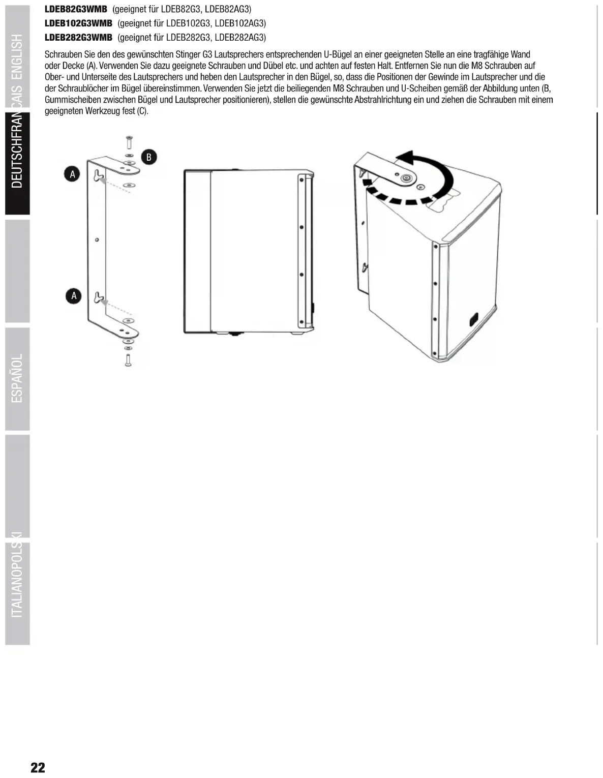 ITALIANOPOLSKIESPAÑOL FRANCAISDEUTSCHENGLISH 21LDEB82G3WMB (geeignet für LDEB82G3, LDEB82AG3) LDEB102G3WMB (geeignet für LDEB102G3, LDEB102AG3) LDEB282G3WMB (geeignet für LDEB282G3, LDEB282AG3) Schrauben Sie den des gewünschten Stinger G3 Lautsprechers entsprechenden U-Bügel an einer geeigneten Stelle an eine tragfähige Wand oder Decke (A). Verwenden Sie dazu geeignete Schrauben und Dübel etc. und achten auf festen Halt. Entfernen Sie nun die M8 Schrauben auf Ober- und Unterseite des Lautsprechers und heben den Lautsprecher in den Bügel, so, dass die Positionen der Gewinde im Lautsprecher und die der Schraublöcher im Bügel übereinstimmen. Verwenden Sie jetzt die beiliegenden M8 Schrauben und U-Scheiben gemäß der Abbildung unten (B, Gummischeiben zwischen Bügel und Lautsprecher positionieren), stellen die gewünschte Abstrahlrichtung ein und ziehen die Schrauben mit einem geeigneten Werkzeug fest (C).