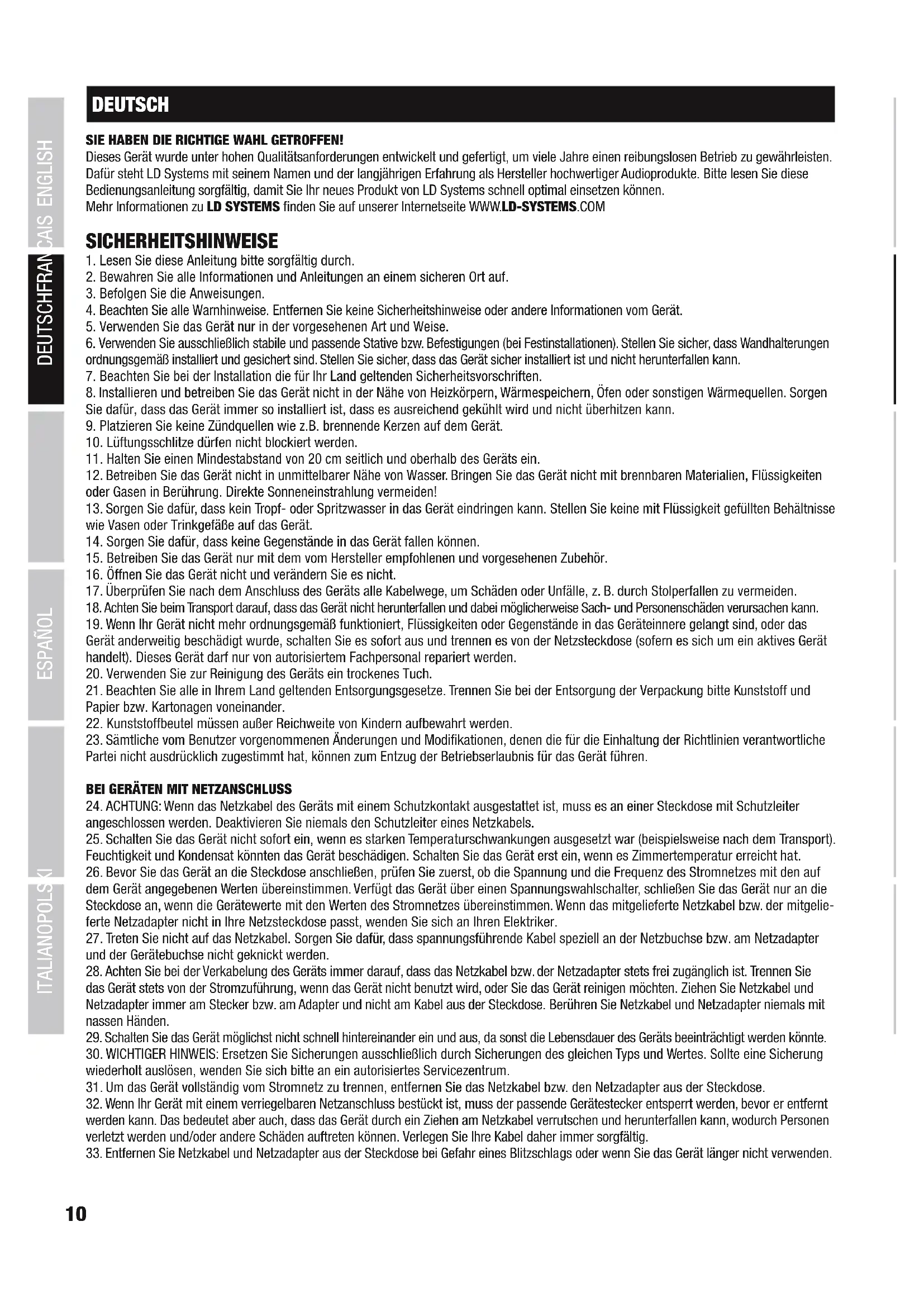 24. ACHTUNG: Wenn das Netzkabel des Geräts mit einem Schutzkontakt ausgestattet ist, muss es an einer Steckdose mit Schutzleiter angeschlossen werden. Deaktivieren Sie niemals den Schutzleiter eines Netzkabels. 25. Schalten Sie das Gerät nicht sofort ein, wenn es starken Temperaturschwankungen ausgesetzt war (beispielsweise nach dem Transport). Feuchtigkeit und Kondensat könnten das Gerät beschädigen. Schalten Sie das Gerät erst ein, wenn es Zimmertemperatur erreicht hat. 26. Bevor Sie das Gerät an die Steckdose anschließen, prüfen Sie zuerst, ob die Spannung und die Frequenz des Stromnetzes mit den auf dem Gerät angegebenen Werten übereinstimmen. Verfügt das Gerät über einen Spannungswahlschalter, schließen Sie das Gerät nur an die Steckdose an, wenn die Gerätewerte mit den Werten des Stromnetzes übereinstimmen. Wenn das mitgelieferte Netzkabel bzw. der mitgelie- ferte Netzadapter nicht in Ihre Netzsteckdose passt, wenden Sie sich an Ihren Elektriker. 27. Treten Sie nicht auf das Netzkabel. Sorgen Sie dafür, dass spannungsführende Kabel speziell an der Netzbuchse bzw. am Netzadapter und der Gerätebuchse nicht geknickt werden. 28. Achten Sie bei der Verkabelung des Geräts immer darauf, dass das Netzkabel bzw. der Netzadapter stets frei zugänglich ist. Trennen Sie das Gerät stets von der Stromzuführung, wenn das Gerät nicht benutzt wird, oder Sie das Gerät reinigen möchten. Ziehen Sie Netzkabel und Netzadapter immer am Stecker bzw. am Adapter und nicht am Kabel aus der Steckdose. Berühren Sie Netzkabel und Netzadapter niemals mit nassen Händen. 29. Schalten Sie das Gerät möglichst nicht schnell hintereinander ein und aus, da sonst die Lebensdauer des Geräts beeinträchtigt werden könnte. 30. WICHTIGER HINWEIS: Ersetzen Sie Sicherungen ausschließlich durch Sicherungen des gleichen Typs und Wertes. Sollte eine Sicherung wiederholt auslösen, wenden Sie sich bitte an ein autorisiertes Servicezentrum. 31. Um das Gerät vollständig vom Stromnetz zu trennen, entfernen Sie das Netzkabel bzw. den Netzadapter aus der Steckdose. 32. Wenn Ihr Gerät mit einem verriegelbaren Netzanschluss bestückt ist, muss der passende Gerätestecker entsperrt werden, bevor er entfernt werden kann. Das bedeutet aber auch, dass das Gerät durch ein Ziehen am Netzkabel verrutschen und herunterfallen kann, wodurch Personen verletzt werden und/oder andere Schäden auftreten können. Verlegen Sie Ihre Kabel daher immer sorgfältig. 33. Entfernen Sie Netzkabel und Netzadapter aus der Steckdose bei Gefahr eines Blitzschlags oder wenn Sie das Gerät länger nicht verwenden.ITALIANOPOLSKIESPAÑOL FRANCAISDEUTSCHENGLISH