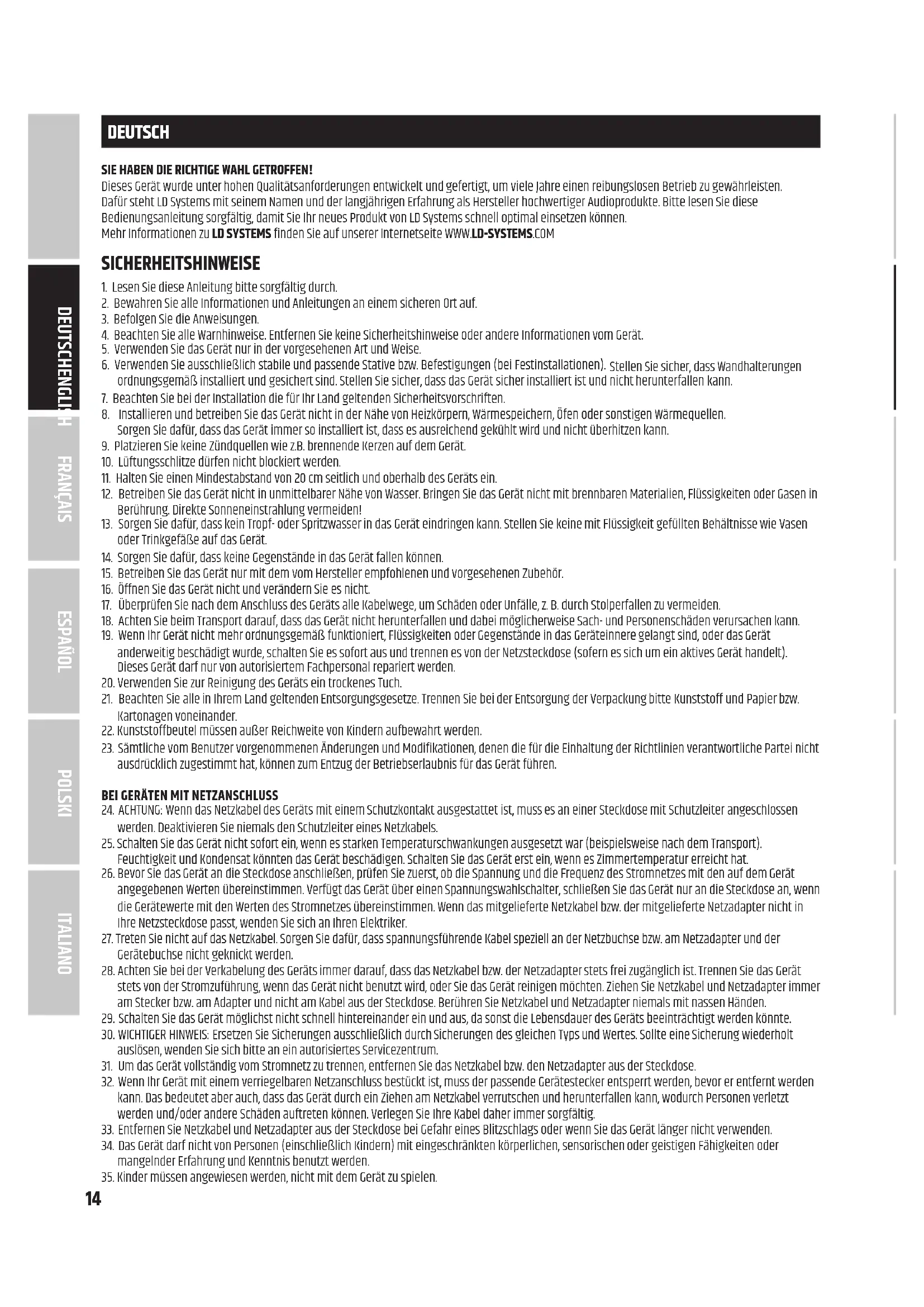 DEUTSCH SIE HABEN DIE RICHTIGE WAHL GETROFFEN! Dieses Gerät wurde unter hohen Qualitätsanforderungen entwickelt und gefertigt, um viele Jahre einen reibungslosen Betrieb zu gewährleisten. Dafür steht LD Systems mit seinem Namen und der langjährigen Erfahrung als Hersteller hochwertiger Audioprodukte. Bitte lesen Sie diese Bedienungsanleitung sorgfältig, damit Sie Ihr neues Produkt von LD Systems schnell optimal einsetzen können. Mehr Informationen zu LD SYSTEMS finden Sie auf unserer Internetseite WWW.LD-SYSTEMS.COM SICHERHEITSHINWEISE