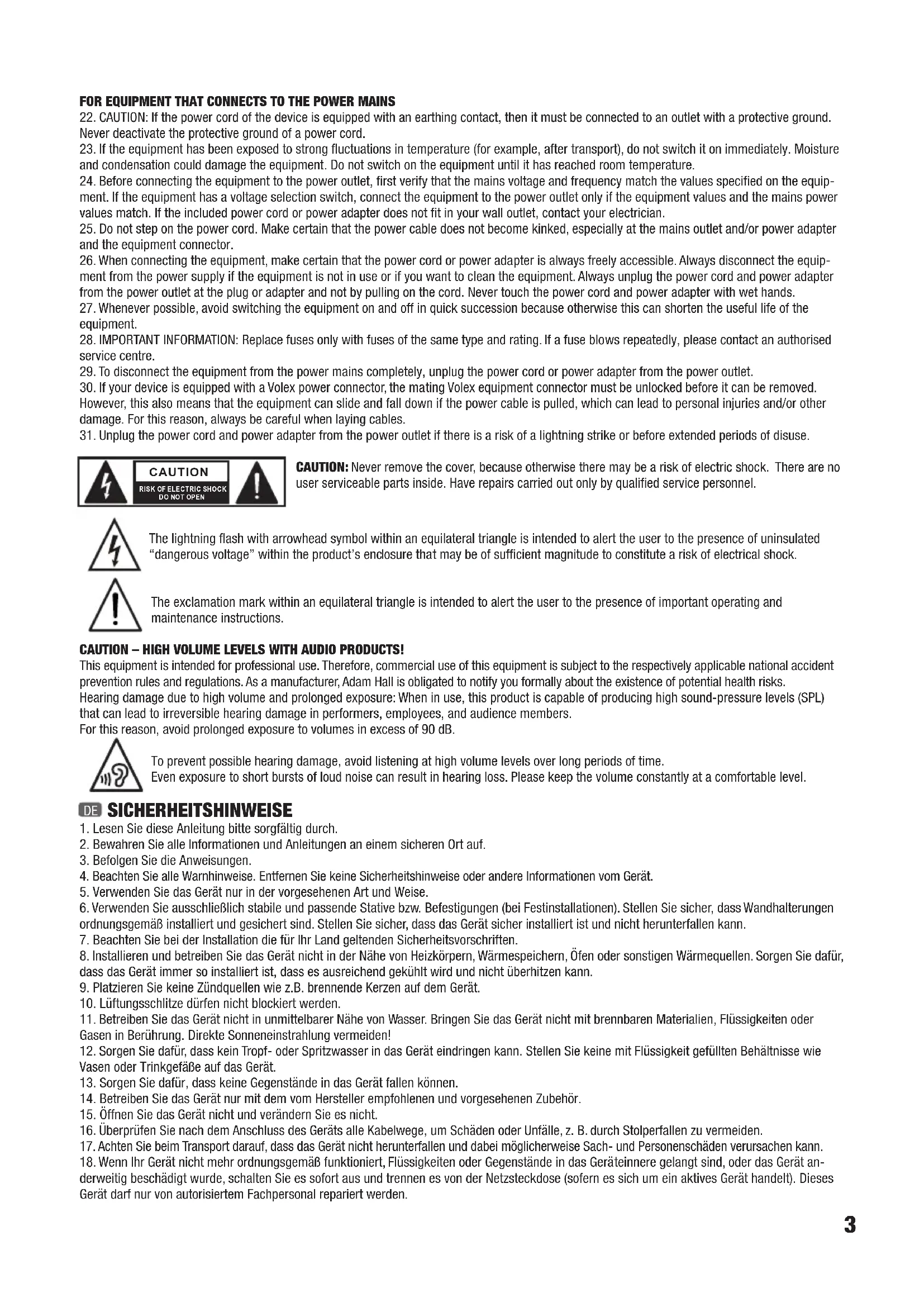 ACHTUNG Entfernen Sie niemals die Abdeckung, da sonst das Risiko eines elektrischen Schlages besteht. Im Inneren des Geräts befinden sich keine Teile, die vom Bediener repariert oder gewartet werden können. Lassen Sie Reparaturen ausschließlich von qualifiziertem Servicepersonal durchführen. Das gleichschenkelige Dreieck mit Blitzsymbol warnt vor nichtisolierten, gefährlichen Spannungen im Geräteinneren, die einen elektrischen Schlag verursachen können. Das gleichschenkelige Dreieck mit Ausrufungszeichen kennzeichnet wichtige Bedienungs- und Wartungshinweise. ACHTUNG HOHE LAUTSTÄRKEN BEI AUDIOPRODUKTEN! Dieses Gerät ist für den professionellen Einsatz vorgesehen. Der kommerzielle Betrieb dieses Geräts unterliegt den jeweils gültigen nationalen Vorschriften und Richtlinien zur Unfallverhütung. Als Hersteller ist Adam Hall gesetzlich verpflichtet, Sie ausdrücklich auf mögliche Gesundheitsrisiken hinzuweisen. Gehörschäden durch hohe Lautstärken und Dauerbelastung: Bei der Verwendung dieses Produkts können hohe Schalldruckpegel (SPL) erzeugt werden, die bei Künstlern, Mitarbeitern und Zuschauern zu irreparablen Gehörschäden führen können. Um eine mögliche Schädigung des Hörsinns zu verhindern, vermeiden Sie das Hören bei großem Lautsärkepegel über lange Zeiträume. Lauter Schalleinfluss kann selbst bei kurzer Dauer zu Hörschäden führen. Bitte halten Sie die Laustärke immer auf einem angenehmen Level.