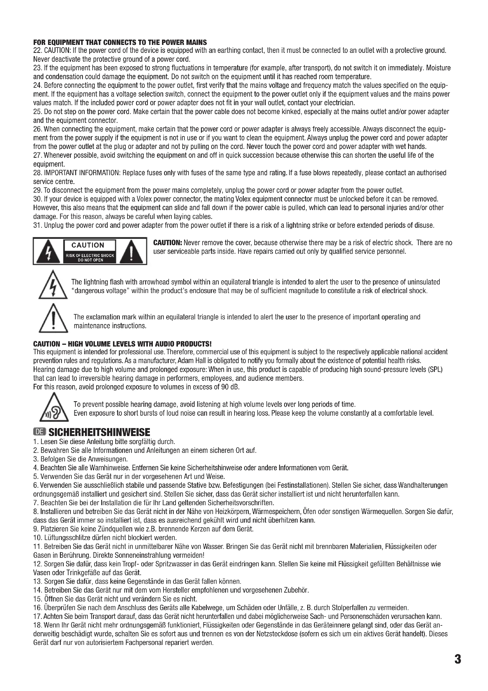 ACHTUNG Entfernen Sie niemals die Abdeckung, da sonst das Risiko eines elektrischen Schlages besteht. Im Inneren des Geräts befinden sich keine Teile, die vom Bediener repariert oder gewartet werden können. Lassen Sie Reparaturen ausschließlich von qualifiziertem Servicepersonal durchführen. Das gleichschenkelige Dreieck mit Blitzsymbol warnt vor nichtisolierten, gefährlichen Spannungen im Geräteinneren, die einen elektrischen Schlag verursachen können. Das gleichschenkelige Dreieck mit Ausrufungszeichen kennzeichnet wichtige Bedienungs- und Wartungshinweise. ACHTUNG HOHE LAUTSTÄRKEN BEI AUDIOPRODUKTEN! Dieses Gerät ist für den professionellen Einsatz vorgesehen. Der kommerzielle Betrieb dieses Geräts unterliegt den jeweils gültigen nationalen Vorschriften und Richtlinien zur Unfallverhütung. Als Hersteller ist Adam Hall gesetzlich verpflichtet, Sie ausdrücklich auf mögliche Gesundheitsrisiken hinzuweisen. Gehörschäden durch hohe Lautstärken und Dauerbelastung: Bei der Verwendung dieses Produkts können hohe Schalldruckpegel (SPL) erzeugt werden, die bei Künstlern, Mitarbeitern und Zuschauern zu irreparablen Gehörschäden führen können. Um eine mögliche Schädigung des Hörsinns zu verhindern, vermeiden Sie das Hören bei großem Lautsärkepegel über lange Zeiträume. Lauter Schalleinfluss kann selbst bei kurzer Dauer zu Hörschäden führen. Bitte halten Sie die Laustärke immer auf einem angenehmen Level.