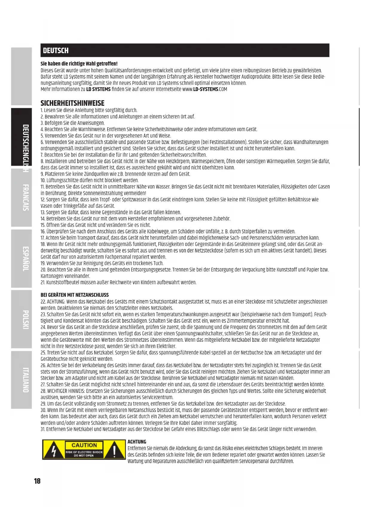 DEUTSCHFRANCAIS ESPAÑOL ENGLISH ITALIANO POLSKIDEUTSCH Sie haben die richtige Wahl getroffen! Dieses Gerät wurde unter hohen Qualitätsanforderungen entwickelt und gefertigt, um viele Jahre einen reibungslosen Betrieb zu gewährleisten. Dafür steht LD Systems mit seinem Namen und der langjährigen Erfahrung als Hersteller hochwertiger Audioprodukte. Bitte lesen Sie diese Bedie- nungsanleitung sorgfältig, damit Sie Ihr neues Produkt von LD Systems schnell optimal einsetzen können. Mehr Informationen zu LD SYSTEMS nden Sie auf unserer Internetseite www.LD-SYSTEMS.COM SICHERHEITSHINWEISE