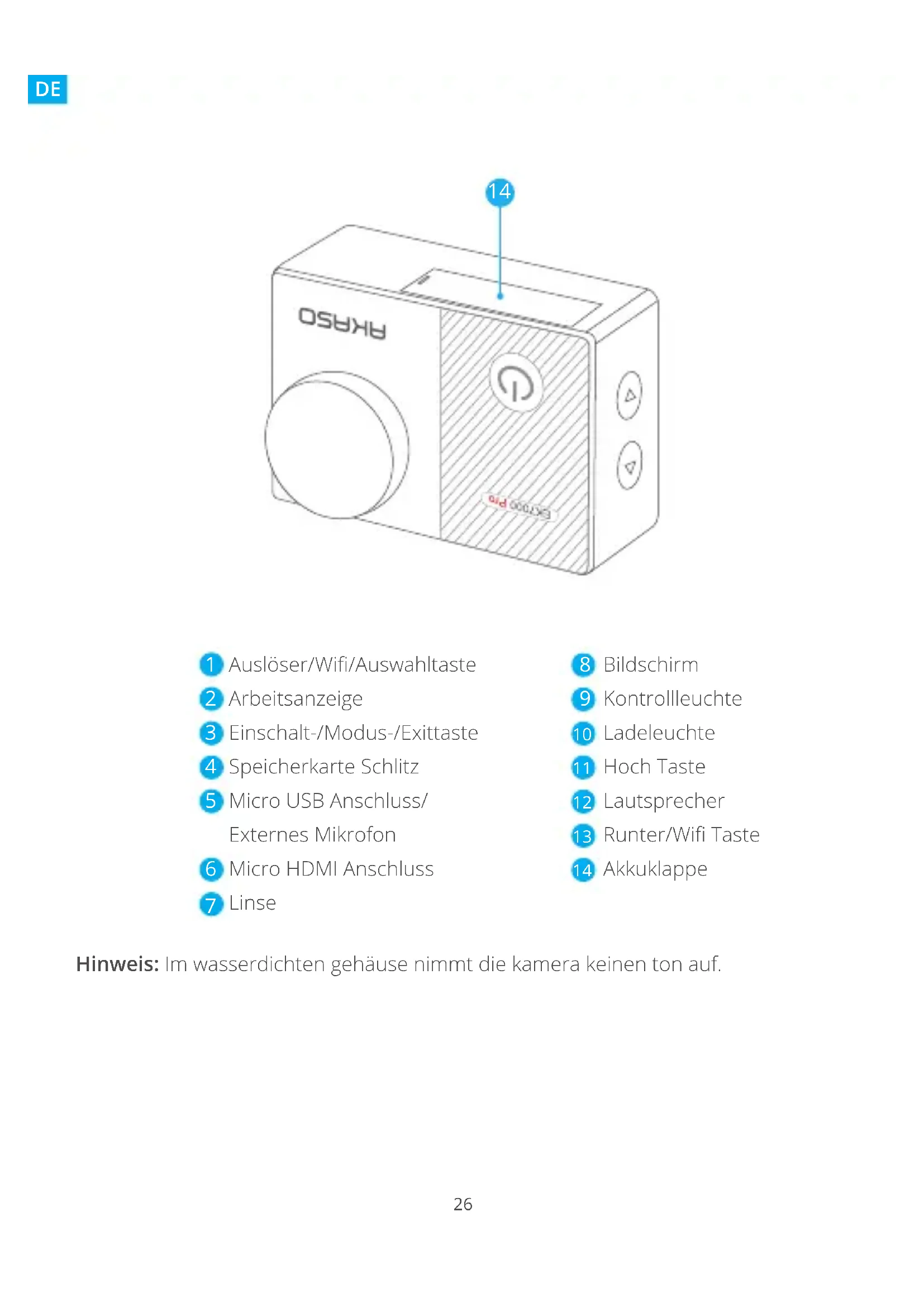 Auslöser/Wifi/Auswahltaste Arbeitsanzeige Einschalt-/Modus-/Exittaste Speicherkarte Schlitz Micro USB Anschluss/ Externes Mikrofon Micro HDMI Anschluss Linse Bildschirm Kontrollleuchte Ladeleuchte Hoch Taste Lautsprecher Runter/Wifi Taste Akkuklappe Hinweis: Im wasserdichten gehäuse nimmt die kamera keinen ton auf.