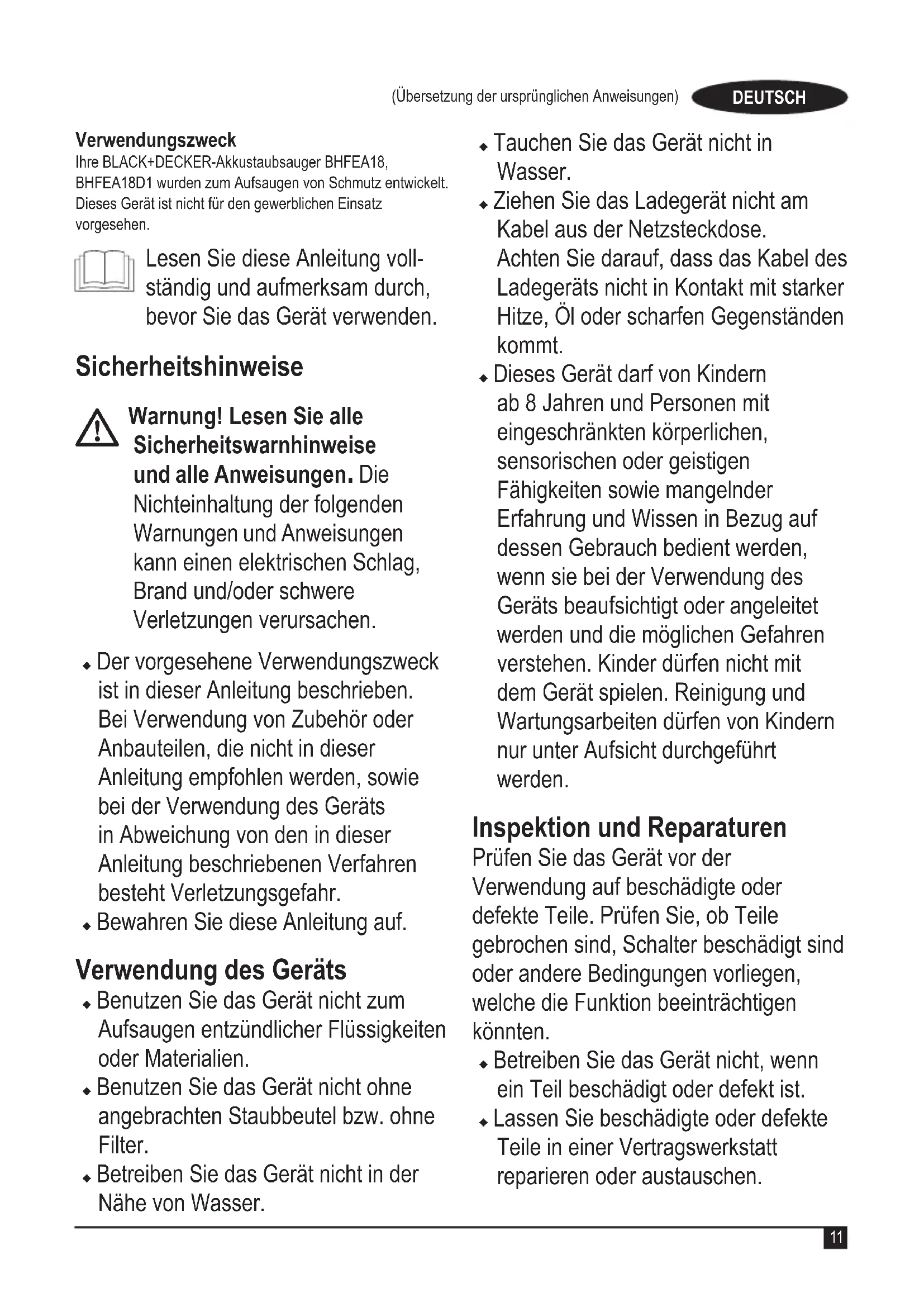 Warnung! Lesen Sie alle Sicherheitswarnhinweise und alle Anweisungen. Die Nichteinhaltung der folgenden Warnungen und Anweisungen kann einen elektrischen Schlag, Brand und/oder schwere Verletzungen verursachen. u Der vorgesehene Verwendungszweck ist in dieser Anleitung beschrieben. Bei Verwendung von Zubehör oder Anbauteilen, die nicht in dieser Anleitung empfohlen werden, sowie bei der Verwendung des Geräts in Abweichung von den in dieser Anleitung beschriebenen Verfahren besteht Verletzungsgefahr. u Bewahren Sie diese Anleitung auf. Verwendung des Geräts u Benutzen Sie das Gerät nicht zum Aufsaugen entzündlicher Flüssigkeiten oder Materialien. u Benutzen Sie das Gerät nicht ohne angebrachten Staubbeutel bzw. ohne Filter. u Betreiben Sie das Gerät nicht in der Nähe von Wasser. u Tauchen Sie das Gerät nicht in Wasser. u Ziehen Sie das Ladegerät nicht am Kabel aus der Netzsteckdose. Achten Sie darauf, dass das Kabel des Ladegeräts nicht in Kontakt mit starker Hitze, Öl oder scharfen Gegenständen kommt. u Dieses Gerät darf von Kindern ab 8 Jahren und Personen mit eingeschränkten körperlichen, sensorischen oder geistigen Fähigkeiten sowie mangelnder Erfahrung und Wissen in Bezug auf dessen Gebrauch bedient werden, wenn sie bei der Verwendung des Geräts beaufsichtigt oder angeleitet werden und die möglichen Gefahren verstehen. Kinder dürfen nicht mit dem Gerät spielen. Reinigung und Wartungsarbeiten dürfen von Kindern nur unter Aufsicht durchgeführt werden. Inspektion und Reparaturen Prüfen Sie das Gerät vor der Verwendung auf beschädigte oder defekte Teile. Prüfen Sie, ob Teile gebrochen sind, Schalter beschädigt sind oder andere Bedingungen vorliegen, welche die Funktion beeinträchtigen könnten. u Betreiben Sie das Gerät nicht, wenn ein Teil beschädigt oder defekt ist. u Lassen Sie beschädigte oder defekte Teile in einer Vertragswerkstatt reparieren oder austauschen.12 (Übersetzung der ursprünglichen Anweisungen) DEUTSCH u Überprüfen Sie das Ladegerätkabel in regelmäßigen Abständen auf Beschädigungen. Tauschen Sie das Ladegerät aus, wenn das Kabel beschädigt oder defekt ist. u Ersetzen oder entfernen Sie keine Teile, für die in dieser Anleitung keine entsprechende Beschreibung enthalten ist. Zusätzliche Sicherheitshinweise Nach dem Gebrauch u Ziehen Sie das Ladegerät aus der Netzsteckdose, bevor Sie das Ladegerät oder die Ladestation reinigen. u Bewahren Sie das Gerät bei Nichtgebrauch an einem trockenen Ort auf. u Kinder sollten keinen Zugang zu aufbewahrten Geräten haben. Restrisiken Beim Gebrauch dieses Geräts verbleiben zusätzliche Restrisiken, die möglicher- weise nicht in den Sicherheitswarnun- gen genannt werden. Diese Risiken bestehen beispielsweise bei Missbrauch oder längerem Gebrauch. Auch bei der Einhaltung der entsprechenden Sicher- heitsvorschriften und der Verwendung aller Sicherheitsgeräte bestehen weiter- hin bestimmte Restrisiken. Diese sind: u Verletzungen, die durch das Berühren von sich drehenden/bewegenden Teilen verursacht werden. u Verletzungen, die durch das Austauschen von Teilen, Messern oder Zubehör verursacht werden. u Verletzungen, die durch längeren Gebrauch eines Geräts verursacht werden. Legen Sie bei längerem Gebrauch regelmäßige Pausen ein. u Beeinträchtigung des Gehörs.u Gesundheitsrisiken durch das Einatmen von Staub beim Verwenden des Geräts (beispielsweise bei Holzarbeiten, insbesondere Eiche, Buche und MDF.) Akkus und Ladegeräte Akkus (separat erhältlich) u Auadbare Akkus müssen vor dem Auaden aus dem Gerät genommen werden. u Akkus müssen mit der richtigen Polarität eingesetzt werden. u Verbrauchte Akkus müssen aus dem Gerät entfernt und auf sichere Weise entsorgt werden. u Wenn das Gerät längere Zeit nicht benutzt wird, sollten die Akkus entfernt werden. u Die Anschlüsse dürfen nicht kurzgeschlossen werden. u Keinesfalls versuchen, den Akku zu öffnen. u Achten Sie darauf, dass der Akku nicht mit Wasser in Berührung kommt. u Setzen Sie den Akku keinen hohen Temperaturen aus. u Nicht bei Temperaturen über 40 °C lagern.13 (Übersetzung der ursprünglichen Anweisungen) DEUTSCH u Laden Sie den Akku nur bei Umgebungstemperaturen von 10 °C bis 40 °C auf. u Verwenden Sie ausschließlich das mit dem Gerät gelieferte Ladegerät. Das Verwenden eines falschen Ladegeräts kann zu einem Stromschlag oder dem Überhitzen des Akkus führen. u Beachten Sie zur Entsorgung von Akkus oder Batterien die Hinweise im Abschnitt „Umweltschutz”. u Der Akku darf nicht durch mechanische Krafteinwirkung oder Belastungen beschädigt oder verformt werden. Andernfalls besteht Verletzungs- und Brandgefahr. u Laden Sie beschädigte Akkus nicht auf. u Unter extremen Bedingungen können Akkus undicht werden. Wenn Sie feststellen, dass aus dem Akku Flüssigkeit austritt, wischen Sie diese vorsichtig mit einem Tuch ab. Vermeiden Sie Hautkontakt. u Beachten Sie nach Haut- oder Augenkontakt die folgenden Hinweise. Warnung! Batteriesäure kann Sach- oder Personenschäden verursachen. Spülen Sie die Säure bei Hautkontakt sofort mit Wasser ab. Suchen Sie einen Arzt auf, wenn sich auf der Haut Rötungen, Reizungen oder andere Irritationen zeigen. Spülen Sie das Auge nach Augenkontakt sofort mit sauberem Wasser aus, und suchen Sie einen Arzt auf. Ladegeräte (separat erhältlich) Das Ladegerät ist für eine bestimmte Spannung ausgelegt. Stellen Sie sicher, dass die Netzspannung der auf dem Typenschild des Geräts und in der Tabelle mit den technischen Daten angegebenen Spannung entspricht. Warnung! Ersetzen Sie das Ladegerät keinesfalls durch ein normales Netzkabel. u Verwenden Sie das BLACK+DECKER- Ladegerät nur für den Akku des Werkzeugs, mit dem es geliefert wurde. Andere Akkus können platzen und Sachschäden oder Verletzungen verursachen. u Versuchen Sie keinesfalls, nicht auadbare Akkus zu laden. u Bei einer Beschädigung des Netzkabels muss dieses durch den Hersteller oder eine BLACK+DECKER Ve