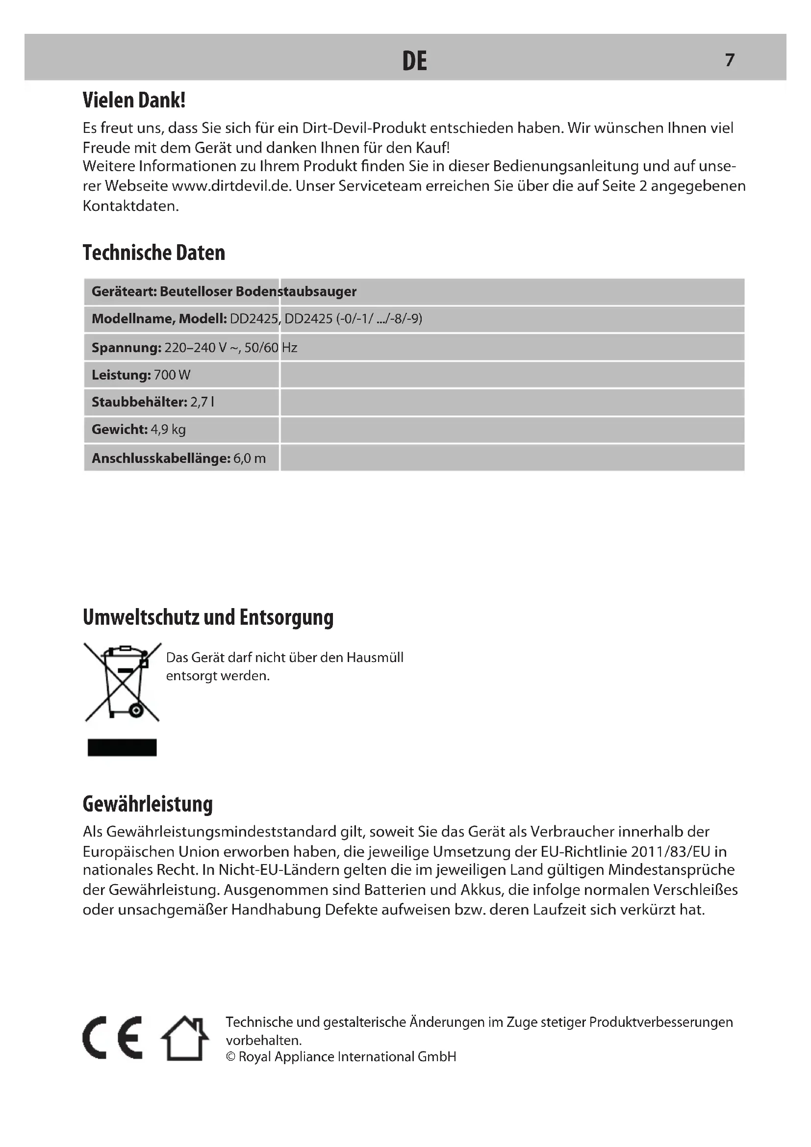 M242 (*) 6Umweltschutz und Entsorgung Das Gerät darf nicht über den Hausmüll entsorgt werden. Gewährleistung Als Gewährleistungsmindeststandard gilt, soweit Sie das Gerät als Verbraucher innerhalb der Europäischen Union erworben haben, die jeweilige Umsetzung der EU-Richtlinie 2011/83/EU in nationales Recht. In Nicht-EU-Ländern gelten die im jeweiligen Land gültigen Mindestansprüche der Gewährleistung. Ausgenommen sind Batterien und Akkus, die infolge normalen Verschleißes oder unsachgemäßer Handhabung Defekte aufweisen bzw. deren Laufzeit sich verkürzt hat. Technische und gestalterische Änderungen im Zuge stetiger Produktverbesserungen vorbehalten. © Royal Appliance International GmbH Vielen Dank! Es freut uns, dass Sie sich für ein Dirt-Devil-Produkt entschieden haben. Wir wünschen Ihnen viel Freude mit dem Gerät und danken Ihnen für den Kauf! Weitere Informationen zu Ihrem Produkt nden Sie in dieser Bedienungsanleitung und auf unse- rer Webseite www.dirtdevil.de. Unser Serviceteam erreichen Sie über die auf Seite 2 angegebenen Kontaktdaten. Technische Daten Geräteart: Beutelloser Bodenstaubsauger Modellname, Modell: DD2425, DD2425 (-0/-1/ .../-8/-9) Spannung: 220–240 V ~, 50/60 Hz Leistung: 700 W Staubbehälter: 2,7 l Gewicht: 4,9 kg Anschlusskabellänge: 6,0 m
