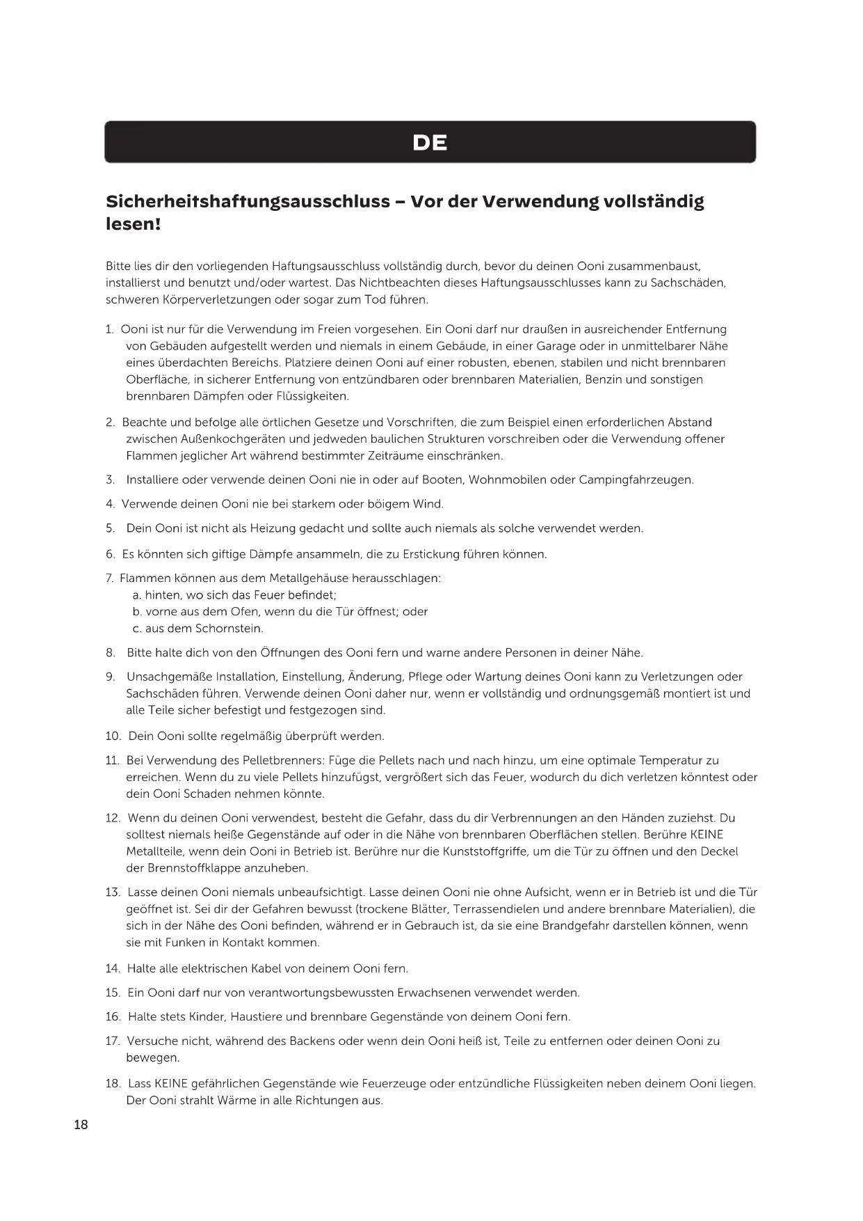 Sicherheitshaftungsausschluss – Vor der Verwendung vollständig lesen! Bitte lies dir den vorliegenden Haftungsausschluss vollständig durch, bevor du deinen Ooni zusammenbaust, installierst und benutzt und/oder wartest. Das Nichtbeachten dieses Haftungsausschlusses kann zu Sachschäden, schweren Körperverletzungen oder sogar zum Tod führen.