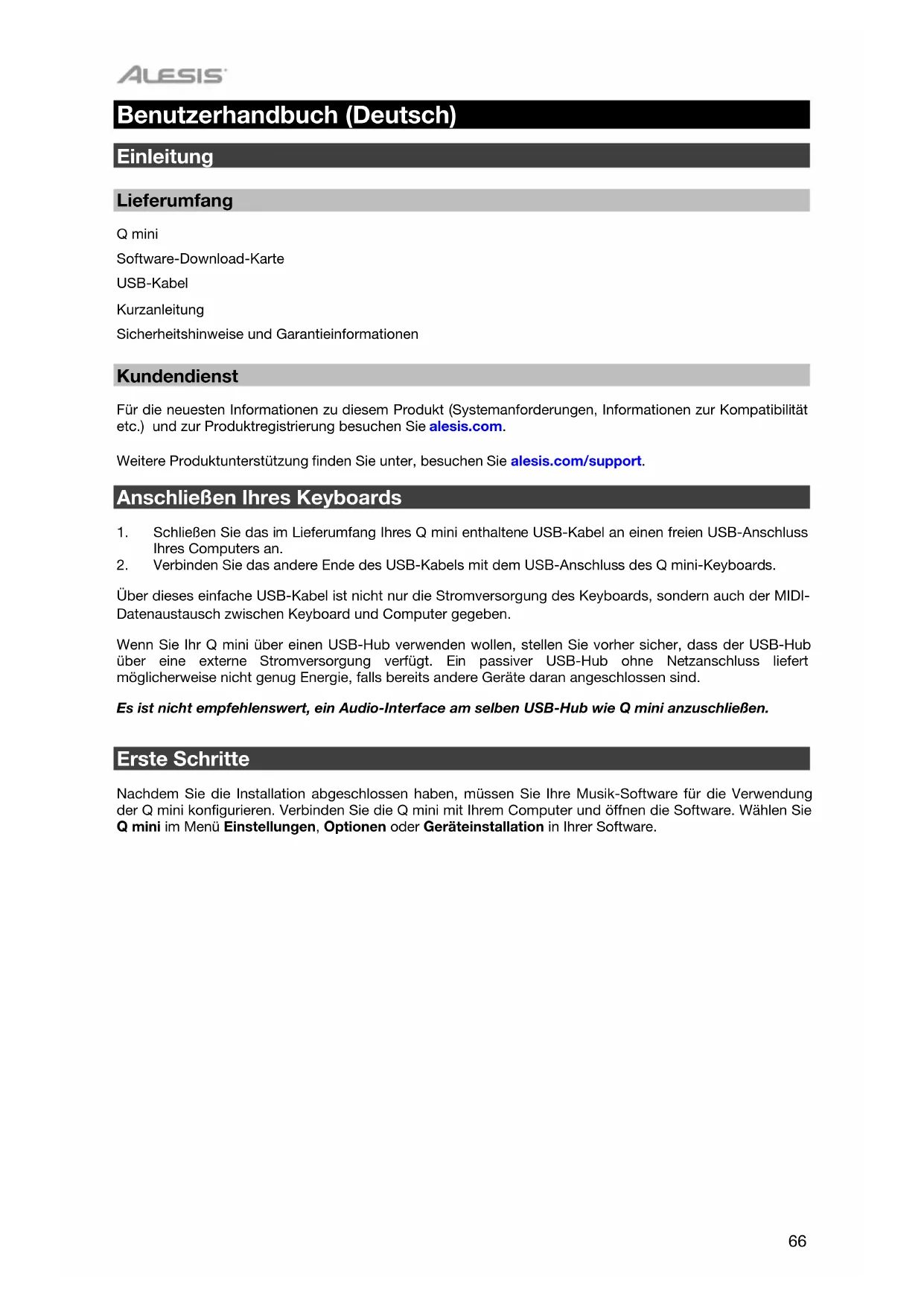 Lieferumfang Q mini Software-Download-Karte USB-Kabel Kurzanleitung Sicherheitshinweise und Garantieinformationen Kundendienst Für die neuesten Informationen zu diesem Produkt (Systemanforderungen, Informationen zur Kompatibilität etc.) und zur Produktregistrierung besuchen Sie alesis.com. Weitere Produktunterstützung finden Sie unter, besuchen Sie alesis.com/support. Anschließen Ihres Keyboards
