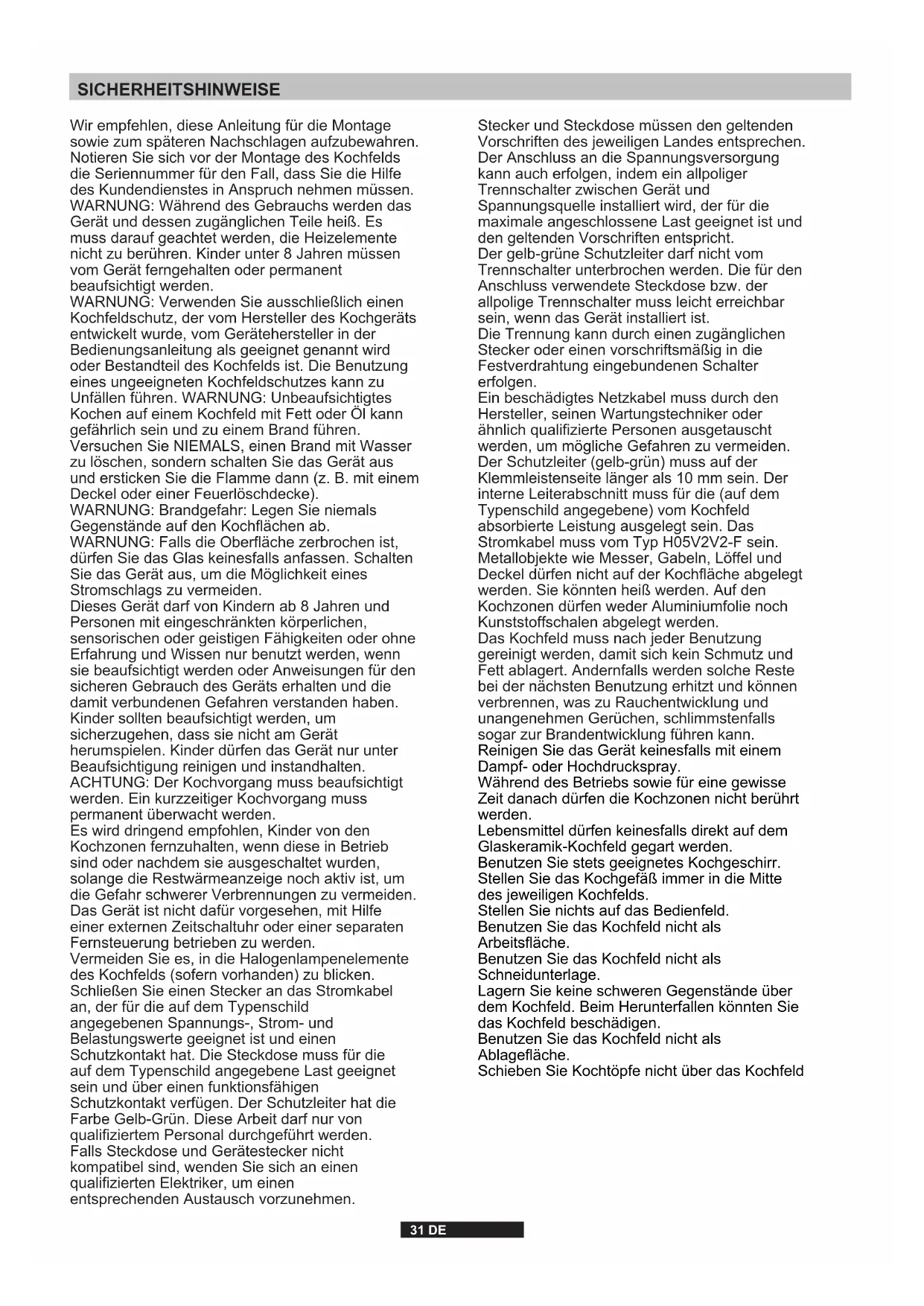 Wir empfehlen, diese Anleitung für die Montage sowie zum späteren Nachschlagen aufzubewahren. Notieren Sie sich vor der Montage des Kochfelds die Seriennummer für den Fall, dass Sie die Hilfe des Kundendienstes in Anspruch nehmen müssen. WARNUNG: Während des Gebrauchs werden das Gerät und dessen zugänglichen Teile heiß. Es muss darauf geachtet werden, die Heizelemente nicht zu berühren. Kinder unter 8 Jahren müssen vom Gerät ferngehalten oder permanent beaufsichtigt werden. WARNUNG: Verwenden Sie ausschließlich einen Kochfeldschutz, der vom Hersteller des Kochgeräts entwickelt wurde, vom Gerätehersteller in der Bedienungsanleitung als geeignet genannt wird oder Bestandteil des Kochfelds ist. Die Benutzung eines ungeeigneten Kochfeldschutzes kann zu Unfällen führen. WARNUNG: Unbeaufsichtigtes Kochen auf einem Kochfeld mit Fett oder Öl kann gefährlich sein und zu einem Brand führen. Versuchen Sie NIEMALS, einen Brand mit Wasser zu löschen, sondern schalten Sie das Gerät aus und ersticken Sie die Flamme dann (z. B. mit einem Deckel oder einer Feuerlöschdecke). WARNUNG: Brandgefahr: Legen Sie niemals Gegenstände auf den Kochflächen ab. WARNUNG: Falls die Oberfläche zerbrochen ist, dürfen Sie das Glas keinesfalls anfassen. Schalten Sie das Gerät aus, um die Möglichkeit eines Stromschlags zu vermeiden. Dieses Gerät darf von Kindern ab 8 Jahren und Personen mit eingeschränkten körperlichen, sensorischen oder geistigen Fähigkeiten oder ohne Erfahrung und Wissen nur benutzt werden, wenn sie beaufsichtigt werden oder Anweisungen für den sicheren Gebrauch des Geräts erhalten und die damit verbundenen Gefahren verstanden haben. Kinder sollten beaufsichtigt werden, um sicherzugehen, dass sie nicht am Gerät herumspielen. Kinder dürfen das Gerät nur unter Beaufsichtigung reinigen und instandhalten. ACHTUNG: Der Kochvorgang muss beaufsichtigt werden. Ein kurzzeitiger Kochvorgang muss permanent überwacht werden. Es wird dringend empfohlen, Kinder von den Kochzonen fernzuhalten, wenn diese in Betrieb sind oder nachdem sie ausgeschaltet wurden, solange die Restwärmeanzeige noch aktiv ist, um die Gefahr schwerer Verbrennungen zu vermeiden. Das Gerät ist nicht dafür vorgesehen, mit Hilfe einer externen Zeitschaltuhr oder einer separaten Fernsteuerung betrieben zu werden. Vermeiden Sie es, in die Halogenlampenelemente des Kochfelds (sofern vorhanden) zu blicken. Schließen Sie einen Stecker an das Stromkabel an, der für die auf dem Typenschild angegebenen Spannungs-, Strom- und Belastungswerte geeignet ist und einen Schutzkontakt hat. Die Steckdose muss für die auf dem Typenschild angegebene Last geeignet sein und über einen funktionsfähigen Schutzkontakt verfügen. Der Schutzleiter hat die Farbe Gelb-Grün. Diese Arbeit darf nur von qualifiziertem Personal durchgeführt werden. Falls Steckdose und Gerätestecker nicht kompatibel sind, wenden Sie sich an einen qualifizierten Elektriker, um einen entsprechenden Austausch vorzunehmen. Stecker und Steckdose müssen den geltenden Vorschriften des jeweiligen Landes entsprechen. Der Anschluss an die Spannungsversorgung kann auch erfolgen, indem ein allpoliger Trennschalter zwischen Gerät und Spannungsquelle installiert wird, der für die maximale angeschlossene Last geeignet ist und den geltenden Vorschriften entspricht. Der gelb-grüne Schutzleiter darf nicht vom Trennschalter unterbrochen werden. Die für den Anschluss verwendete Steckdose bzw. der allpolige Trennschalter muss leicht erreichbar sein, wenn das Gerät installiert ist. Die Trennung kann durch einen zugänglichen Stecker oder einen vorschriftsmäßig in die Festverdrahtung eingebundenen Schalter erfolgen. Ein beschädigtes Netzkabel muss durch den Hersteller, seinen Wartungstechniker oder ähnlich qualifizierte Personen ausgetauscht werden, um mögliche Gefahren zu vermeiden. Der Schutzleiter (gelb-grün) muss auf der Klemmleistenseite länger als 10 mm sein. Der interne Leiterabschnitt muss für die (auf dem Typenschild angegebene) vom Kochfeld absorbierte Leistung ausgelegt sein. Das Stromkabel muss vom Typ H05V2V2-F sein. Metallobjekte wie Messer, Gabeln, Löffel und Deckel dürfen nicht auf der Kochfläche abgelegt werden. Sie könnten heiß werden. Auf den Kochzonen dürfen weder Aluminiumfolie noch Kunststoffschalen abgelegt werden. Das Kochfeld muss nach jeder Benutzung gereinigt werden, damit sich kein Schmutz und Fett ablagert. Andernfalls werden solche Reste bei der nächsten Benutzung erhitzt und können verbrennen, was zu Rauchentwicklung und unangenehmen Gerüchen, schlimmstenfalls sogar zur Brandentwicklung führen kann. Reinigen Sie das Gerät keinesfalls mit einem Dampf- oder Hochdruckspray. Während des Betriebs sowie für eine gewisse Zeit danach dürfen die Kochzonen nicht berührt werden. Lebensmittel dürfen keinesfalls direkt auf dem Glaskeramik-Kochfeld gegart werden. Benutzen Sie stets geeignetes Kochgeschirr. Stellen Sie das Kochgefäß immer in die Mitte des jeweiligen Kochfelds. Stellen Sie nichts auf das Bedienfeld. Benutzen Sie das Kochfeld nicht als Arbeitsfläche. Benutzen Sie das Kochfeld nicht als Schneidunterlage. Lagern Sie keine schweren Gegenstände über dem Kochfeld. Beim Herunterfallen könnten Sie das Kochfeld beschädigen. Benutzen Sie das Kochfeld nicht als Ablagefläche. Schieben Sie Kochtöpfe nicht über das Kochfeld32 DE Dieses Gerät ist entsprechend der EU-Richtlinie 2012/19/EC für Elektro- und Elektronik-Altgeräte (WEEE) gekennzeichnet. Elektro- und Elektronik-Altgeräte enthalten sowohl umweltschädliche Stoffe (die negativen Folgen für die Umwelt verursachen) als auch wiederverwendbare Grundstoffe. Es ist wichtig, Elektro- und Elektronik-Altgeräte spezifischen Behandlungen zu unterziehen, um alle Schadstoffe zu entfernen und ordnungsgemäß zu entsorgen sowie alle Materialien zu recyceln. Jeder kann dazu beitragen, dass Altelektrogeräte nicht zu einem Umweltproblem werden. Daher sollten unbedingt ei