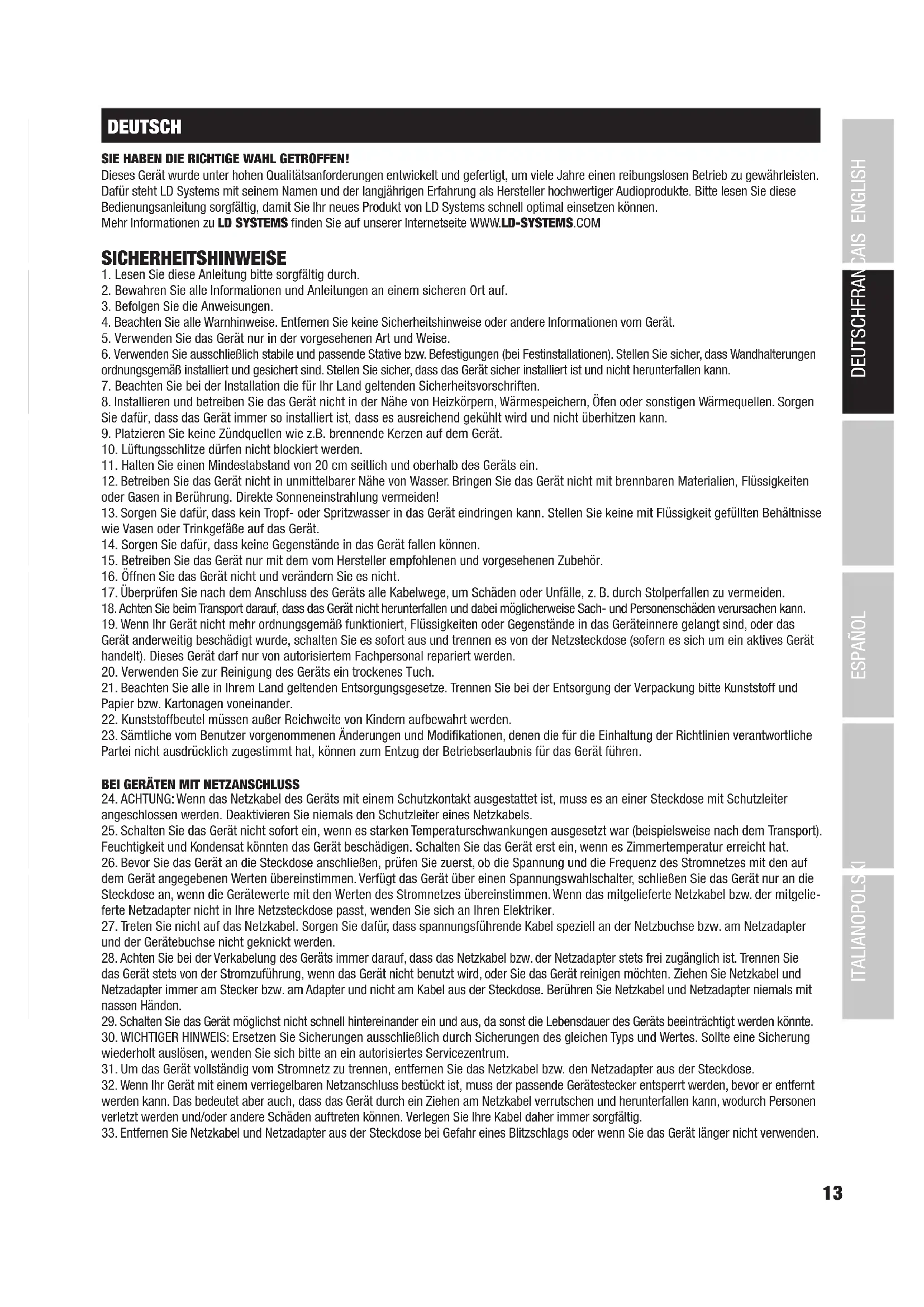 (Gültig in der Europäischen Union und anderen europäischen Ländern mit Mülltrennung) Dieses Symbol auf dem Produkt oder dazugehörigen Dokumenten weist darauf hin, dass das Gerät am Ende der Produktlebenszeit nicht zusammen mit dem normalen Hausmüll entsorgt werden darf, um Umwelt- oder Personenschäden durch unkontrollierte Abfallentsorgung zu vermeiden. Bitte entsorgen Sie dieses Produkt getrennt von anderen Abfällen und führen es zur Förderung nachhaltiger Wirtschaftskreisläufe dem Recycling zu. Als Pri- vatkunde erhalten Sie Informationen zu umweltfreundlichen Entsorgungsmöglichkeiten über den Händler, bei dem das Produkt erwor¬ben wurde, oder über die entsprechenden regionalen Behörden. Als gewerblicher Nutzer kontaktieren Sie bitte Ihren Lieferanten und prüfen die ggf. vertraglich vereinbarten Konditionen zur Entsorgung der Geräte. Dieses Produkt darf nicht zusammen mit anderen gewerblichen Abfällen entsorgt werden.22 ITALIANO POLSKI ESPAÑOL FRANCAIS DEUTSCHENGLISH CE-Konformität Hiermit erklärt die Adam Hall GmbH, dass dieses Produkt folgenden Richtlinien entspricht (soweit zutreffend): R&TTE (1999/5/EG) bzw. RED (2014/53/EU) ab Juni 2017 Niederspannungsrichtlinie (2014/35/EU) EMV-Richtlinie (2014/30/EU) RoHS (2011/65/EU) Die vollständige Konformitätserklärung finden Sie unter www.adamhall.com. Des Weiteren können Sie diese auch unter info@adamhall.com anfragen.23 DEUTSCHFRANCAIS ESPAÑOL ENGLISH ITALIANO POLSKI FRANCAIS VOUS AVEZ FAIT LE BON CHOIX! Cet appareil a été développé et fabriqué en appliquant des exigences de qualité très élevées : il garantit des années de fonctionnement sans problème. Grâce à de nombreuses années d‘expérience, LD Systems est un nom connu dans le domaine des produits audio haut de gamme. Veuillez lire attentivement ce Manuel Utilisateur : vous apprendrez rapidement à utiliser votre appareil LD Systems de façon optimale. Pour plus d‘informations sur LD Systems, visitez notre site Web, WWW.LD-SYSTEMS.COM