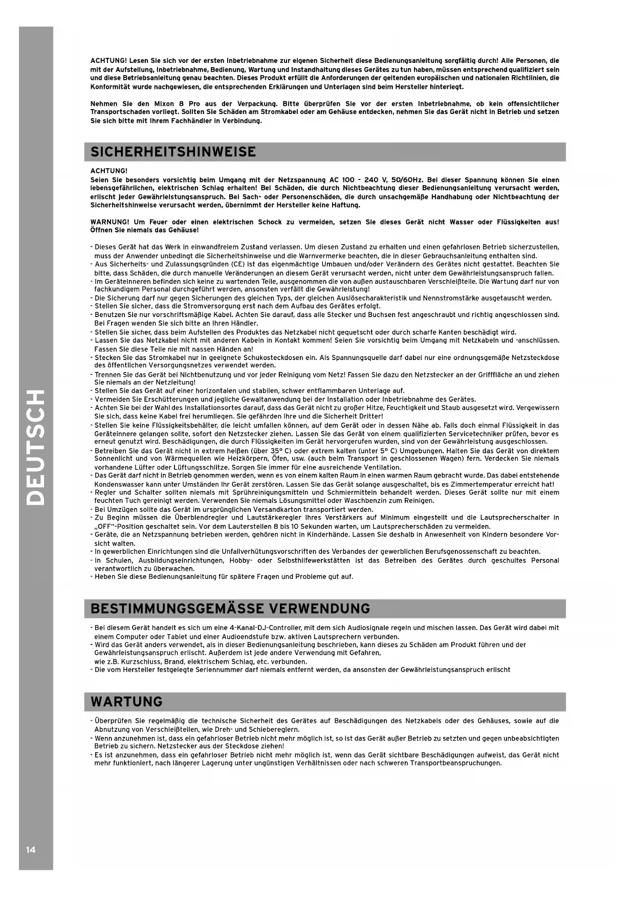 ACHTUNG! Lesen Sie sich vor der ersten Inbetriebnahme zur eigenen Sicherheit diese Bedienungsanleitung sorgfältig durch! Alle Personen, die mit der Aufstellung, Inbetriebnahme, Bedienung, Wartung und Instandhaltung dieses Gerätes zu tun haben, müssen entsprechend qualiziert sein und diese Betriebsanleitung genau beachten. Dieses Produkt erfüllt die Anforderungen der geltenden europäischen und nationalen Richtlinien, die Konformität wurde nachgewiesen, die entsprechenden Erklärungen und Unterlagen sind beim Hersteller hinterlegt. Nehmen Sie den Mixon 8 Pro aus der Verpackung. Bitte überprüfen Sie vor der ersten Inbetriebnahme, ob kein offensichtlicher Transportschaden vorliegt. Sollten Sie Schäden am Stromkabel oder am Gehäuse entdecken, nehmen Sie das Gerät nicht in Betrieb und setzen Sie sich bitte mit Ihrem Fachhändler in Verbindung. SICHERHEITSHINWEISE ACHTUNG! Seien Sie besonders vorsichtig beim Umgang mit der Netzspannung AC 100 - 240 V, 50/60Hz. Bei dieser Spannung können Sie einen lebensgefährlichen, elektrischen Schlag erhalten! Bei Schäden, die durch Nichtbeachtung dieser Bedienungsanleitung verursacht werden, erlischt jeder Gewährleistungsanspruch. Bei Sach- oder Personenschäden, die durch unsachgemäße Handhabung oder Nichtbeachtung der Sicherheitshinweise verursacht werden, übernimmt der Hersteller keine Haftung. WARNUNG! Um Feuer oder einen elektrischen Schock zu vermeiden, setzen Sie dieses Gerät nicht Wasser oder Flüssigkeiten aus! Öffnen Sie niemals das Gehäuse! - Dieses Gerät hat das Werk in einwandfreiem Zustand verlassen. Um diesen Zustand zu erhalten und einen gefahrlosen Betrieb sicherzustellen, muss der Anwender unbedingt die Sicherheitshinweise und die Warnvermerke beachten, die in dieser Gebrauchsanleitung enthalten sind. - Aus Sicherheits- und Zulassungsgründen (CE) ist das eigenmächtige Umbauen und/oder Verändern des Gerätes nicht gestattet. Beachten Sie bitte, dass Schäden, die durch manuelle Veränderungen an diesem Gerät verursacht werden, nicht unter dem Gewährleistungsanspruch fallen. - Im Geräteinneren benden sich keine zu wartenden Teile, ausgenommen die von außen austauschbaren Verschleißteile. Die Wartung darf nur von fachkundigem Personal durchgeführt werden, ansonsten verfällt die Gewährleistung! - Die Sicherung darf nur gegen Sicherungen des gleichen Typs, der gleichen Auslösecharakteristik und Nennstromstärke ausgetauscht werden. - Stellen Sie sicher, dass die Stromversorgung erst nach dem Aufbau des Gerätes erfolgt. - Benutzen Sie nur vorschriftsmäßige Kabel. Achten Sie darauf, dass alle Stecker und Buchsen fest angeschraubt und richtig angeschlossen sind. Bei Fragen wenden Sie sich bitte an Ihren Händler. - Stellen Sie sicher, dass beim Aufstellen des Produktes das Netzkabel nicht gequetscht oder durch scharfe Kanten beschädigt wird. - Lassen Sie das Netzkabel nicht mit anderen Kabeln in Kontakt kommen! Seien Sie vorsichtig beim Umgang mit Netzkabeln und -anschlüssen. Fassen Sie diese Teile nie mit nassen Händen an! - Stecken Sie das Stromkabel nur in geeignete Schukosteckdosen ein. Als Spannungsquelle darf dabei nur eine ordnungsgemäße Netzsteckdose des öffentlichen Versorgungsnetzes verwendet werden. - Trennen Sie das Gerät bei Nichtbenutzung und vor jeder Reinigung vom Netz! Fassen Sie dazu den Netzstecker an der Griffäche an und ziehen Sie niemals an der Netzleitung! - Stellen Sie das Gerät auf einer horizontalen und stabilen, schwer entammbaren Unterlage auf. - Vermeiden Sie Erschütterungen und jegliche Gewaltanwendung bei der Installation oder Inbetriebnahme des Gerätes. - Achten Sie bei der Wahl des Installationsortes darauf, dass das Gerät nicht zu großer Hitze, Feuchtigkeit und Staub ausgesetzt wird. Vergewissern Sie sich, dass keine Kabel frei herumliegen. Sie gefährden Ihre und die Sicherheit Dritter! - Stellen Sie keine Flüssigkeitsbehälter, die leicht umfallen können, auf dem Gerät oder in dessen Nähe ab. Falls doch einmal Flüssigkeit in das Geräteinnere gelangen sollte, sofort den Netzstecker ziehen. Lassen Sie das Gerät von einem qualizierten Servicetechniker prüfen, bevor es erneut genutzt wird. Beschädigungen, die durch Flüssigkeiten im Gerät hervorgerufen wurden, sind von der Gewährleistung ausgeschlossen. - Betreiben Sie das Gerät nicht in extrem heißen (über 35° C) oder extrem kalten (unter 5° C) Umgebungen. Halten Sie das Gerät von direktem Sonnenlicht und von Wärmequellen wie Heizkörpern, Öfen, usw. (auch beim Transport in geschlossenen Wagen) fern. Verdecken Sie niemals vorhandene Lüfter oder Lüftungsschlitze. Sorgen Sie immer für eine ausreichende Ventilation. - Das Gerät darf nicht in Betrieb genommen werden, wenn es von einem kalten Raum in einen warmen Raum gebracht wurde. Das dabei entstehende Kondenswasser kann unter Umständen Ihr Gerät zerstören. Lassen Sie das Gerät solange ausgeschaltet, bis es Zimmertemperatur erreicht hat! - Regler und Schalter sollten niemals mit Sprühreinigungsmitteln und Schmiermitteln behandelt werden. Dieses Gerät sollte nur mit einem feuchten Tuch gereinigt werden. Verwenden Sie niemals Lösungsmittel oder Waschbenzin zum Reinigen. - Bei Umzügen sollte das Gerät im ursprünglichen Versandkarton transportiert werden. - Zu Beginn müssen die Überblendregler und Lautstärkeregler Ihres Verstärkers auf Minimum eingestellt und die Lautsprecherschalter in „OFF“-Position geschaltet sein. Vor dem Lauterstellen 8 bis 10 Sekunden warten, um Lautsprecherschäden zu vermeiden. - Geräte, die an Netzspannung betrieben werden, gehören nicht in Kinderhände. Lassen Sie deshalb in Anwesenheit von Kindern besondere Vor- sicht walten. - In gewerblichen Einrichtungen sind die Unfallverhütungsvorschriften des Verbandes der gewerblichen Berufsgenossenschaft zu beachten. - In Schulen, Ausbildungseinrichtungen, Hobby- oder Selbsthilfewerkstätten ist das Betreiben des Gerätes durch geschultes Personal verantwortlic