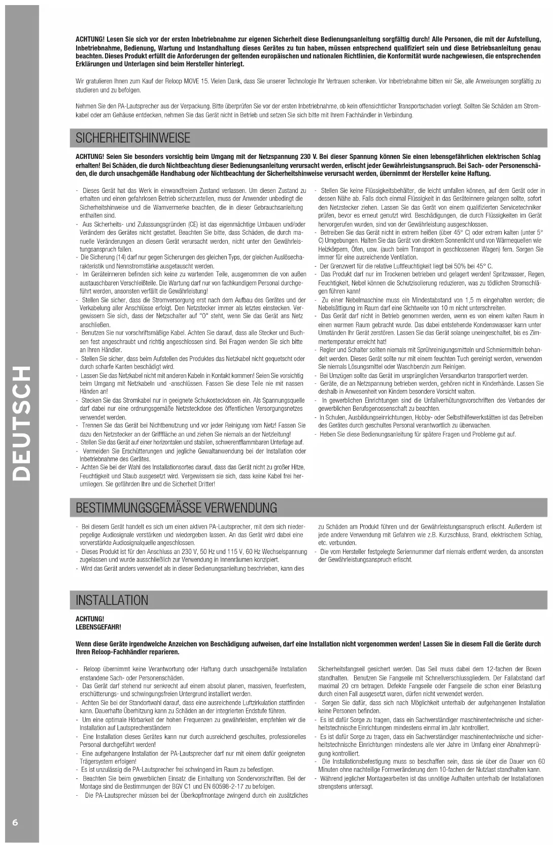 zu Schäden am Produkt führen und der Gewährleistungsanspruch erlischt. Außerdem ist jede andere Verwendung mit Gefahren wie z.B. Kurzschluss, Brand, elektrischem Schlag, etc. verbunden. - Die vom Hersteller festgelegte Seriennummer darf niemals entfernt werden, da ansonsten der Gewährleistungsanspruch erlischt. INSTALLATION ACHTUNG! LEBENSGEFAHR! Wenn diese Geräte irgendwelche Anzeichen von Beschädigung aufweisen, darf eine Installation nicht vorgenommen werden! Lassen Sie in diesem Fall die Geräte durch Ihren Reloop-Fachhändler reparieren. - Reloop übernimmt keine Verantwortung oder Haftung durch unsachgemäße Installation enstandene Sach- oder Personenschäden. - Das Gerät darf stehend nur senkrecht auf einem absolut planen, massiven, feuerfestem, erschütterungs- und schwingungsfreien Untergrund installiert werden. - Achten Sie bei der Standortwahl darauf, dass eine ausreichende Luftzirkulation stattnden kann. Dauerhafte Überhitzung kann zu Schäden an der integrierten Endstufe führen. - Um eine optimale Hörbarkeit der hohen Frequenzen zu gewährleisten, empfehlen wir die Installation auf Lautsprecherständern - Eine Installation dieses Gerätes kann nur durch ausreichend geschultes, professionelles Personal durchgeführt werden! - Eine aufgehangene Installation der PA-Lautsprecher darf nur mit einem dafür geeigneten Trägersystem erfolgen! - Es ist unzulässig die PA-Lautsprecher frei schwingend im Raum zu befestigen. - Beachten Sie beim gewerblichen Einsatz die Einhaltung von Sondervorschriften. Bei der Montage sind die Bestimmungen der BGV C1 und EN 60598-2-17 zu befolgen. - Die PA-Lautsprecher müssen bei der Überkopfmontage zwingend durch ein zusätzliches Sicherheitsfangseil gesichert werden. Das Seil muss dabei dem 12-fachen der Boxen standhalten. Benutzen Sie Fangseile mit Schnellverschlussgliedern. Der Fallabstand darf maximal 20 cm betragen. Defekte Fangseile oder Fangseile die schon einer Belastung durch einen Fall ausgesetzt waren, dürfen nicht verwendet werden. - Sorgen Sie dafür, dass sich nach Möglichkeit unterhalb der aufgehangenen Installation keine Personen benden. - Es ist dafür Sorge zu tragen, dass ein Sachverständiger maschinentechnische und sicher- heitstechnische Einrichtungen mindestens einmal im Jahr kontrolliert. - Es ist dafür Sorge zu tragen, dass ein Sachverständiger maschinentechnische und sicher- heitstechnische Einrichtungen mindestens alle vier Jahre im Umfang einer Abnahmeprü- gung kontrolliert. - Die Installationsbefestigung muss so beschaffen sein, dass sie über die Dauer von 60 Minuten ohne nachteilige Formveränderung dem 10-fachen der Nutzlast standhalten kann. - Während jeglicher Montagearbeiten ist das unnötige Aufhalten unterhalb der Installationen strengstens untersagt.7 DEUTSCH WARTUNG - Überprüfen Sie regelmäßig die technische Sicherheit des Gerätes auf Beschädigungen des Netzkabels oder des Gehäuses, sowie auf die Abnutzung von Verschleißteilen wie Dreh- und Schiebereglern. - Wenn anzunehmen ist, dass ein gefahrloser Betrieb nicht mehr möglich ist, so ist das Gerät außer Betrieb zu setzten und gegen unbeabsichtigten Betrieb zu sichern. Netzstecker aus der Steckdose ziehen!
