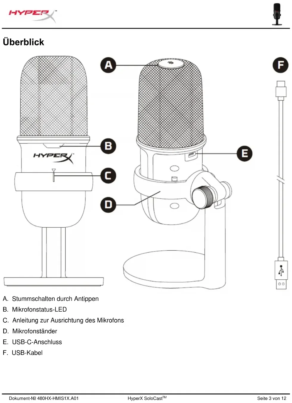 Überblick A. Stummschalten durch Antippen B. Mikrofonstatus-LED C. Anleitung zur Ausrichtung des Mikrofons D. Mikrofonständer E. USB-C-Anschluss F. USB-KabelDokument-Nr. 480HX-HMIS1X.A01 HyperX SoloCast
