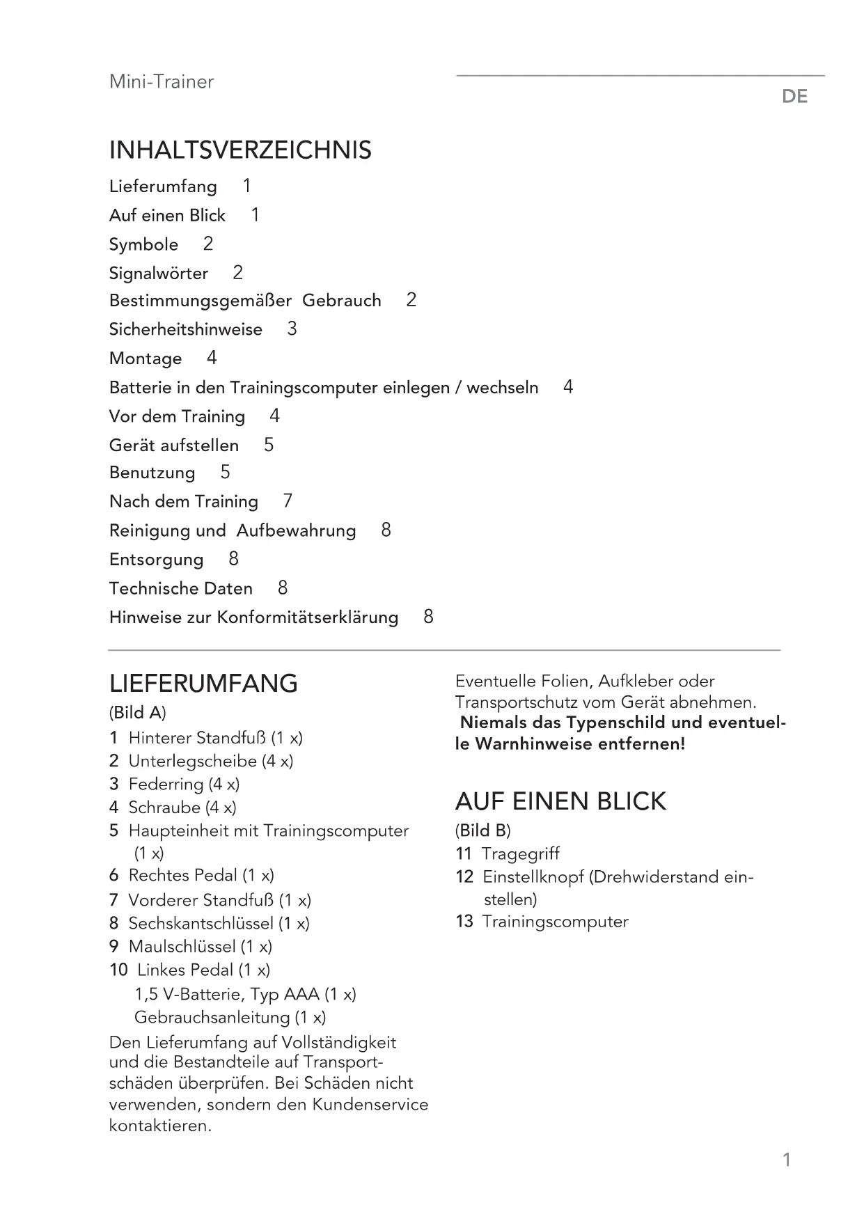 INHALTSVERZEICHNIS Lieferumfang 1 Auf einen Blick 1 Symbole 2 Signalwörter 2 Bestimmungsgemäßer Gebrauch 2 Sicherheitshinweise 3 Montage 4 Batterie in den Trainingscomputer einlegen / wechseln 4 Vor dem Training 4 Gerät aufstellen 5 Benutzung 5 Nach dem Training 7 Reinigung und Aufbewahrung 8 Entsorgung 8 Technische Daten 8 Hinweise zur Konformitätserklärung 8 LIEFERUMFANG (Bild A) 1 Hinterer Standfuß (1 x) 2 Unterlegscheibe (4 x) 3 Federring (4 x) 4 Schraube (4 x) 5 Haupteinheit mit Trainingscomputer (1 x) 6 Rechtes Pedal (1 x) 7 Vorderer Standfuß (1 x) 8 Sechskantschlüssel (1 x) 9 Maulschlüssel (1 x) 10 Linkes Pedal (1 x) 1,5 V-Batterie, Typ AAA (1 x) Gebrauchsanleitung (1 x) Den Lieferumfang auf Vollständigkeit und die Bestandteile auf Transport- schäden überprüfen. Bei Schäden nicht verwenden, sondern den Kundenservice kontaktieren. Eventuelle Folien, Aufkleber oder Transportschutz vom Gerät abnehmen. Niemals das Typenschild und eventuel- le Warnhinweise entfernen!