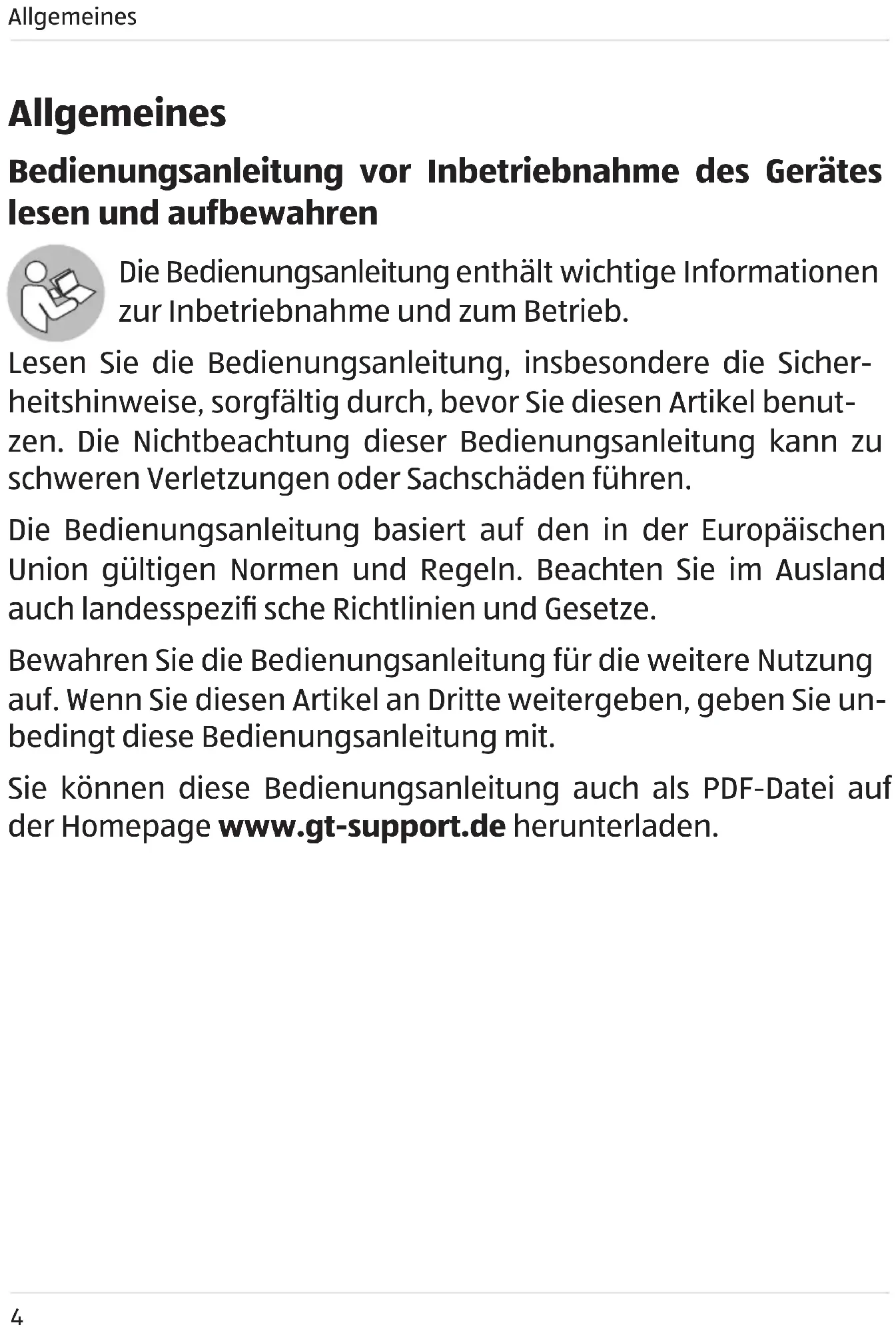 - Bedienungsanleitung vor Inbetriebnahme des Gerätes lesen und aufbewahren p. 4