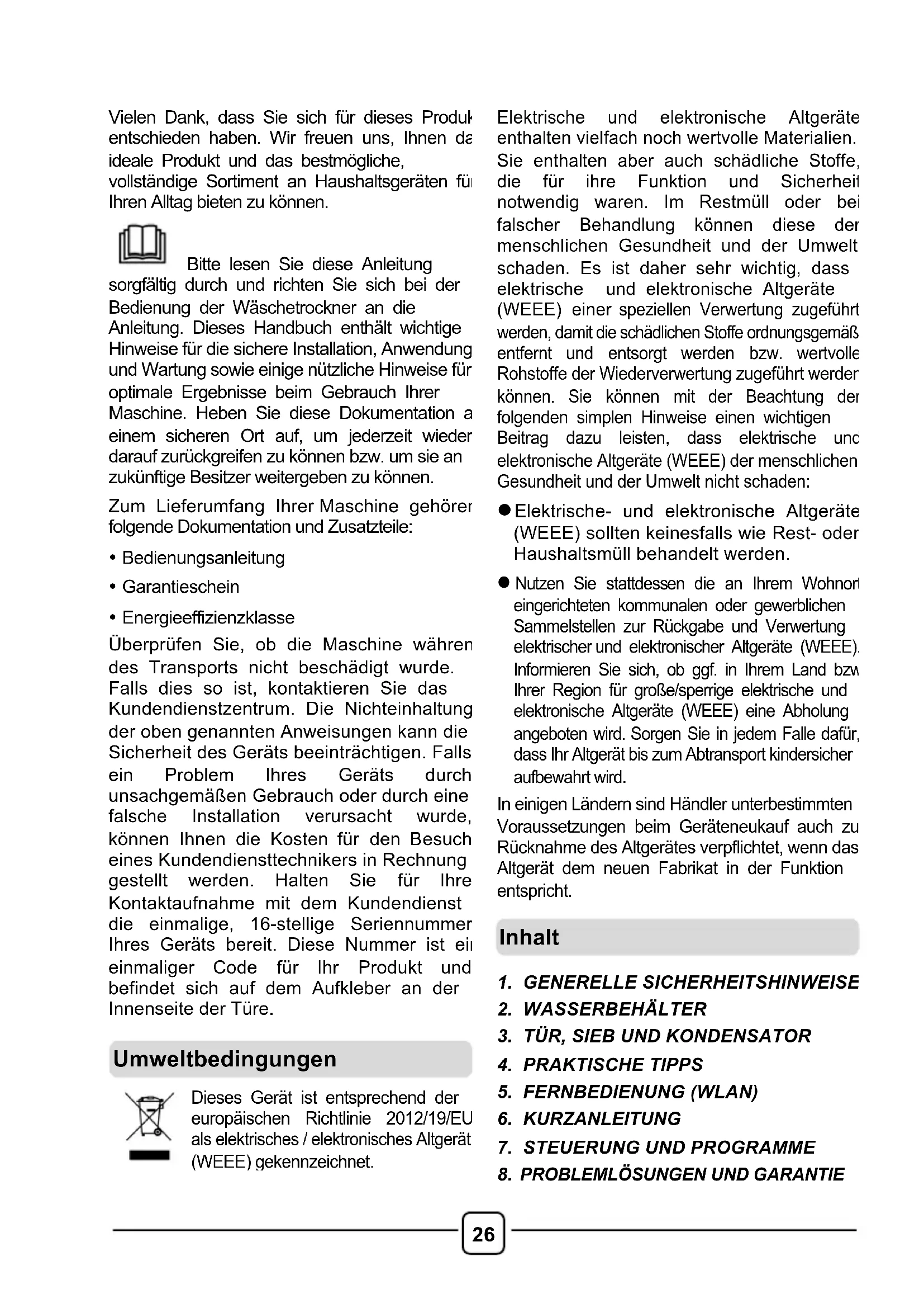 Vielen Dank, dass Sie sich für dieses Produkt entschieden haben. Wir freuen uns, Ihnen das ideale Produkt und das bestmögliche, vollständige Sortiment an Haushaltsgeräten für Ihren Alltag bieten zu können. Bitte lesen Sie diese Anleitung sorgfältig durch und richten Sie sich bei der Bedienung der Wäschetrockner an die Anleitung. Dieses Handbuch enthält wichtige Hinweise für die sichere Installation, Anwendung und Wartung sowie einige nützliche Hinweise für optimale Ergebnisse beim Gebrauch Ihrer Maschine. Heben Sie diese Dokumentation an einem sicheren Ort auf, um jederzeit wieder darauf zurückgreifen zu können bzw. um sie an zukünftige Besitzer weitergeben zu können. Zum Lieferumfang Ihrer Maschine gehören folgende Dokumentation und Zusatzteile: