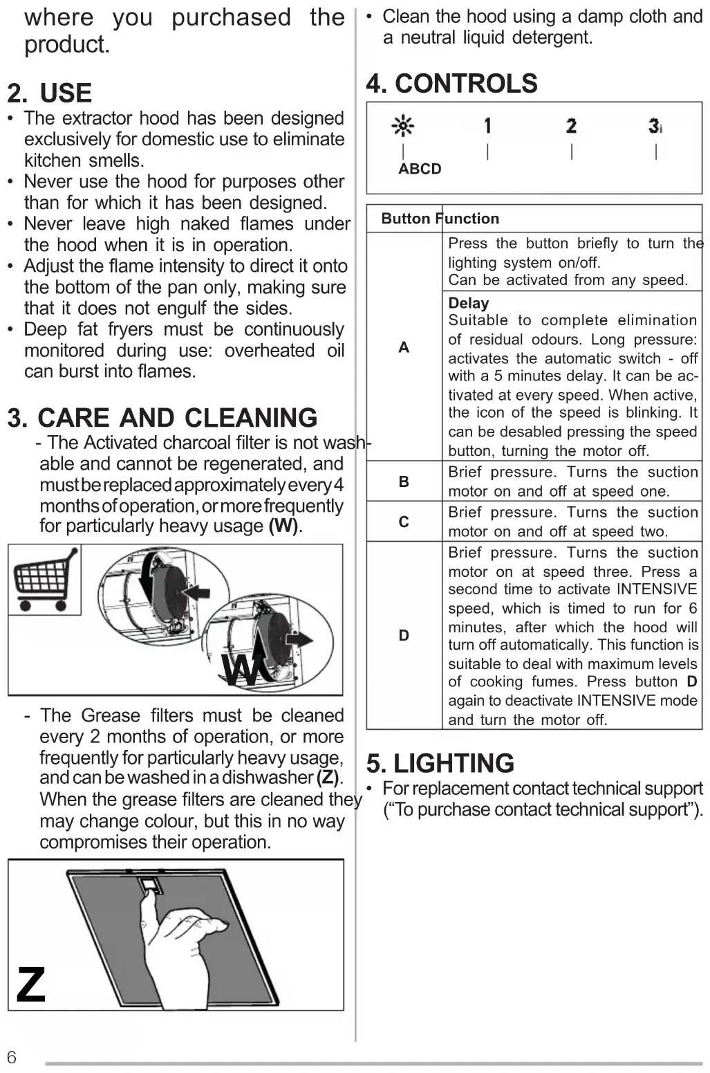 Schaltet die Beleuchtung mit kurzem Drücken der Taste ein/aus. Von jeder Betriebsgeschwindigkeit aus aktivierbar. Nachlauf Vervollständigt die Beseitigung von Restgerüchen. Kann bei jeder Be- triebsgeschwindigkeit aktiviert wer- den. Mit anhaltendem Drücken wird das um 5 Minuten verzögerte, auto- matische Abschalten aktiviert. Wenn aktiviert, blinkt die Ikone der Ge- schwindigkeit. Wird durch Betätigen der Taste für Geschwindigkeit und Abschalten des Motors deaktiviert.