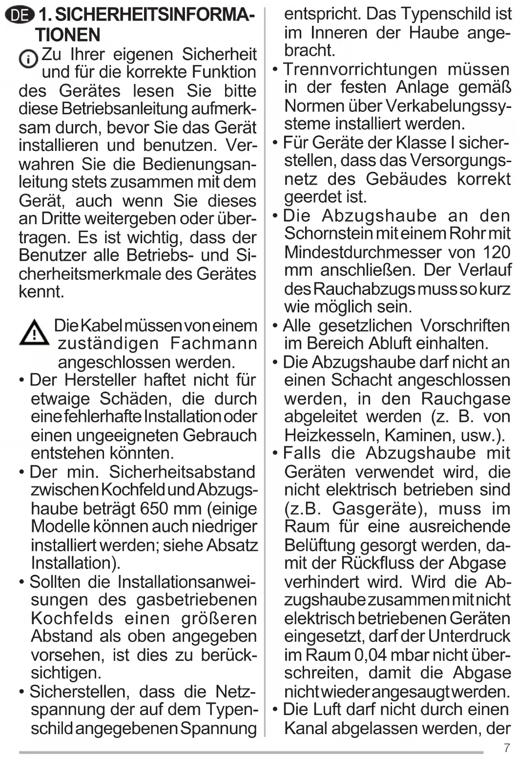 - Falls die Abzugshaube mit Geräten verwendet wird, die nicht elektrisch betrieben sind (z.B. Gasgeräte), muss im Raum für eine ausreichende Belüftung gesorgt werden, da- mit der Rückuss der Abgase verhindert wird. Wird die Ab- zugshaube zusammen mit nicht elektrisch betriebenen Geräten eingesetzt, darf der Unterdruck im Raum 0,04 mbar nicht über- schreiten, damit die Abgase nicht wieder angesaugt werden.