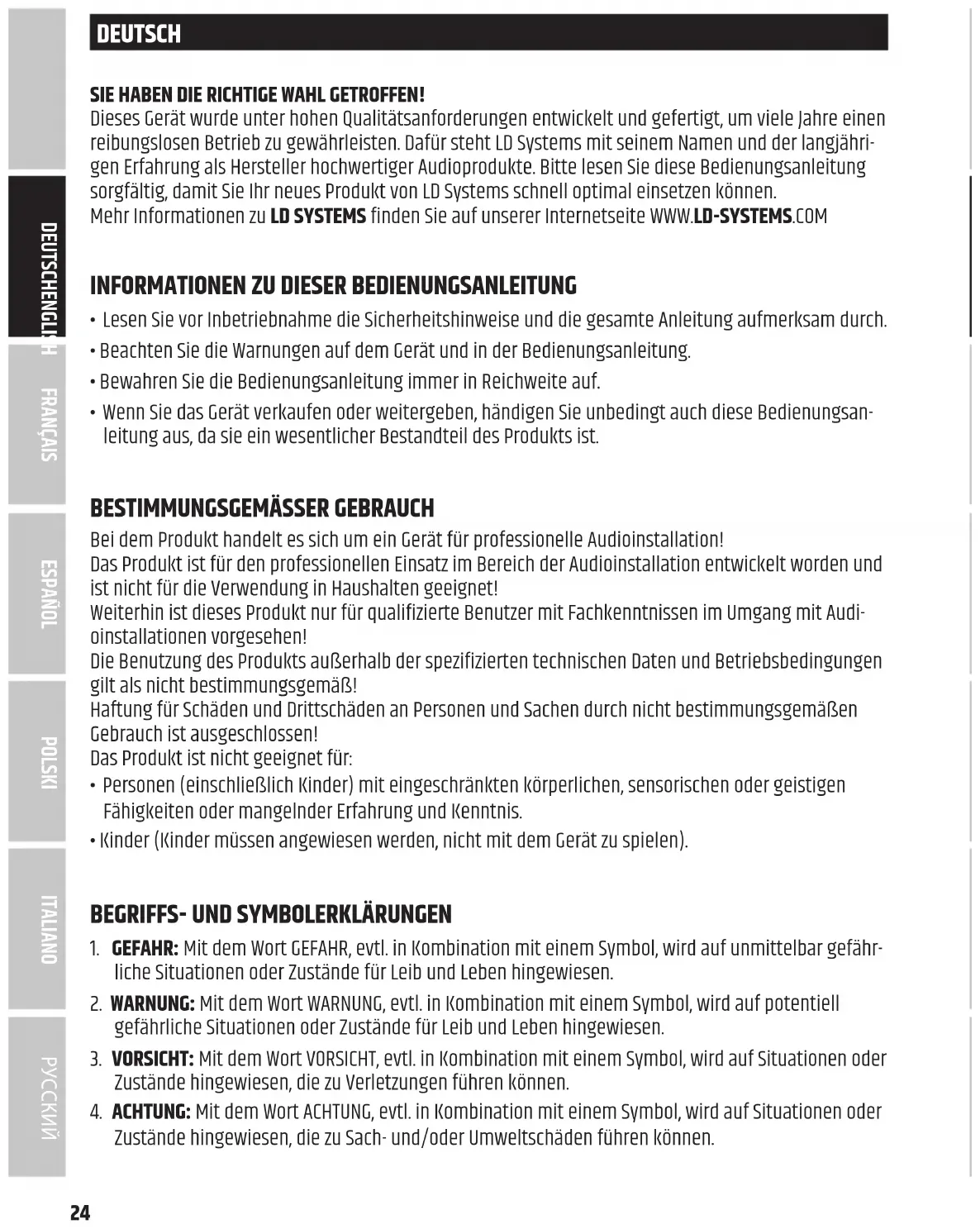Adam Hall GmbH hereby confirms that this radio equipment complies with Directive 2014/53/EU. The full text of the EU declaration of conformity is available at: www.adamhall.com/compliance/ Printing errors and mistakes, as well as technical or other changes are reserved! DEUTSCHFRANÇAIS ESPAÑOL ENGLISH ITALIANO POLSKI РУССКИЙ24 DEUTSCH SIE HABEN DIE RICHTIGE WAHL GETROFFEN! Dieses Gerät wurde unter hohen Qualitätsanforderungen entwickelt und gefertigt, um viele Jahre einen reibungslosen Betrieb zu gewährleisten. Dafür steht LD Systems mit seinem Namen und der langjähri- gen Erfahrung als Hersteller hochwertiger Audioprodukte. Bitte lesen Sie diese Bedienungsanleitung sorgfältig, damit Sie Ihr neues Produkt von LD Systems schnell optimal einsetzen können. Mehr Informationen zu LD SYSTEMS finden Sie auf unserer Internetseite WWW.LD-SYSTEMS.COM