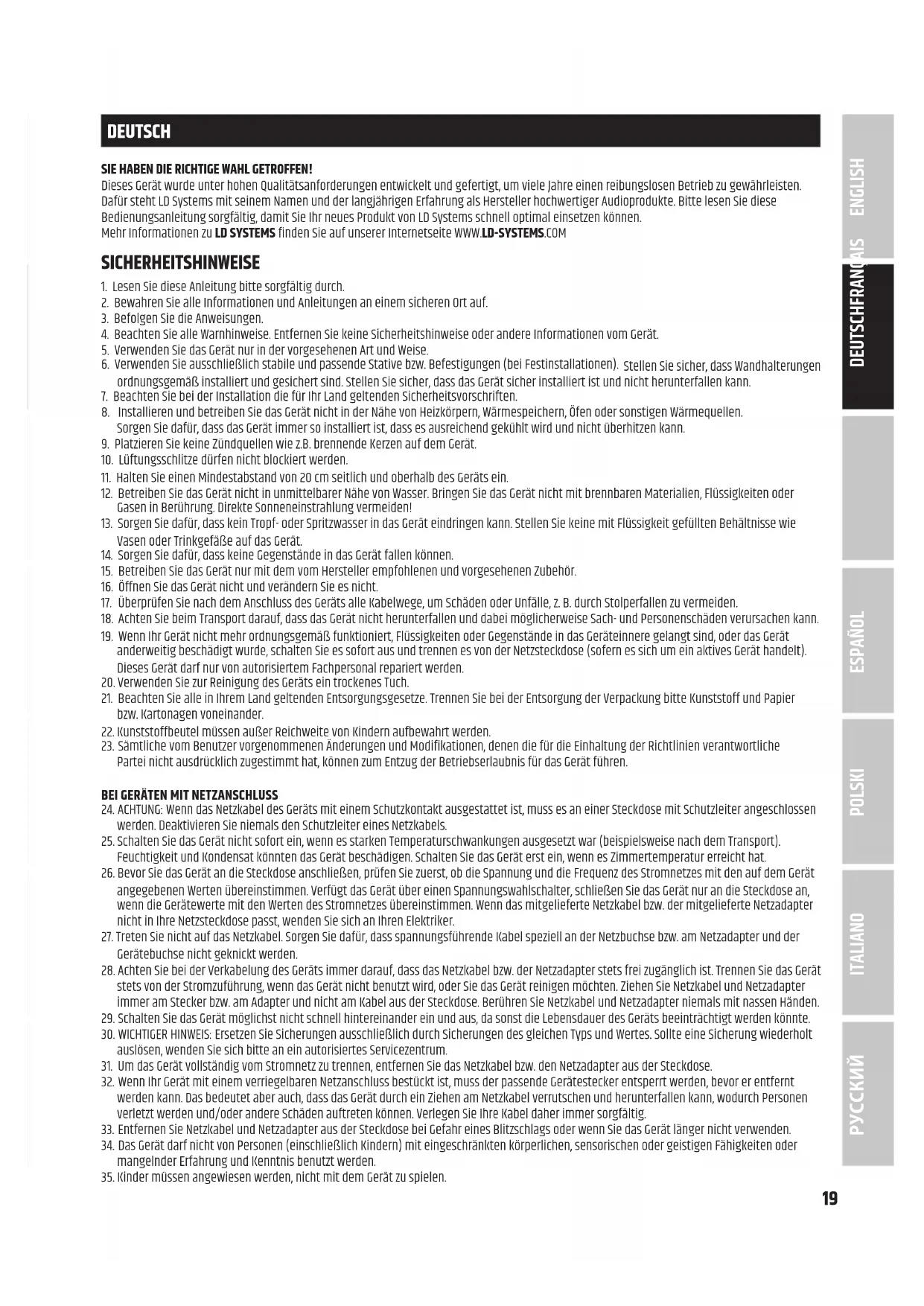 POLSKI ESPAÑOL FRANÇAIS DEUTSCHENGLISH19 DEUTSCH SIE HABEN DIE RICHTIGE WAHL GETROFFEN! Dieses Gerät wurde unter hohen Qualitätsanforderungen entwickelt und gefertigt, um viele Jahre einen reibungslosen Betrieb zu gewährleisten. Dafür steht LD Systems mit seinem Namen und der langjährigen Erfahrung als Hersteller hochwertiger Audioprodukte. Bitte lesen Sie diese Bedienungsanleitung sorgfältig, damit Sie Ihr neues Produkt von LD Systems schnell optimal einsetzen können. Mehr Informationen zu LD SYSTEMS finden Sie auf unserer Internetseite WWW.LD-SYSTEMS.COM SICHERHEITSHINWEISE