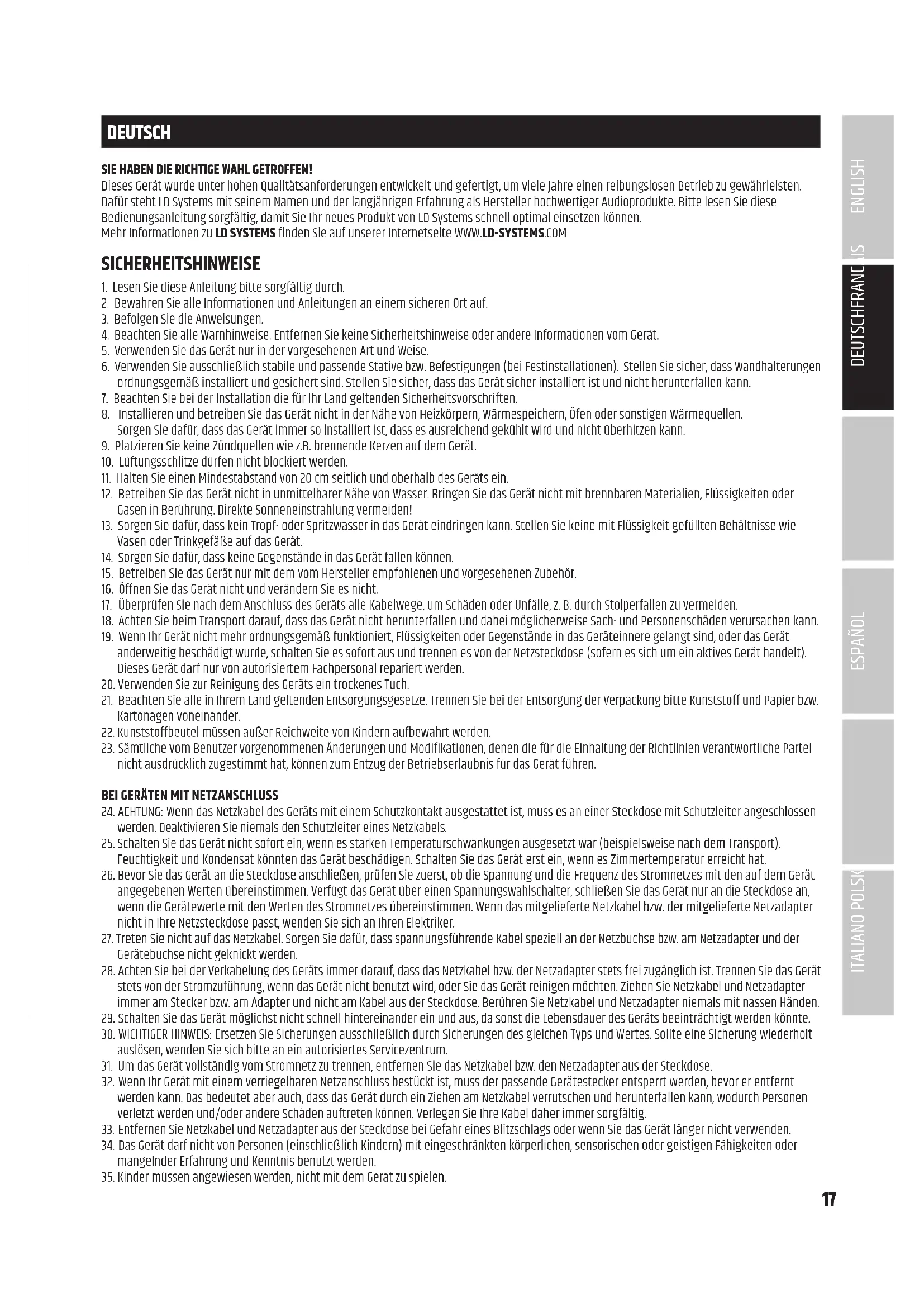 Hereby, Adam Hall GmbH declares that this radio equipment type is in compliance with Directive 2014/53/EU. The full text of the EU declaration of conformity is available at the following internet address: www.adamhall.com/compliance/17 DEUTSCHFRANCAIS ESPAÑOL ENGLISH ITALIANO POLSKI DEUTSCH SIE HABEN DIE RICHTIGE WAHL GETROFFEN! Dieses Gerät wurde unter hohen Qualitätsanforderungen entwickelt und gefertigt, um viele Jahre einen reibungslosen Betrieb zu gewährleisten. Dafür steht LD Systems mit seinem Namen und der langjährigen Erfahrung als Hersteller hochwertiger Audioprodukte. Bitte lesen Sie diese Bedienungsanleitung sorgfältig, damit Sie Ihr neues Produkt von LD Systems schnell optimal einsetzen können. Mehr Informationen zu LD SYSTEMS finden Sie auf unserer Internetseite WWW.LD-SYSTEMS.COM SICHERHEITSHINWEISE