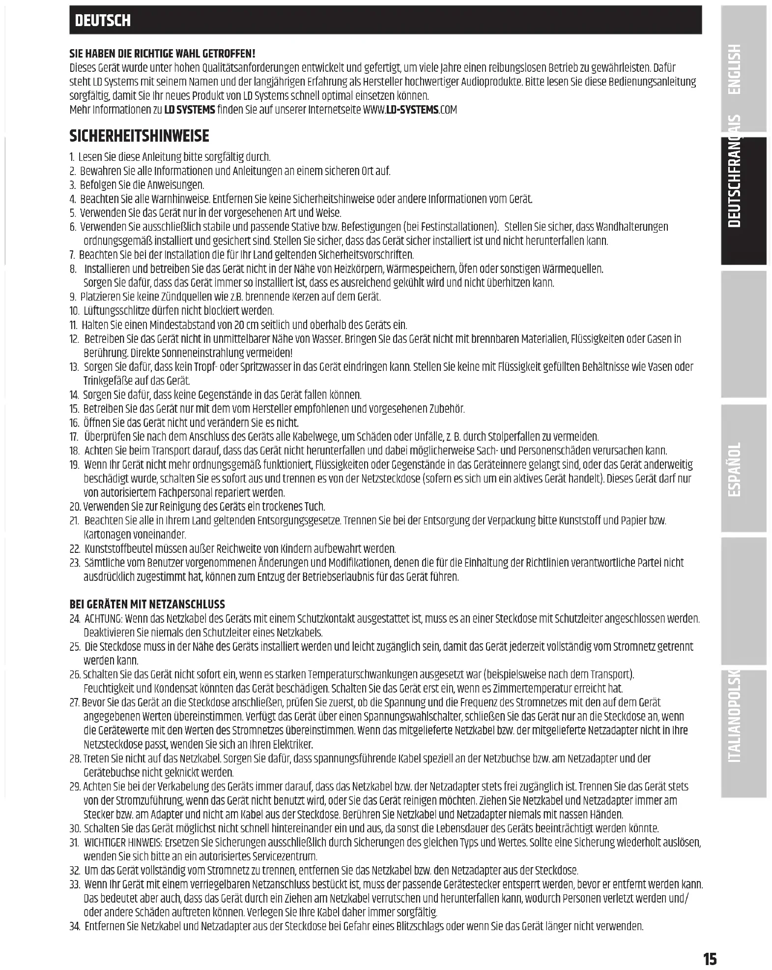 Hereby, Adam Hall GmbH declares that this radio equipment type is in compliance with Directive 2014/53/EU. The full text of the EU declaration of conformity is available at the following internet address: www.adamhall.com/compliance/ Printing errors and mistakes, as well as technical or other changes are reserved! ITALIANO POLSKI ESPAÑOL FRANÇAIS DEUTSCHENGLISH15 DEUTSCH SIE HABEN DIE RICHTIGE WAHL GETROFFEN! Dieses Gerät wurde unter hohen Qualitätsanforderungen entwickelt und gefertigt, um viele Jahre einen reibungslosen Betrieb zu gewährleisten. Dafür steht LD Systems mit seinem Namen und der langjährigen Erfahrung als Hersteller hochwertiger Audioprodukte. Bitte lesen Sie diese Bedienungsanleitung sorgfältig, damit Sie Ihr neues Produkt von LD Systems schnell optimal einsetzen können. Mehr Informationen zu LD SYSTEMS finden Sie auf unserer Internetseite WWW.LD-SYSTEMS.COM SICHERHEITSHINWEISE