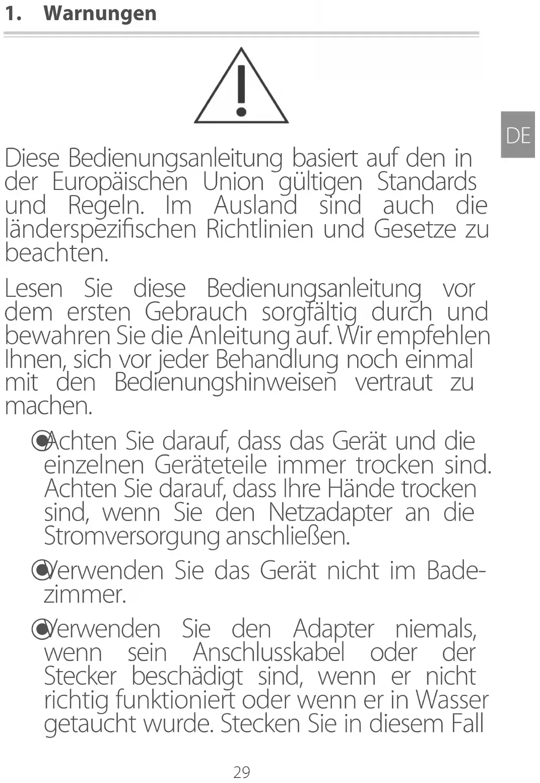 Achten Sie darauf, dass das Gerät und die einzelnen Geräteteile immer trocken sind. Achten Sie darauf, dass Ihre Hände trocken sind, wenn Sie den Netzadapter an die Stromversorgung anschließen.