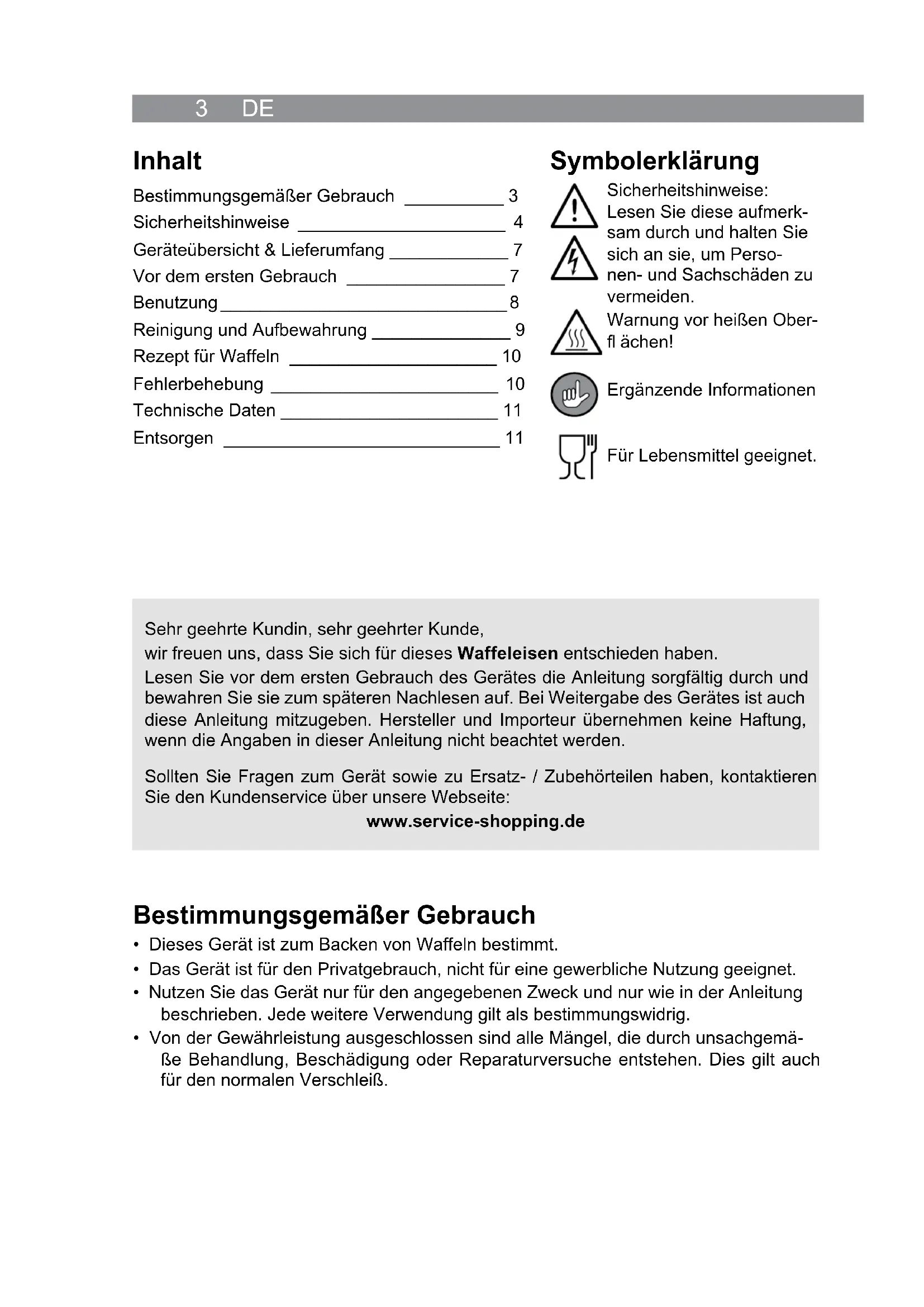 - Von der Gewährleistung ausgeschlossen sind alle Mängel, die durch unsachgemä- ße Behandlung, Beschädigung oder Reparaturversuche entstehen. Dies gilt auch für den normalen Verschleiß. Inhalt Bestimmungsgemäßer Gebrauch __________ 3 Sicherheitshinweise _____________________ 4 Geräteübersicht & Lieferumfang ____________ 7 Vor dem ersten Gebrauch ________________ 7 Benutzung _____________________________ 8 Reinigung und Aufbewahrung ______________ 9 Rezept für Waffeln _____________________ 10 Fehlerbehebung _______________________ 10 Technische Daten ______________________ 11 Entsorgen ____________________________ 11 Symbolerklärung Sicherheitshinweise: Lesen Sie diese aufmerk- sam durch und halten Sie sich an sie, um Perso- nen- und Sachschäden zu vermeiden. Warnung vor heißen Ober- fl ächen! Ergänzende Informationen Für Lebensmittel geeignet. Sehr geehrte Kundin, sehr geehrter Kunde, wir freuen uns, dass Sie sich für dieses Waffeleisen entschieden haben. Lesen Sie vor dem ersten Gebrauch des Gerätes die Anleitung sorgfältig durch und bewahren Sie sie zum späteren Nachlesen auf. Bei Weitergabe des Gerätes ist auch diese Anleitung mitzugeben. Hersteller und Importeur übernehmen keine Haftung, wenn die Angaben in dieser Anleitung nicht beachtet werden. Sollten Sie Fragen zum Gerät sowie zu Ersatz- / Zubehörteilen haben, kontaktieren Sie den Kundenservice über unsere Webseite: www.service-shopping.deDE 4 Sicherheitshinweise ■ Dieses Gerät kann von Kindern ab 8 Jahren sowie von Perso- nen mit reduzierten physischen, sensorischen oder mentalen Fähigkeiten oder Mangel an Erfahrung und/oder Wissen benutzt werden, wenn sie beaufsichtigt oder bezüglich des sicheren Ge- brauchs des Gerätes unterwiesen wurden und die daraus resul- tierenden Gefahren verstanden haben. ■ Kinder dürfen nicht mit dem Gerät spielen. ■ Reinigung und Benutzer-Wartung dürfen nicht durch Kinder durchgeführt werden, es sei denn, sie sind älter als 8 Jahre und werden beaufsichtigt. ■ Kinder jünger als 8 Jahre und Tiere sind vom Gerät und dem Netzkabel fernzuhalten. Warnung vor heißen Oberfl ächen! Das Gerät wird wäh- rend des Gebrauchs sehr heiß. Achten Sie unbedingt da- rauf, dass Sie während und nach der Benutzung des Ge- rätes nicht mit aufgeheizten Teilen in Berührung kommen. Berühren Sie ausschließlich die Griffe, während das Gerät in Betrieb ist oder unmittelbar nach dem Ausschalten. Wir empfehlen Küchenhandschuhe für den Umgang mit dem Gerät. Transportieren bzw. verstauen Sie das Gerät nur, wenn es vollständig abgekühlt ist. Das Gerät darf während des Betriebes nicht bewegt werden. ■ Das Gerät ist bei nicht vorhandener Aufsicht und vor dem Zu- sammenbau, dem Auseinandernehmen oder Reinigen stets vom Netz zu trennen. ■ Überprüfen Sie das Gerät vor jeder Inbetriebnahme auf Beschä- digungen. Wenn das Gerät, das Kabel oder der Stecker sicht- bare Schäden aufweisen, darf das Gerät nicht benutzt werden. Verwenden Sie das Gerät nicht, wenn es eine Fehlfunktion hatte oder heruntergefallen ist. Lassen Sie es dann durch eine autori- sierte Servicestelle überprüfen. ■ Nehmen Sie keine Veränderungen am Gerät vor. Tauschen Sie auch das Netzkabel nicht selbst aus. Wenn das Gerät, das Netzkabel oder der Stecker des Gerätes beschädigt ist, muss es durch den Hersteller oder Kundenservice oder eine ähnlich5 DE qualifi zierte Person (z. B. Fachwerkstatt) ersetzt werden, um Ge- fährdungen zu vermeiden. ■ Das Gerät ist nicht dazu bestimmt, mit einer externen Zeitschalt- uhr oder einem separaten Fernwirksystem betrieben zu werden. ■ ACHTUNG: Reinigungshinweise im Kapitel „Reinigung und Auf- bewahrung“ beachten! Verletzungsgefahren ■ Halten Sie Kinder und Tiere vom Gerät und Verpackungsmaterial fern! Es besteht Verletzungs- und Erstickungsgefahr. ■ ACHTUNG Verbrühungsgefahr durch Hitze und heißen Dampf! Während des Betriebes kann heißer Dampf aus dem Gerät austreten. Halten Sie Kopf und Hände daher aus der Gefahrenzone fern. ■ Achten Sie darauf, dass das angeschlossene Netzkabel keine Stolpergefahr dar- stellt. Das Kabel darf nicht von der Aufstellfl äche herabhängen, um ein Herunterrei- ßen des Gerätes zu verhindern. ■ Lassen Sie das Gerät immer genügend abkühlen, bevor Sie es reinigen und / oder verstauen. Stromschlag- und Brandgefahr ■ Verwenden Sie das Gerät nur in geschlossenen Räumen. ■ Benutzen Sie das Gerät nicht, wenn leicht entzündliche Gase in der Luft vorhanden sind. Betreiben Sie das Gerät nie in der Nähe einer Gasquelle. ■ Decken Sie das Gerät während des Betriebs nicht ab, um einen Gerätebrand zu vermeiden. Sorgen Sie für ausreichende Belüftung, während das Gerät in Betrieb ist. ■ Legen Sie keine brennbaren oder leicht schmelzende Materialien (z. B. Pappe, Kunststoff, Papier oder Kerzen) auf oder in das Gerät. ■ Stellen und verwenden Sie das Gerät nicht in der Nähe von leicht entzündbaren Ma- terialien (Gardinen, Textilien, etc.). ■ Stellen Sie das Gerät immer mit ausreichendem Freiraum zu allen Seiten und Frei- raum nach oben auf, um Hitzestaus zu vermeiden. ■ Verwenden Sie das Gerät nicht in der Nähe von Wasser oder anderen Flüssigkeiten, um Stromschläge zu vermeiden. Stellen Sie das Gerät so auf, dass das Netzkabel und der Stecker nicht mit Wasser oder anderen Flüssigkeiten in Berührung kommen können. ■ Tauchen Sie Gerät und Kabel niemals in Wasser oder andere Flüssigkeiten ein. Sollte das Gerät in Wasser fallen, unterbrechen Sie sofort die Stromzufuhr. Versu- chen Sie nicht, das Gerät aus dem Wasser zu ziehen, während es am Stromnetz angeschlossen ist! ■ Berühren Sie das Gerät, das Netzkabel und den Stecker niemals mit feuchten Hän- den, wenn diese Komponenten an das Stromnetz angeschlossen sind. ■ Schließen Sie das Gerät nur an eine vorschriftsmäßig installierte Steckdose mit Schutzkontakten an. Die Steckdose muss auch nach dem Anschließen gut z