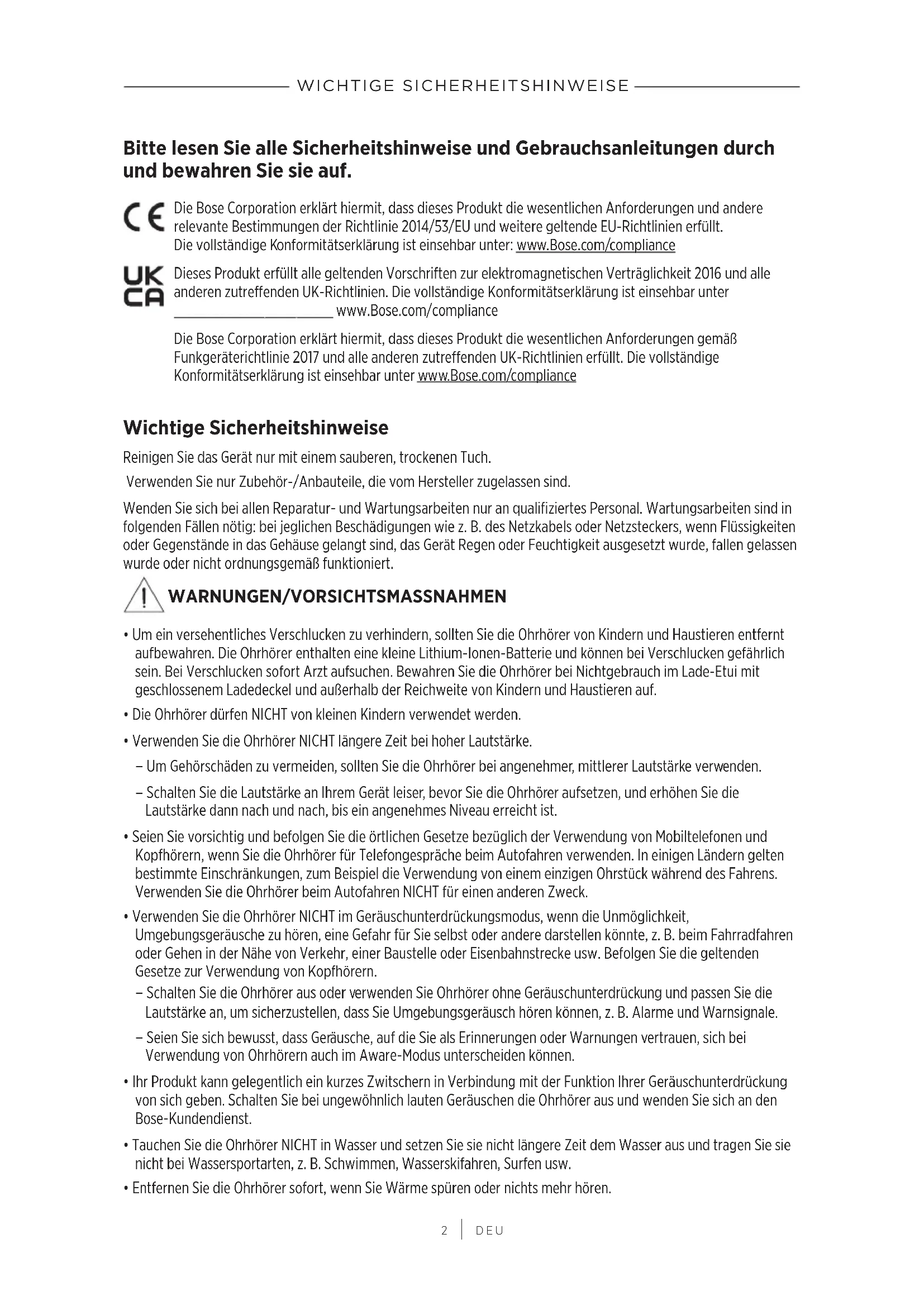 Die Bose Corporation erklart hiermit, dass these Produkt die wesentlichen Anforderungen und andere relevante Bestimmungen der Richtlinie 2014/53/EU und weitere geltende EU-Richtlinien erfüllt. Die vollständige Konformitätserklärung ist einsebar unter: www.Bose.com/compliance