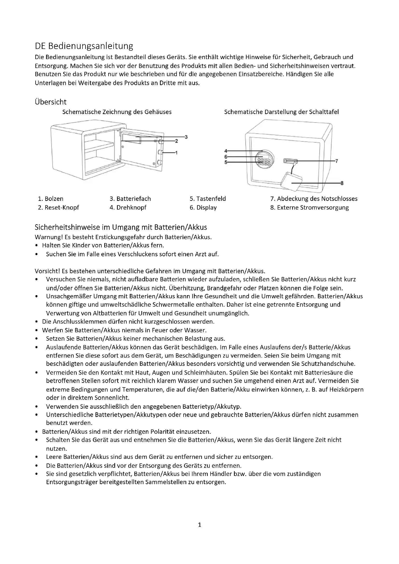 - Sie sind gesetzlich verpflichtet, Batterien/Akkus bei Ihrem Händler bzw. über die vom zuständigen Entsorgungsträger bereitgestellten Sammelstellen zu entsorgen.2 Verpackungsinhalt Prüfen Sie den Verpackungsinhalt des Tresors, bevor Sie den Tresor verwenden. Sollte etwas fehlen oder beschädigt sein, wenden Sie sich an unseren Service.